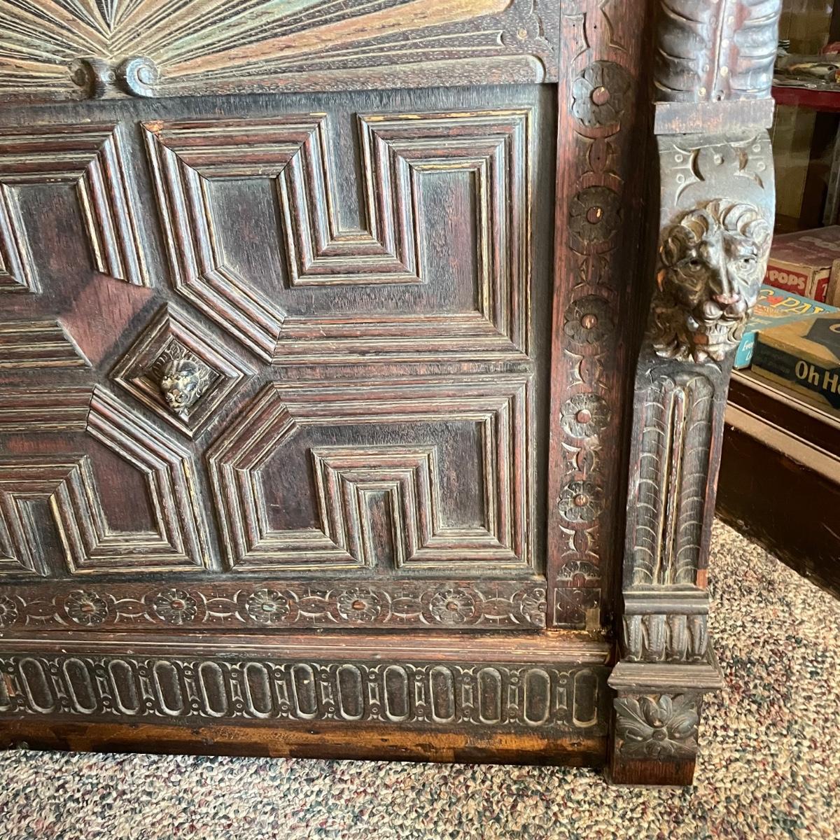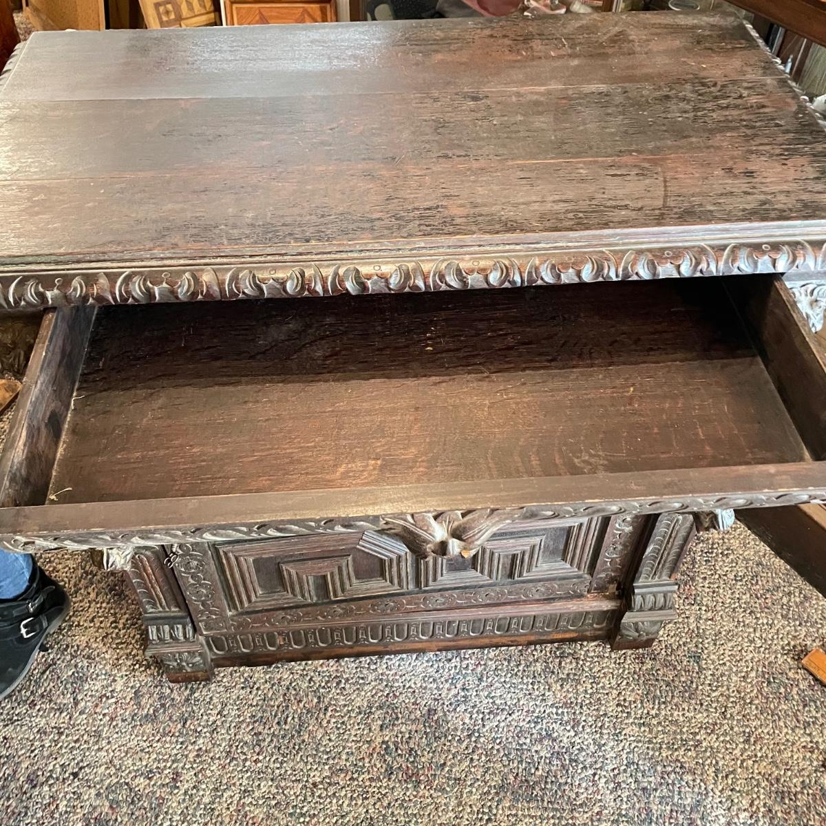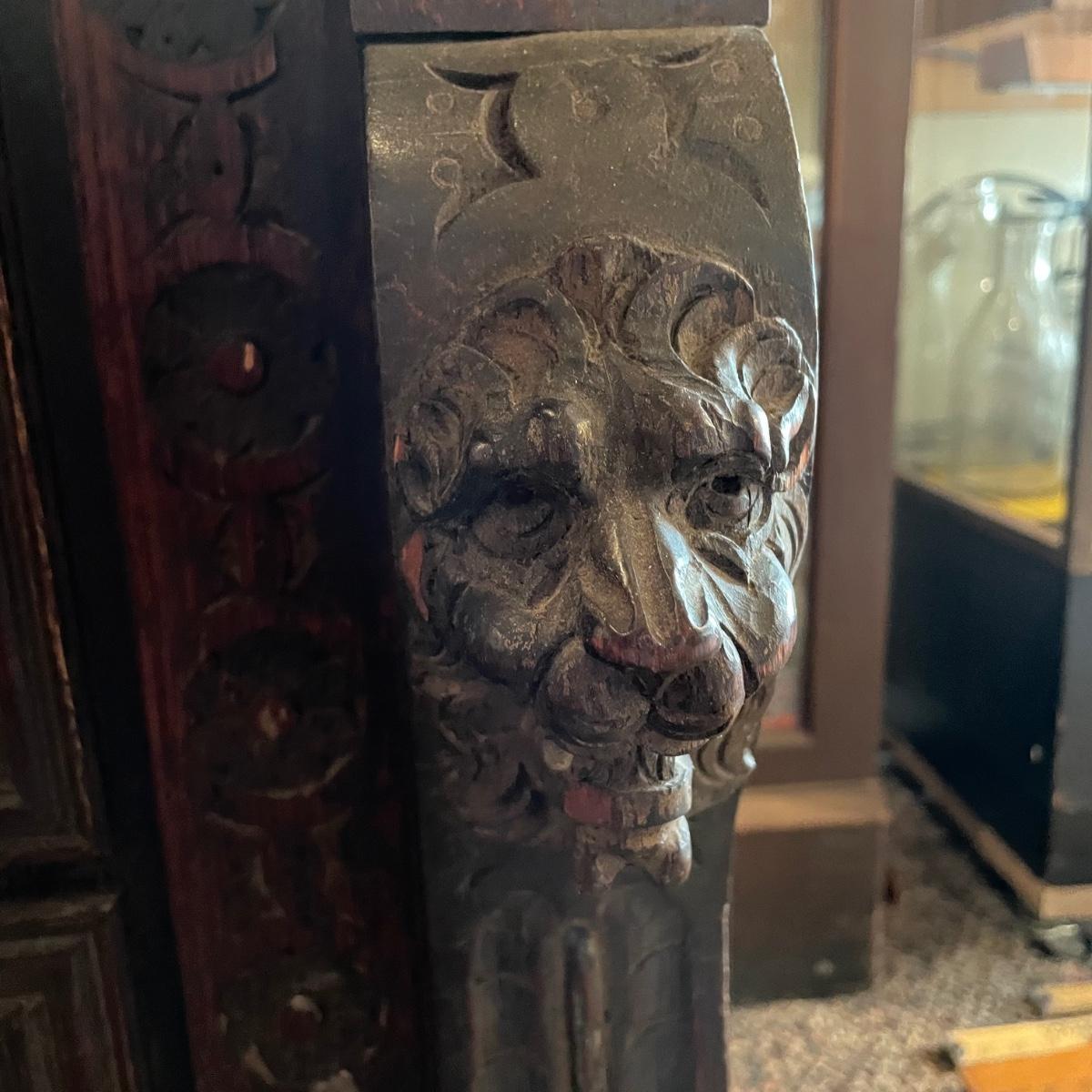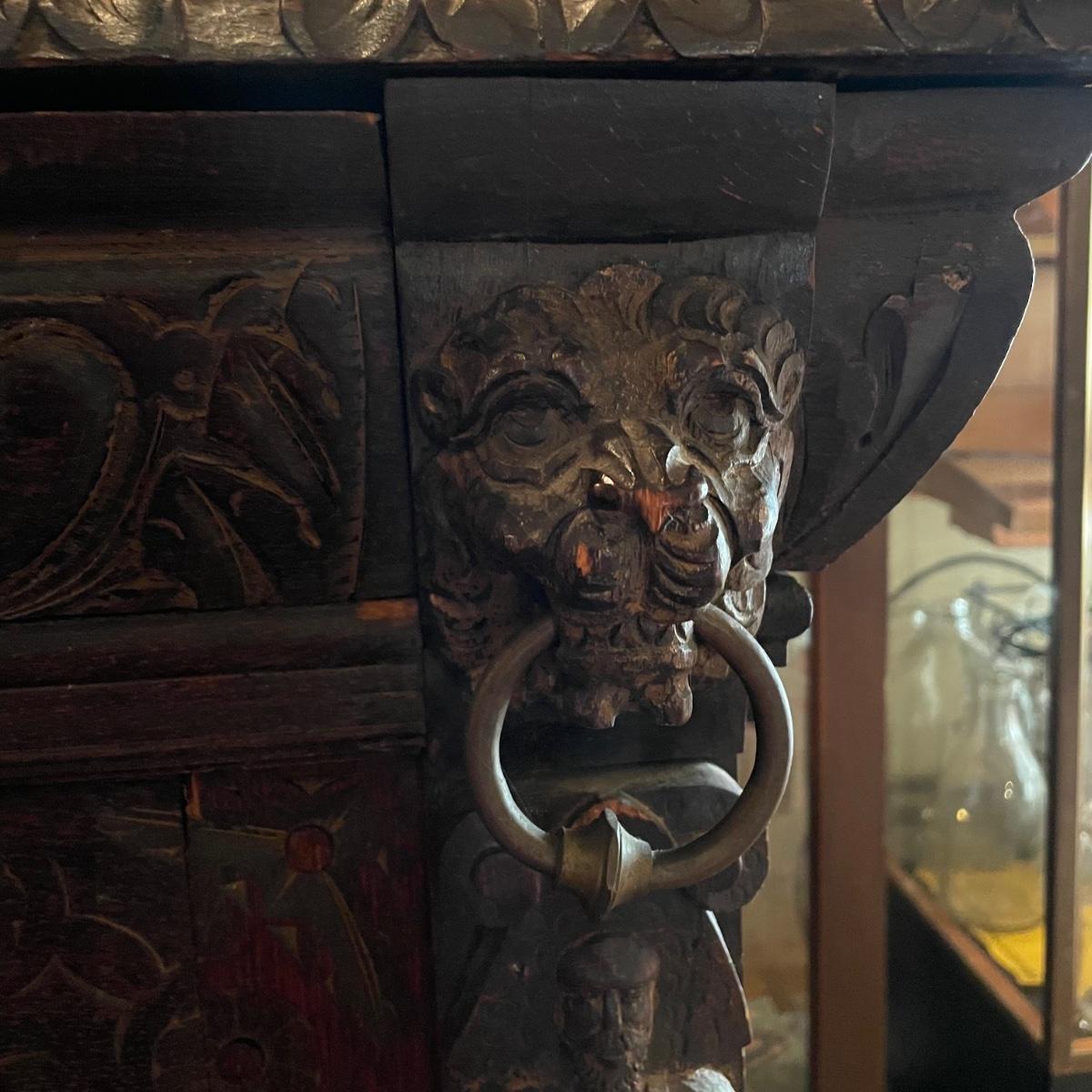 Antique Victorian carved oak hall cabinet appears to be from the late 19th century. Piece has carved moulding with one long dovetail drawer and an intricate carved cabinet door. Sides each have two Lion heads one each with brass pulls. Cabinet door has a key, but key is currently fixed in place and doesn’t appear to operate the lock. It is unclear if a lubricant would quickly fix. The top of the cabinet door has a muted colorful carving. Piece has minor chips and blemishes, but it’s in amazing condition for its age. Cabinet measures approximately 37.75” x 22” x 38.75”. See images. Please bring help to load. Local pick up only.