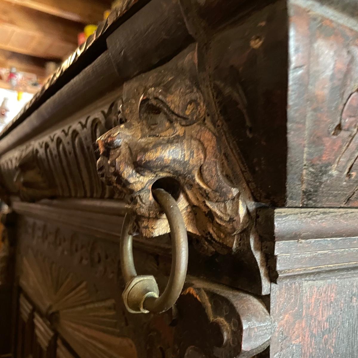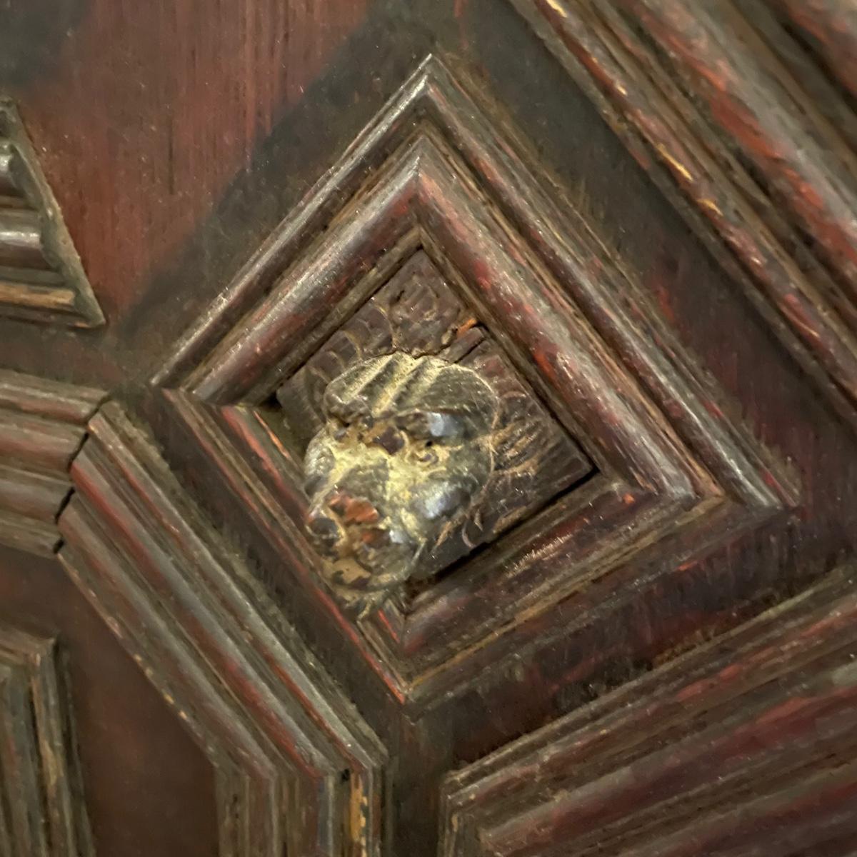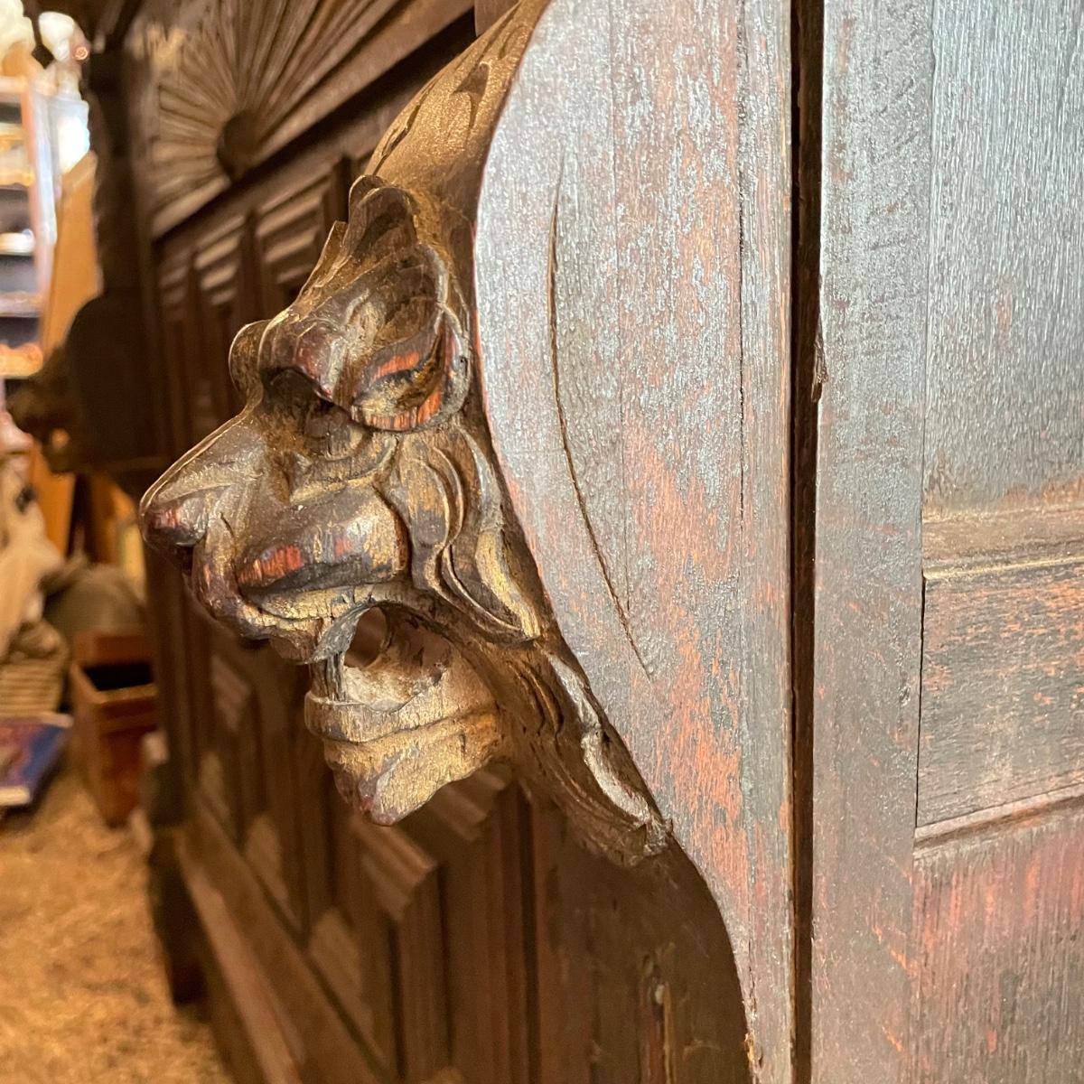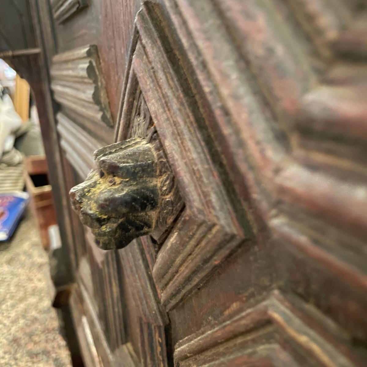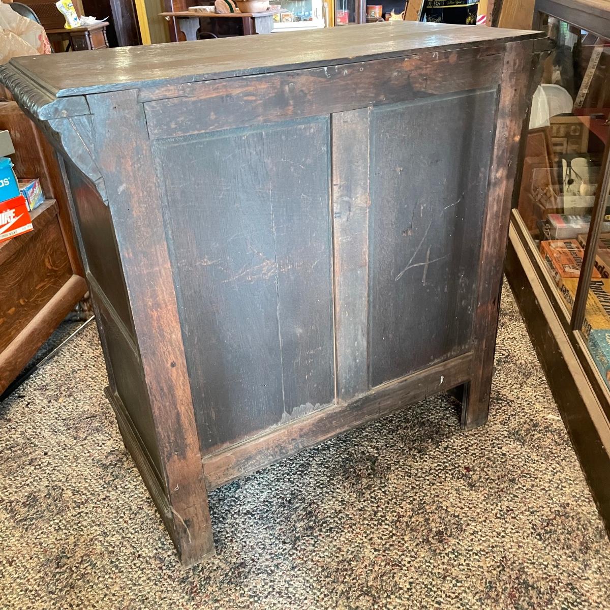 Antique Victorian carved oak hall cabinet appears to be from the late 19th century. Piece has carved moulding with one long dovetail drawer and an intricate carved cabinet door. Sides each have two Lion heads one each with brass pulls. Cabinet door has a key, but key is currently fixed in place and doesn’t appear to operate the lock. It is unclear if a lubricant would quickly fix. The top of the cabinet door has a muted colorful carving. Piece has minor chips and blemishes, but it’s in amazing condition for its age. Cabinet measures approximately 37.75” x 22” x 38.75”. See images. Please bring help to load. Local pick up only.