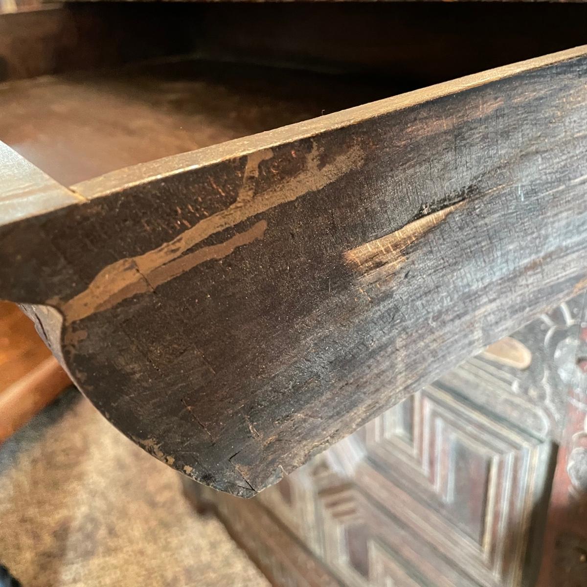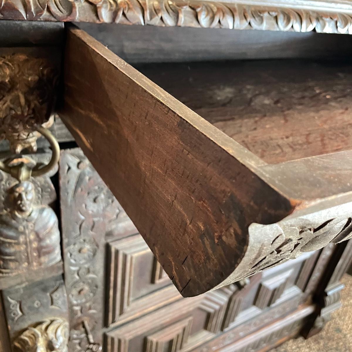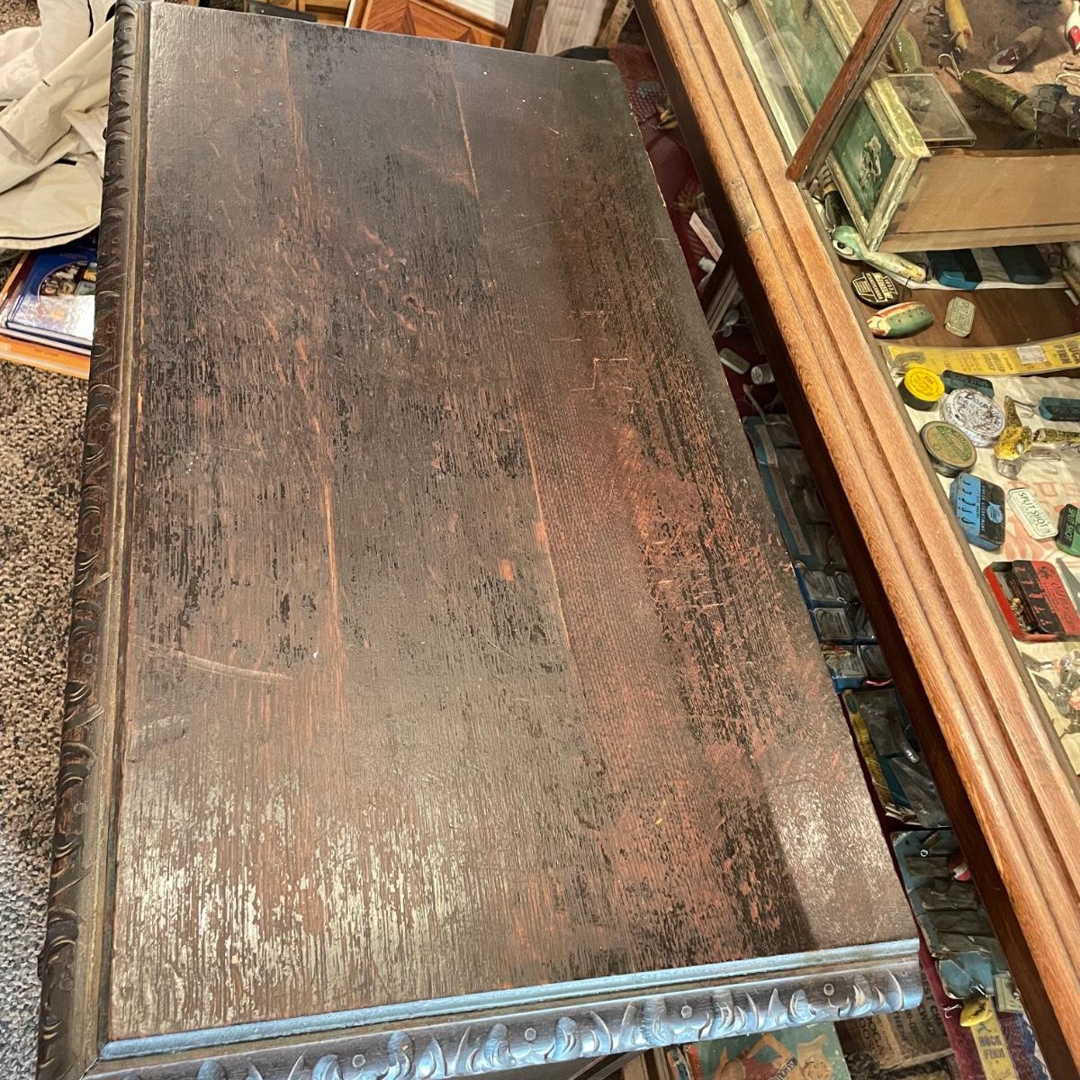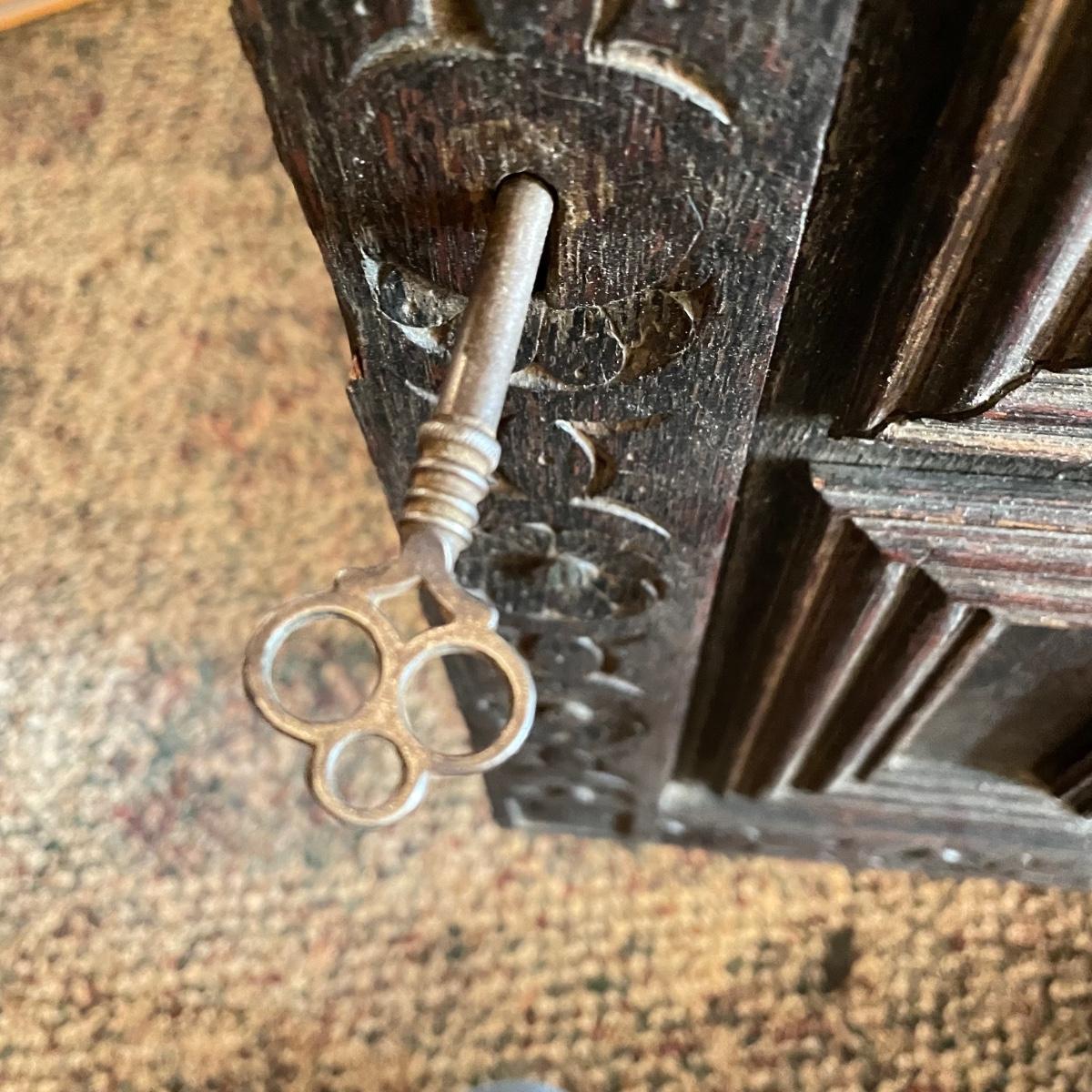 Antique Victorian carved oak hall cabinet appears to be from the late 19th century. Piece has carved moulding with one long dovetail drawer and an intricate carved cabinet door. Sides each have two Lion heads one each with brass pulls. Cabinet door has a key, but key is currently fixed in place and doesn’t appear to operate the lock. It is unclear if a lubricant would quickly fix. The top of the cabinet door has a muted colorful carving. Piece has minor chips and blemishes, but it’s in amazing condition for its age. Cabinet measures approximately 37.75” x 22” x 38.75”. See images. Please bring help to load. Local pick up only.