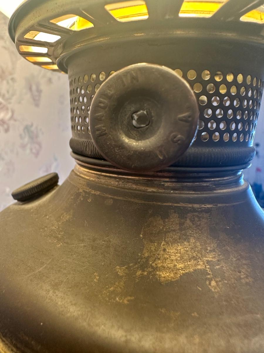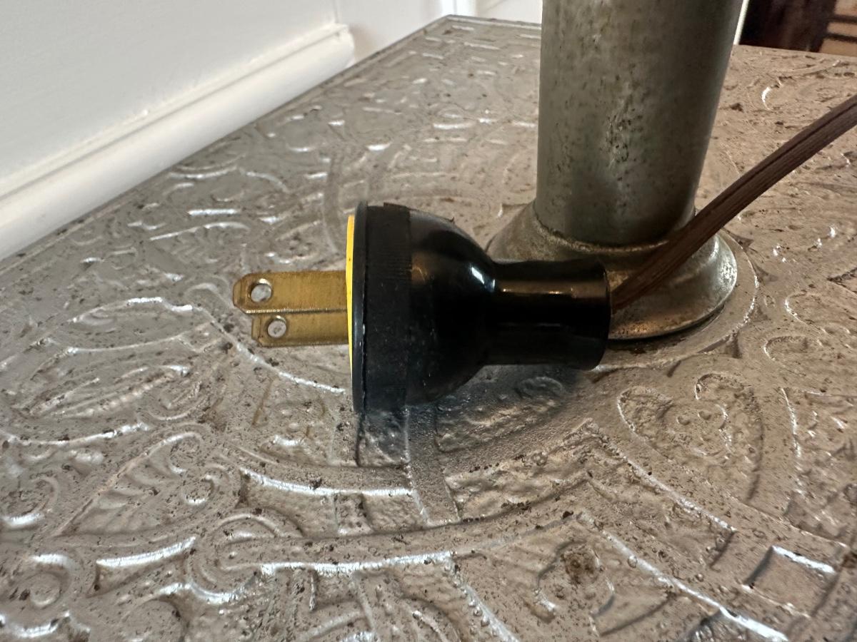 Antique cast metal floor lamp with adjustable column and integrated side table. Marked “Made in USA.” Electrified. Surface wear consistent with age and use.