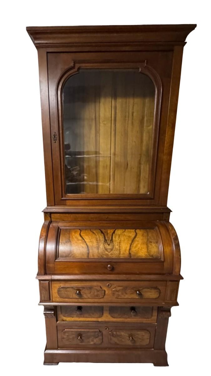 Two piece design featuring a bookcase on top. The lower portion features the cylinder roll. It is most likely made from walnut, with a possible veneer. There is age related wear, including one missing section of moulding on the top right side. Measurement: 82”H x 32”W x 22”D. [MA]