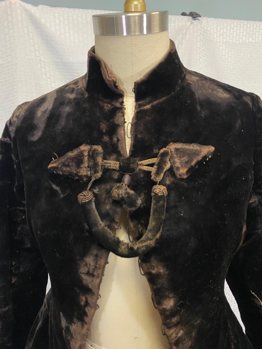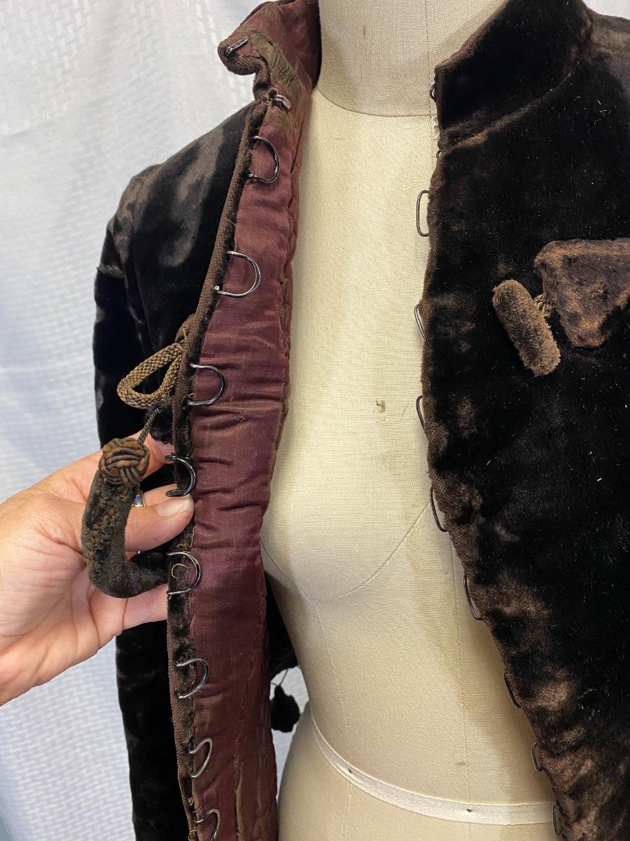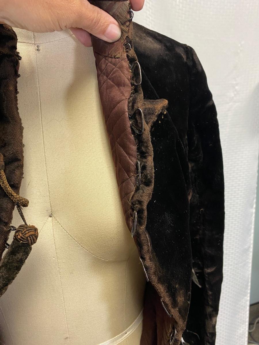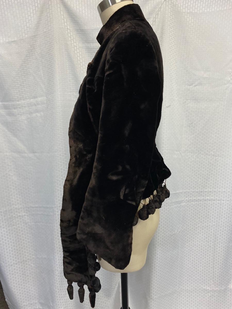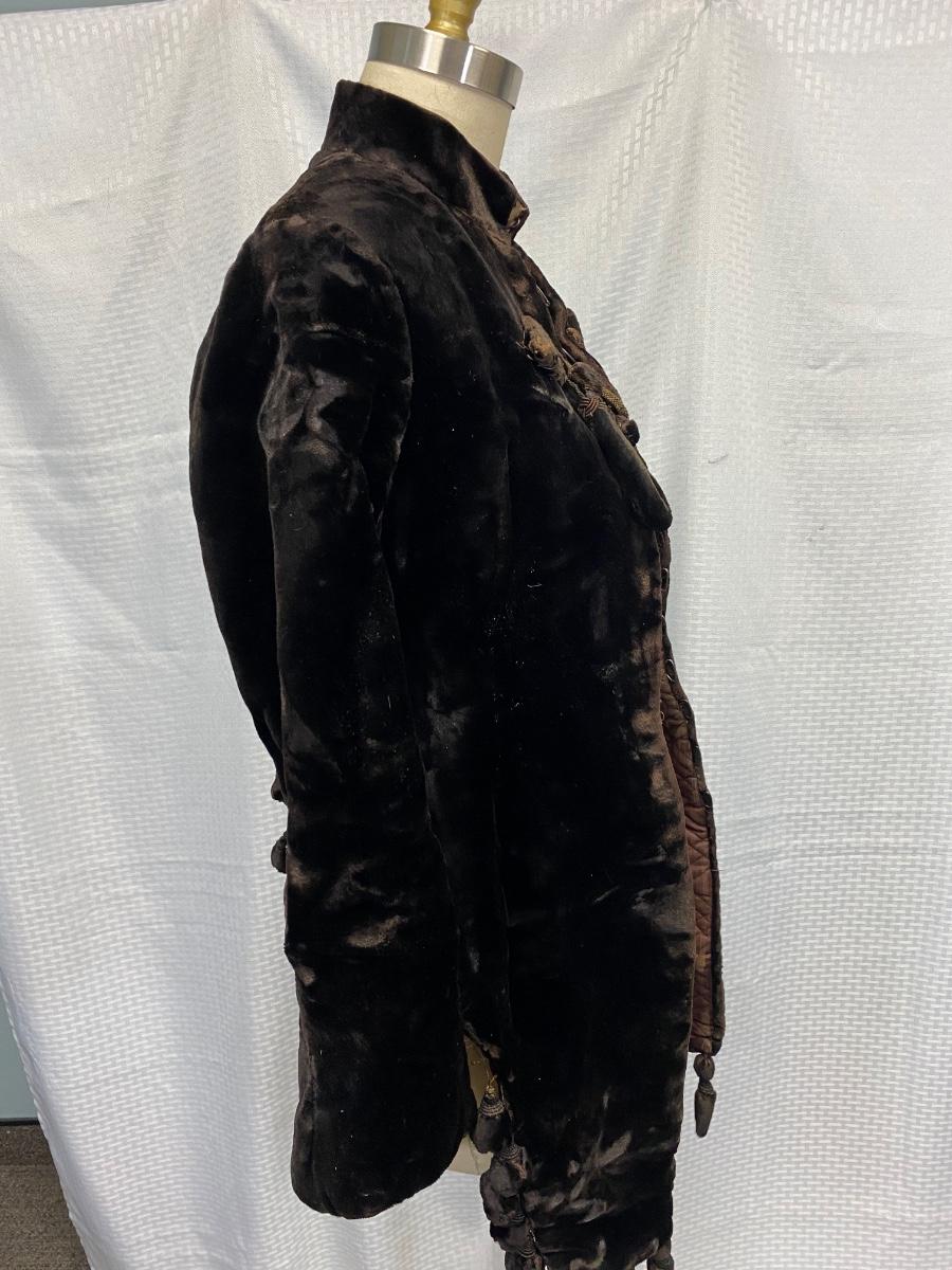 Antique Victorian Dark Brown Black Velvet Fitted Coat Jacket. In used antique condition. Tightly fitted hook and eye closure all the way down the front, mannequin is size 8 and the waistline was too big for coat. Heavy weight has a basketweave inner lining for warmth and structure. Overall good condition, needs a little repair here and there, lining is thin and make tear if not handled gently.