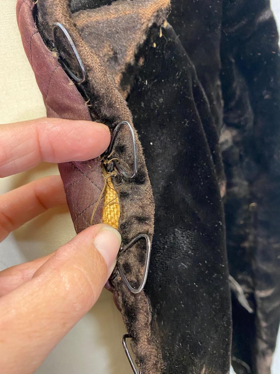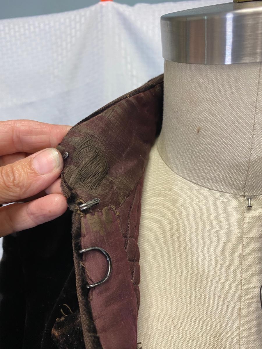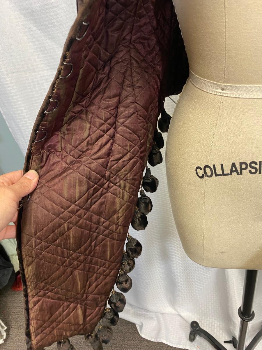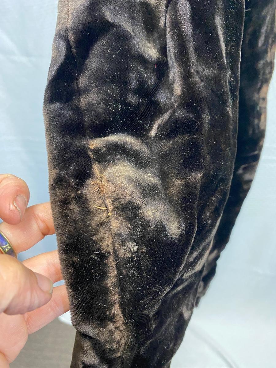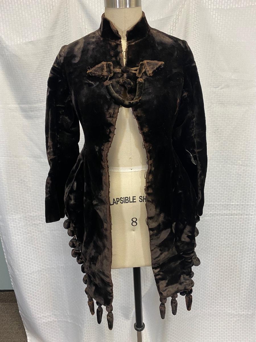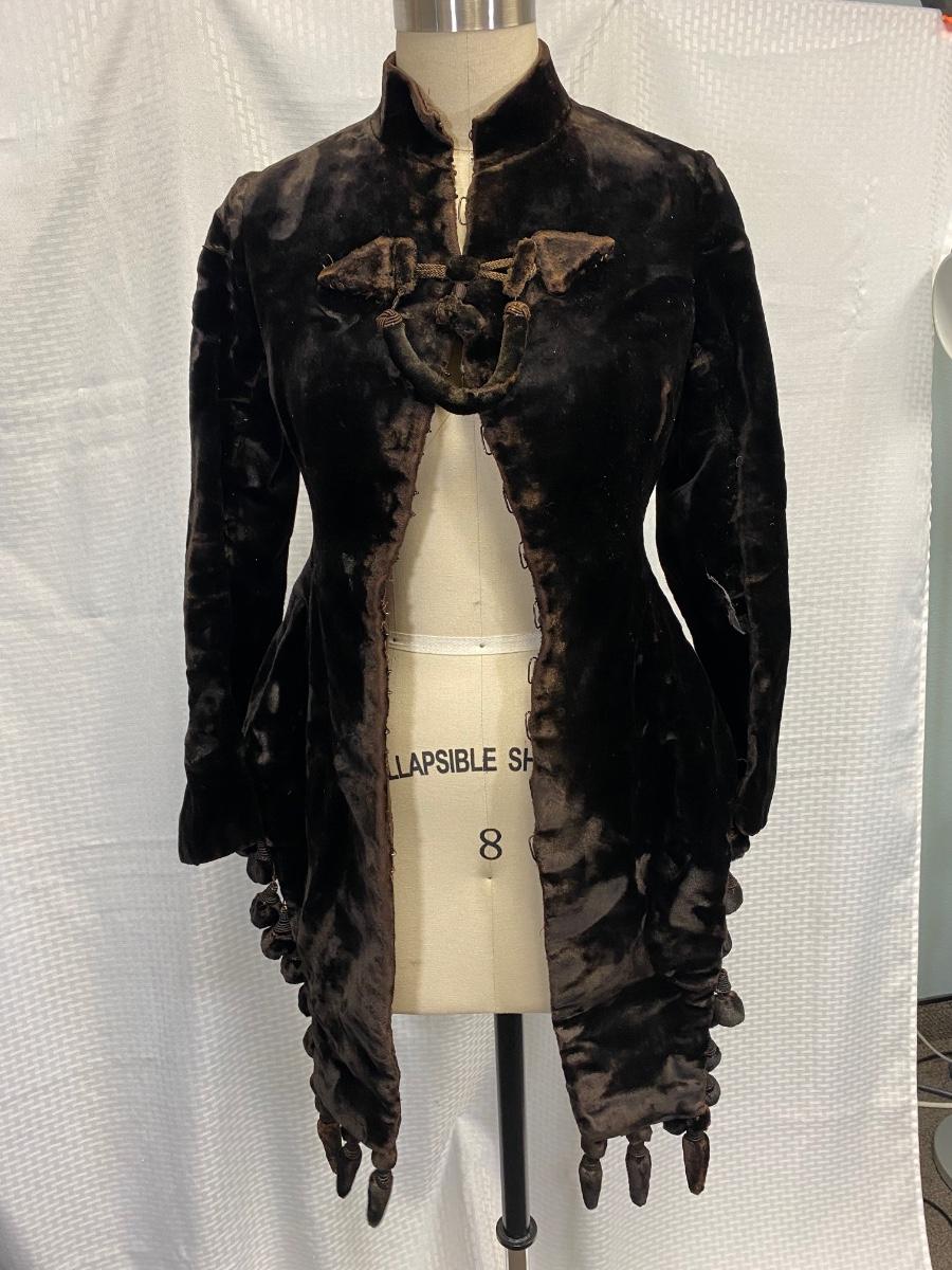 Antique Victorian Dark Brown Black Velvet Fitted Coat Jacket. In used antique condition. Tightly fitted hook and eye closure all the way down the front, mannequin is size 8 and the waistline was too big for coat. Heavy weight has a basketweave inner lining for warmth and structure. Overall good condition, needs a little repair here and there, lining is thin and make tear if not handled gently.