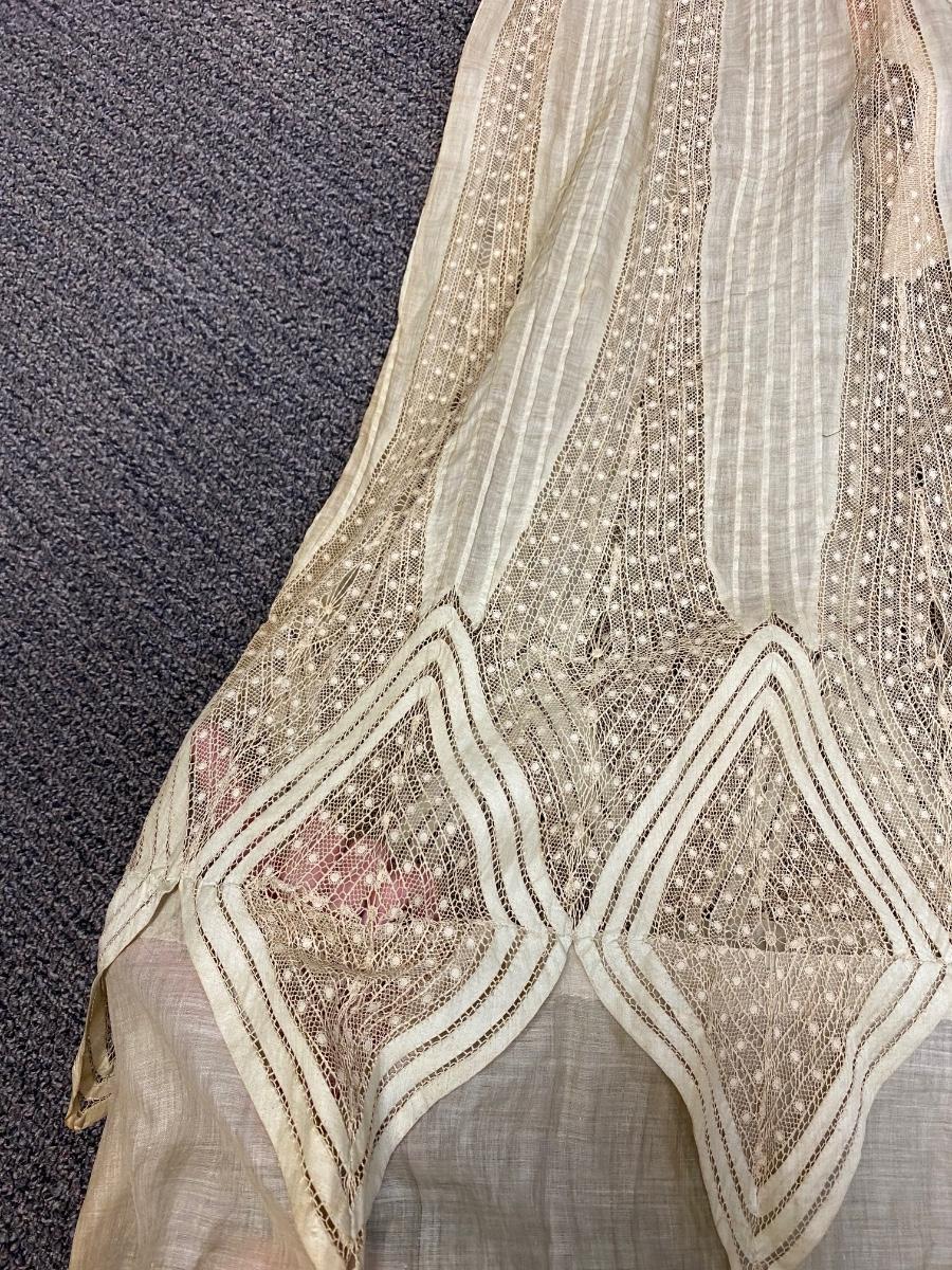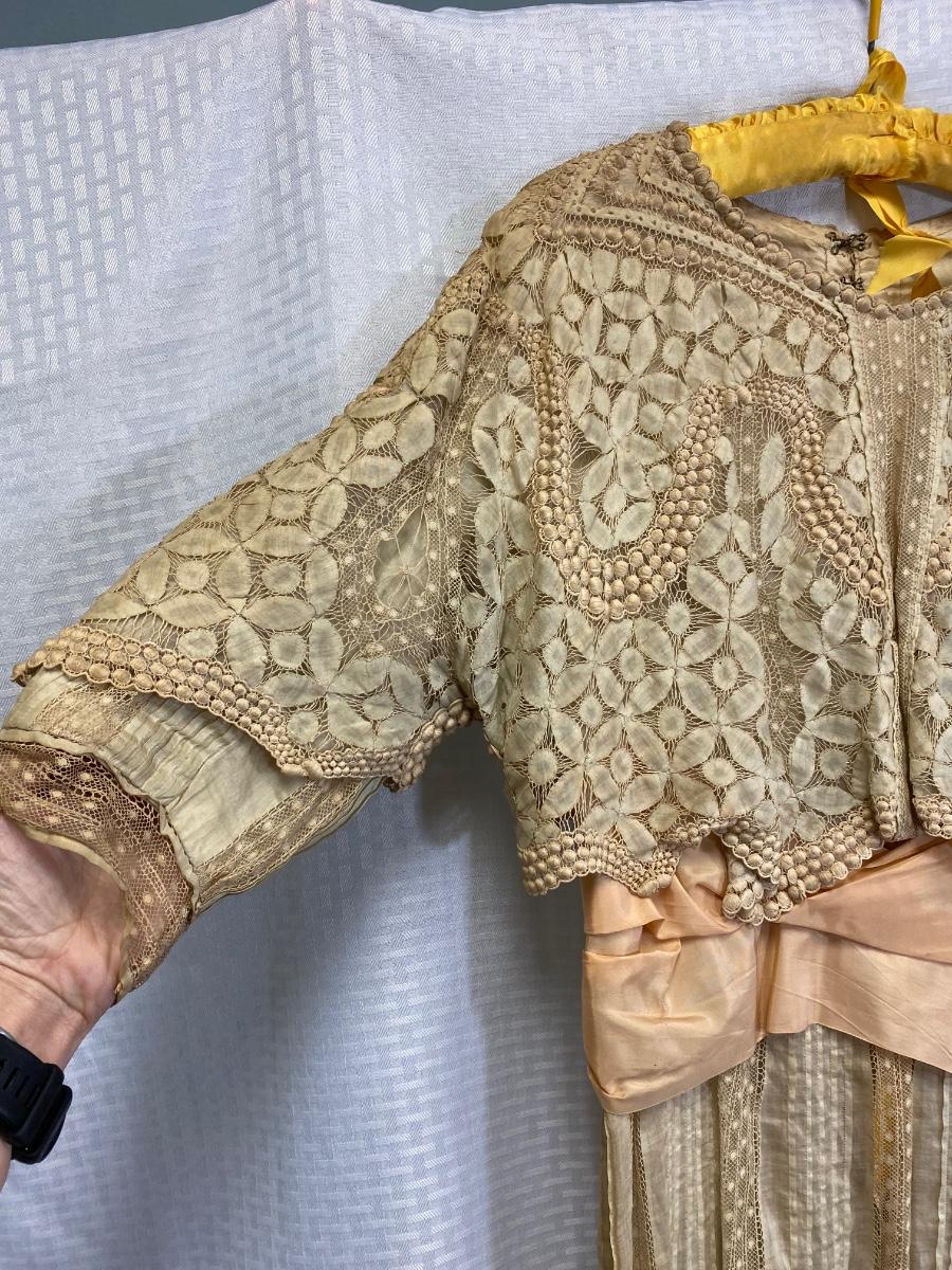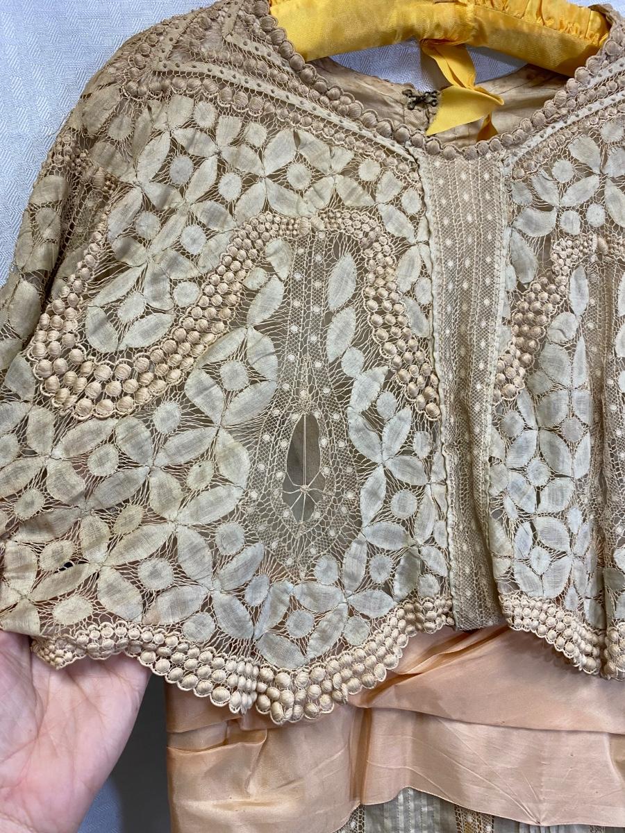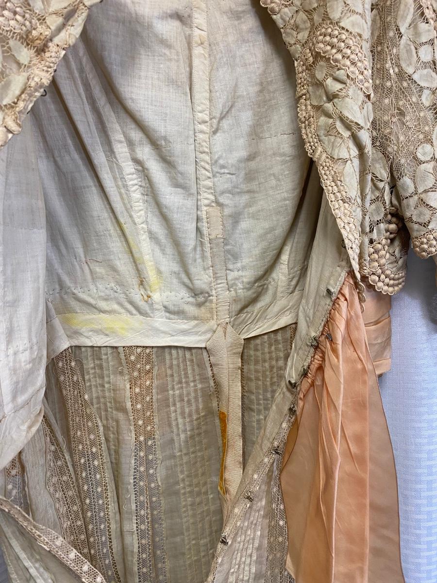 Antique Victorian Edwardian Cotton Lace Dress Prairie Boho Romantic. Authentic turn of the century dress. In overall good condition. It does have discolor normal with age. No serious spots or stains, no holes found. Beautiful, patterned lace. Peach pink sash. Light lining in the bodice. Hook and eye closure. Tag on inside belt says Fairall & Co Hong Kong. Has potential for wear. Measurements in photos, similar to a size 8.