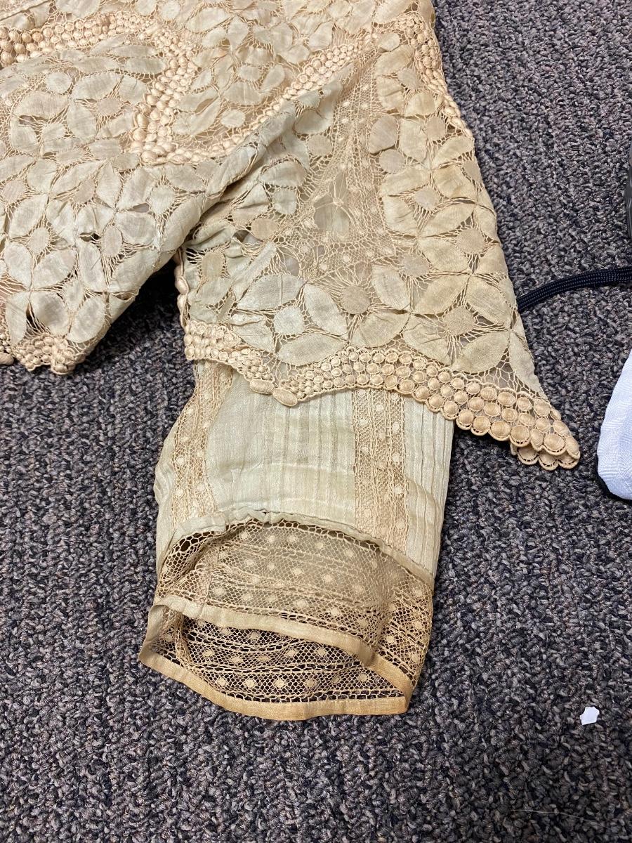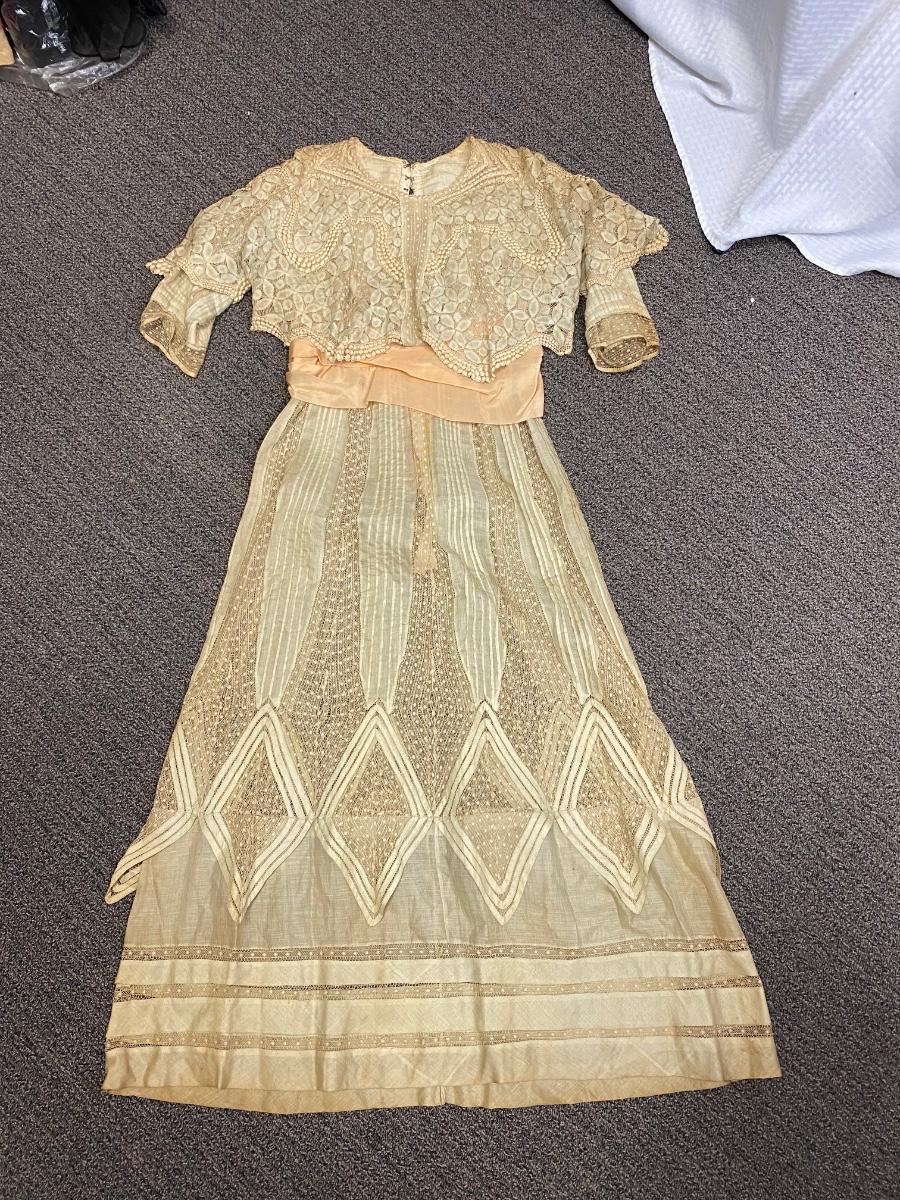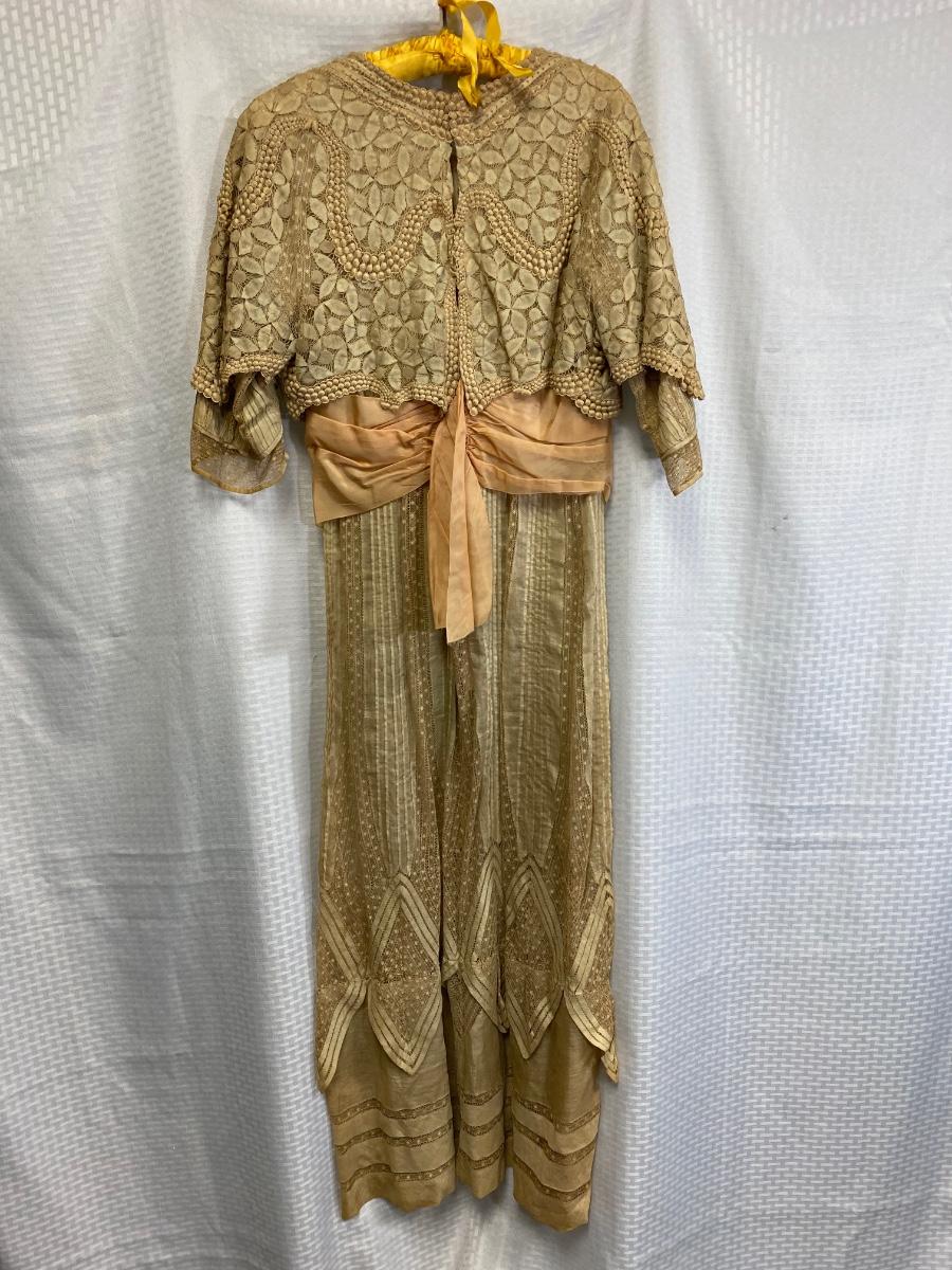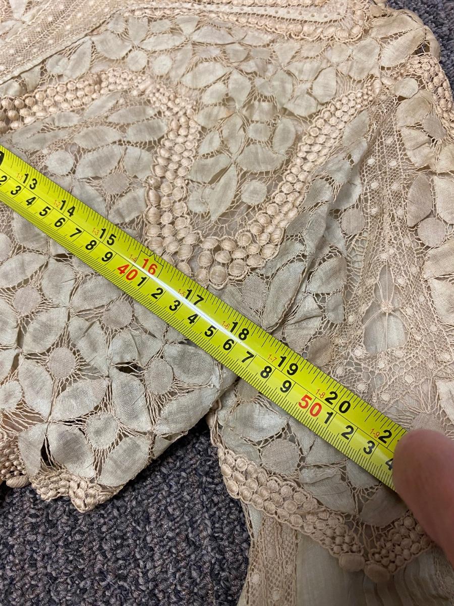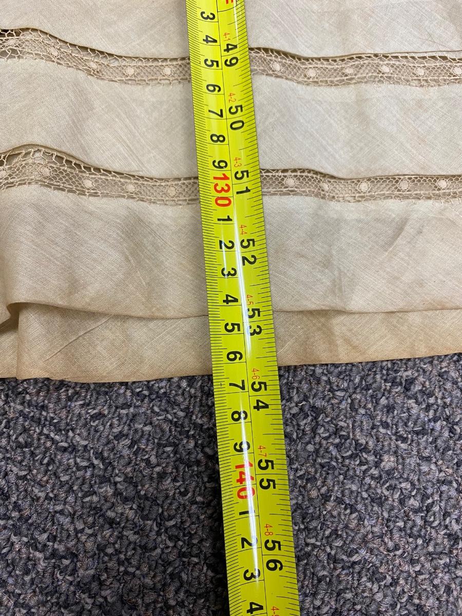 Antique Victorian Edwardian Cotton Lace Dress Prairie Boho Romantic. Authentic turn of the century dress. In overall good condition. It does have discolor normal with age. No serious spots or stains, no holes found. Beautiful, patterned lace. Peach pink sash. Light lining in the bodice. Hook and eye closure. Tag on inside belt says Fairall & Co Hong Kong. Has potential for wear. Measurements in photos, similar to a size 8.