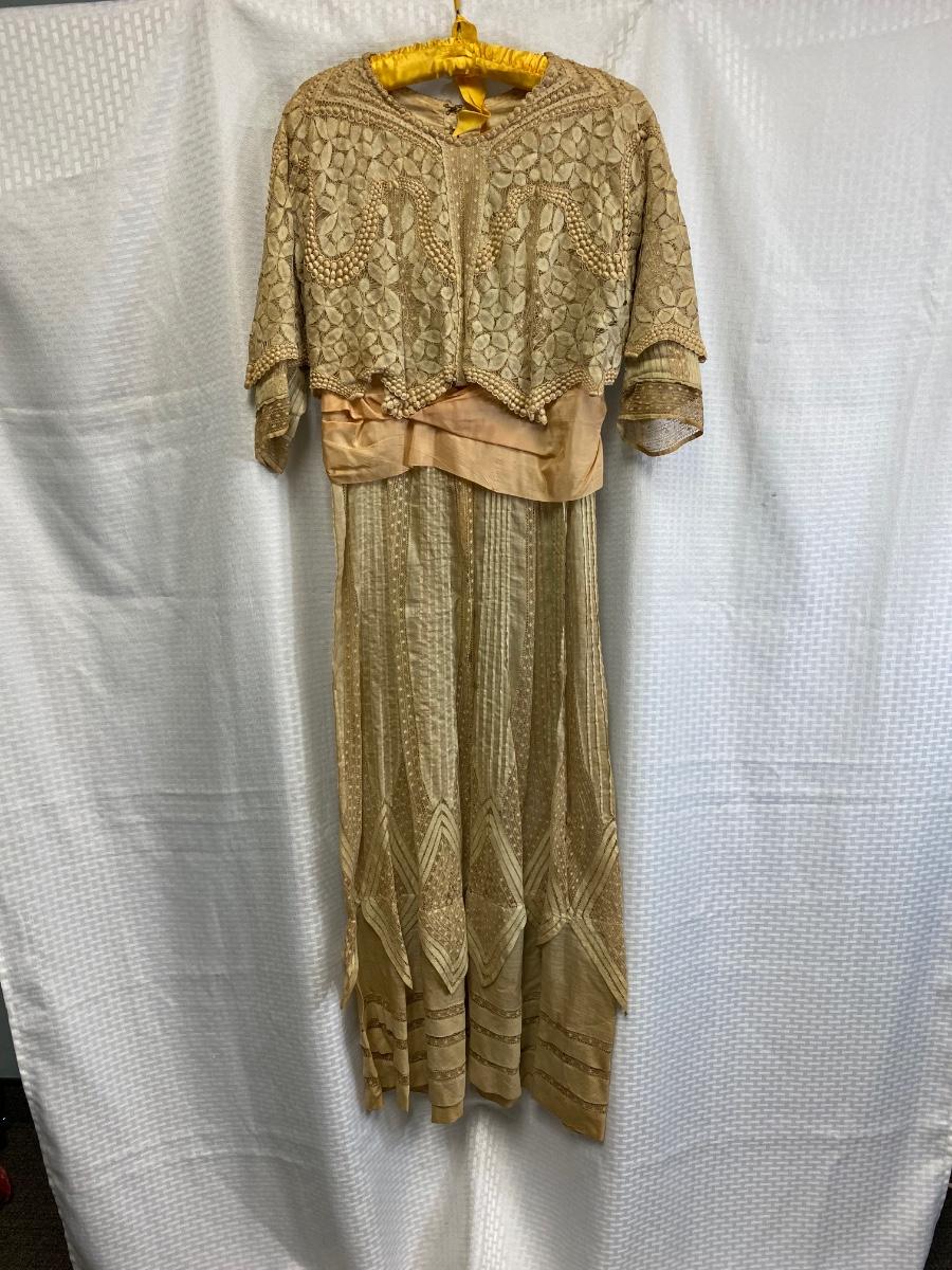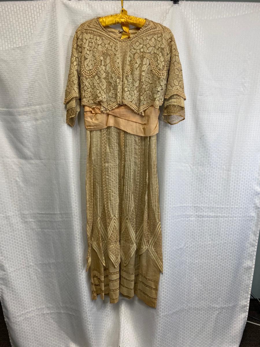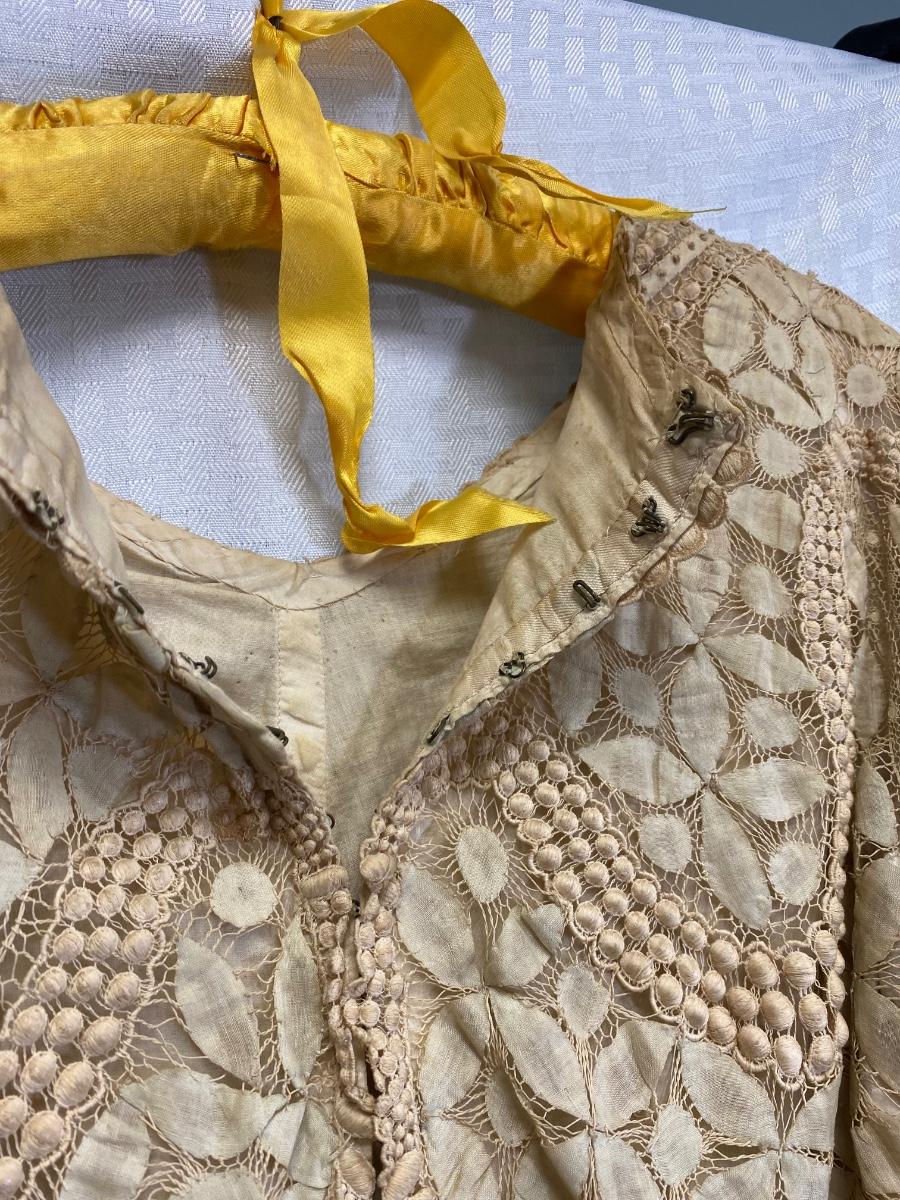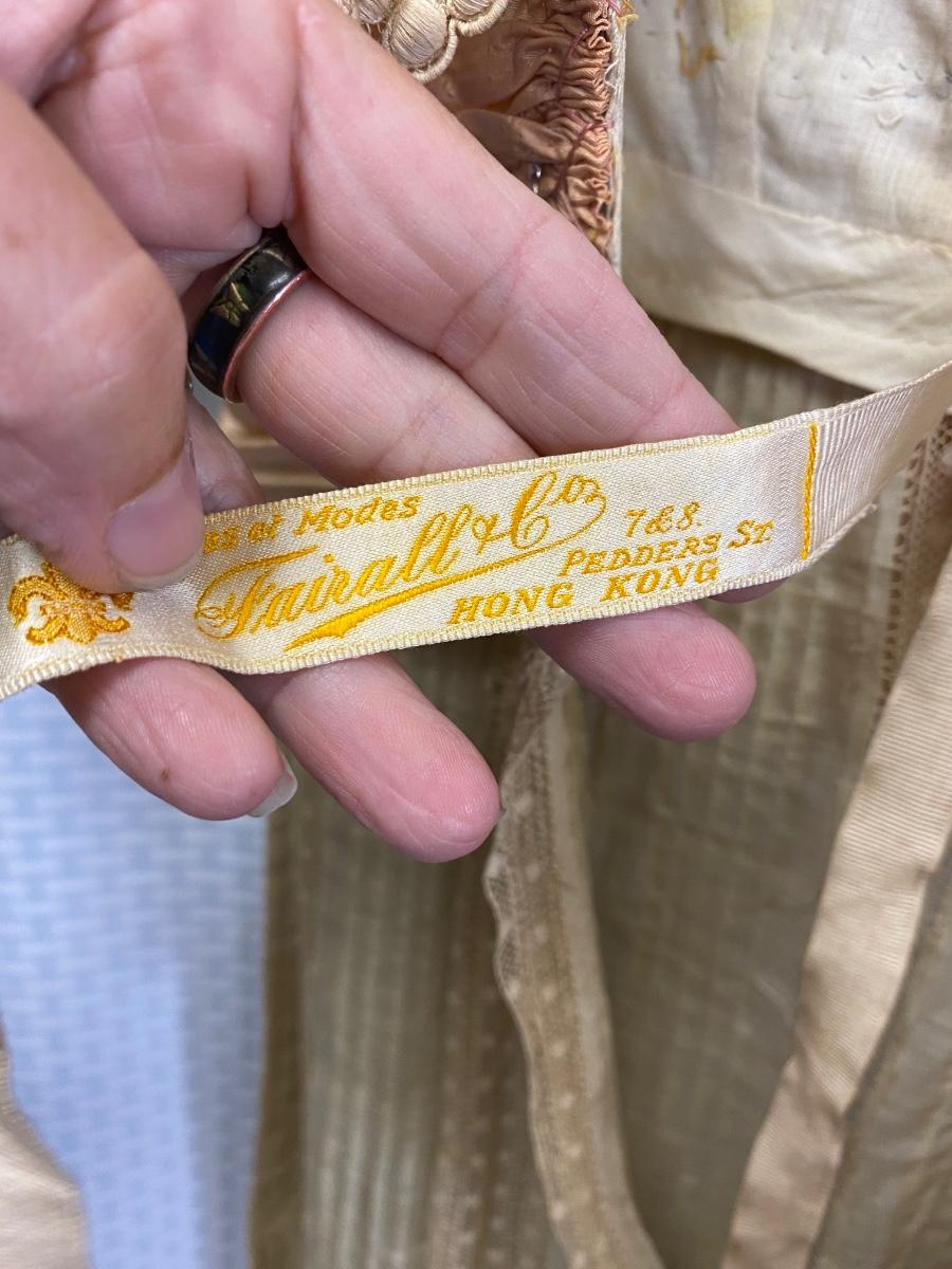 Antique Victorian Edwardian Cotton Lace Dress Prairie Boho Romantic. Authentic turn of the century dress. In overall good condition. It does have discolor normal with age. No serious spots or stains, no holes found. Beautiful, patterned lace. Peach pink sash. Light lining in the bodice. Hook and eye closure. Tag on inside belt says Fairall & Co Hong Kong. Has potential for wear. Measurements in photos, similar to a size 8.