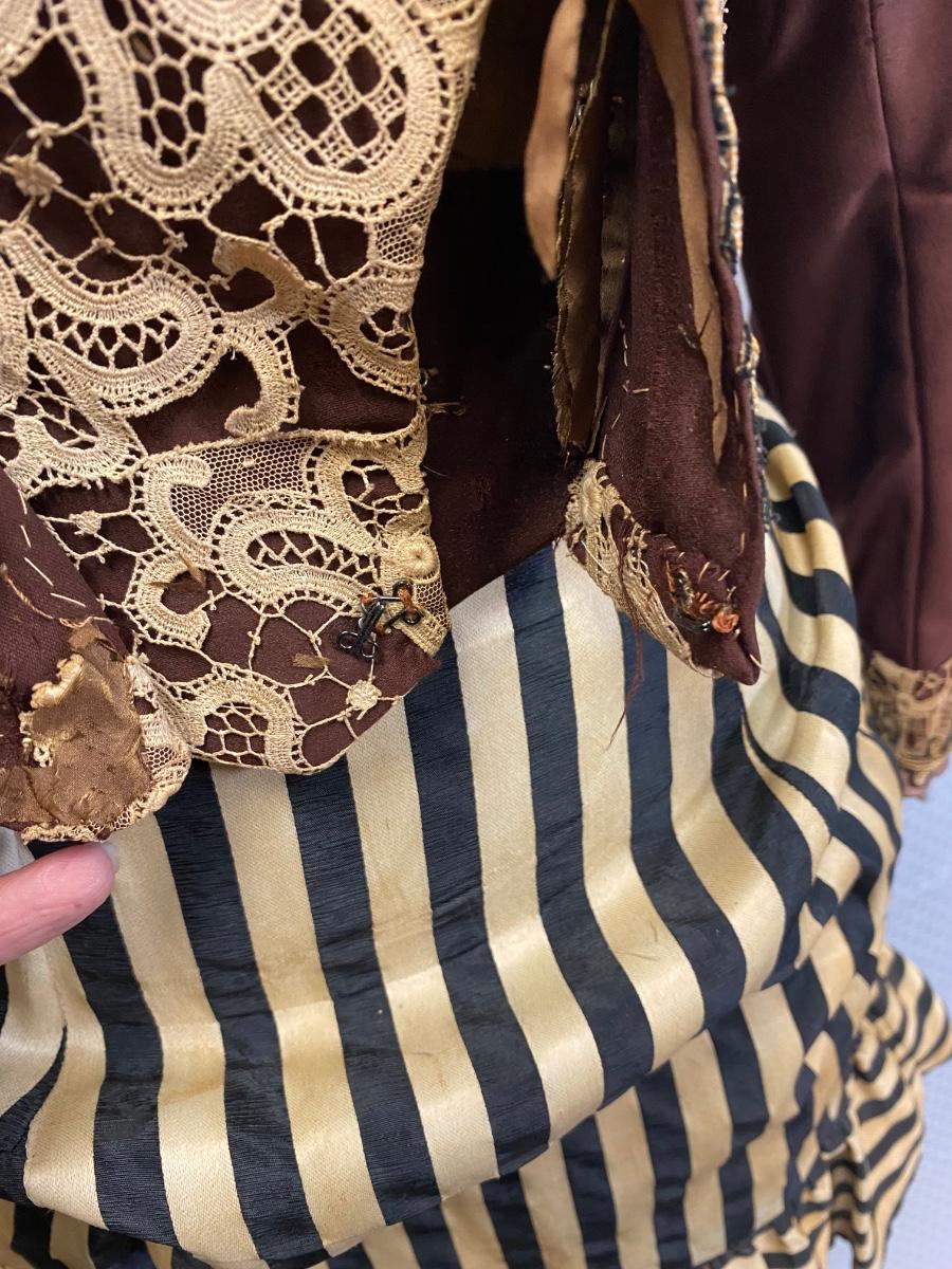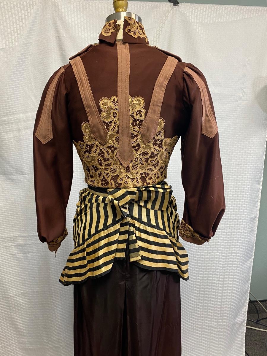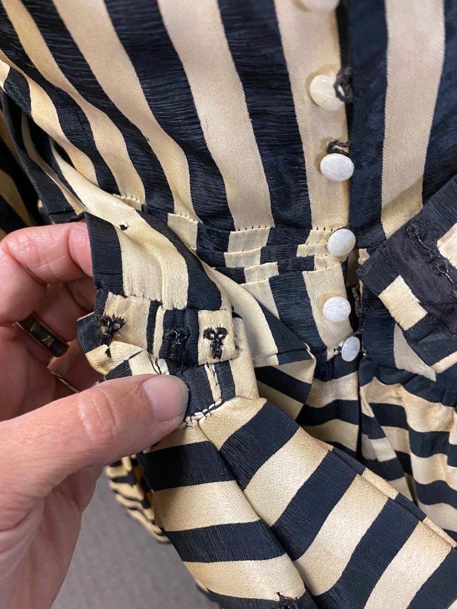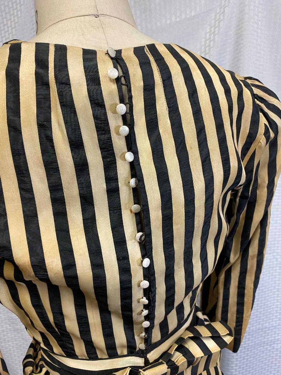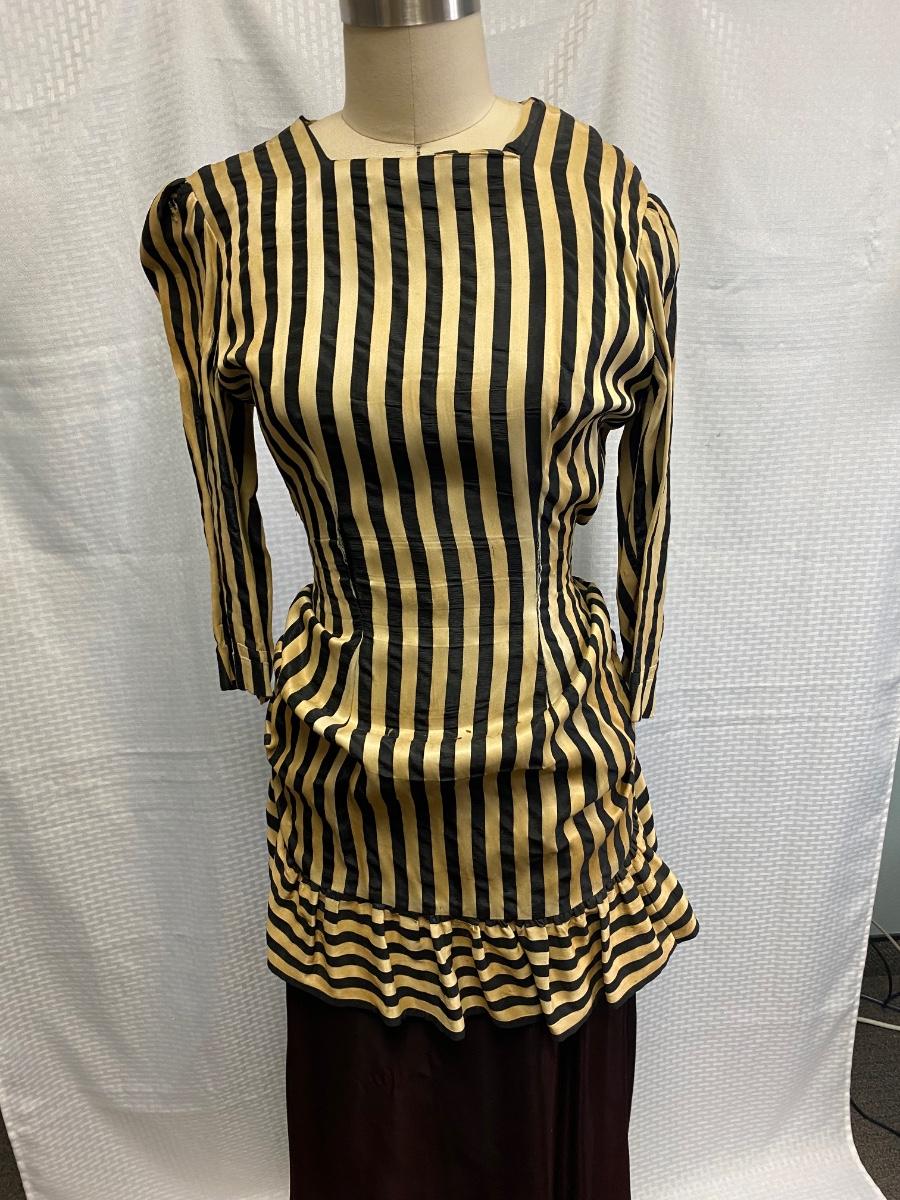Antique Victorian Edwardian Purple Black & White Three-Piece Dress Skirt Blouse Jacket. Dark plum skirt and jacket with a black & white striped blouse. Skirt is solid color but has discoloring near the bottom. Jacket has hook and eye closures with multiple layers, sewn in boning. Blouse has a gathered look to it to give a bit of curve to the wearer. There is discolor from age and a few hooks and eyes need to be replaced. Fabric is delicate and could tear easily if pulled on. Fit the size 8 mannequin mostly, the torso of coat is smaller than mannequin. Great time period piece, good for costume, reference, or pattern for reproduction.