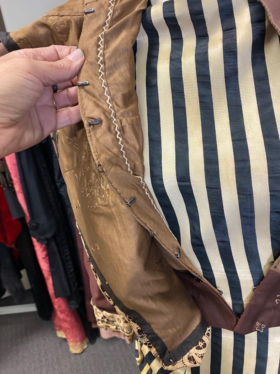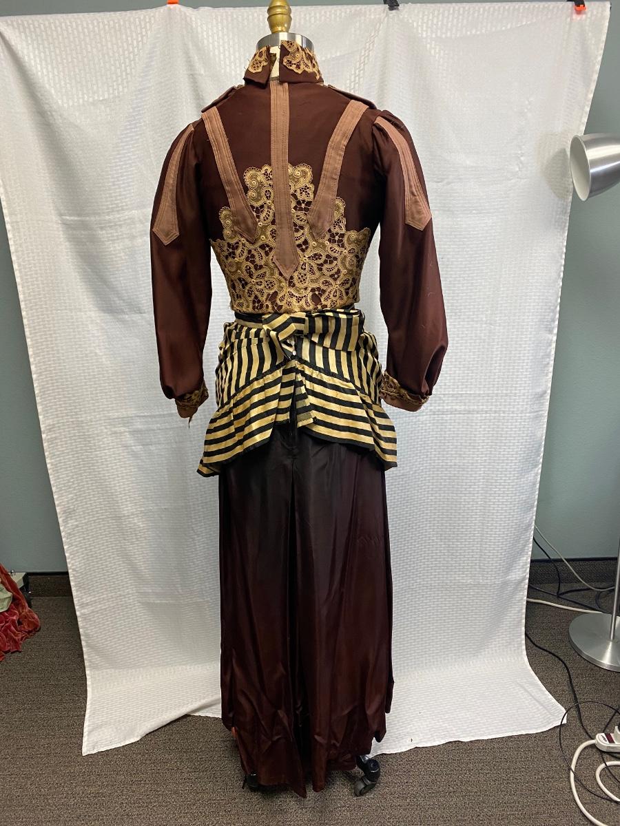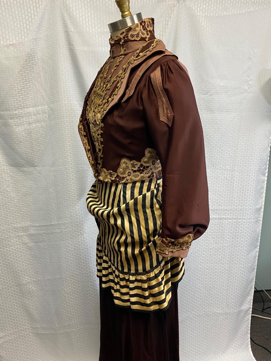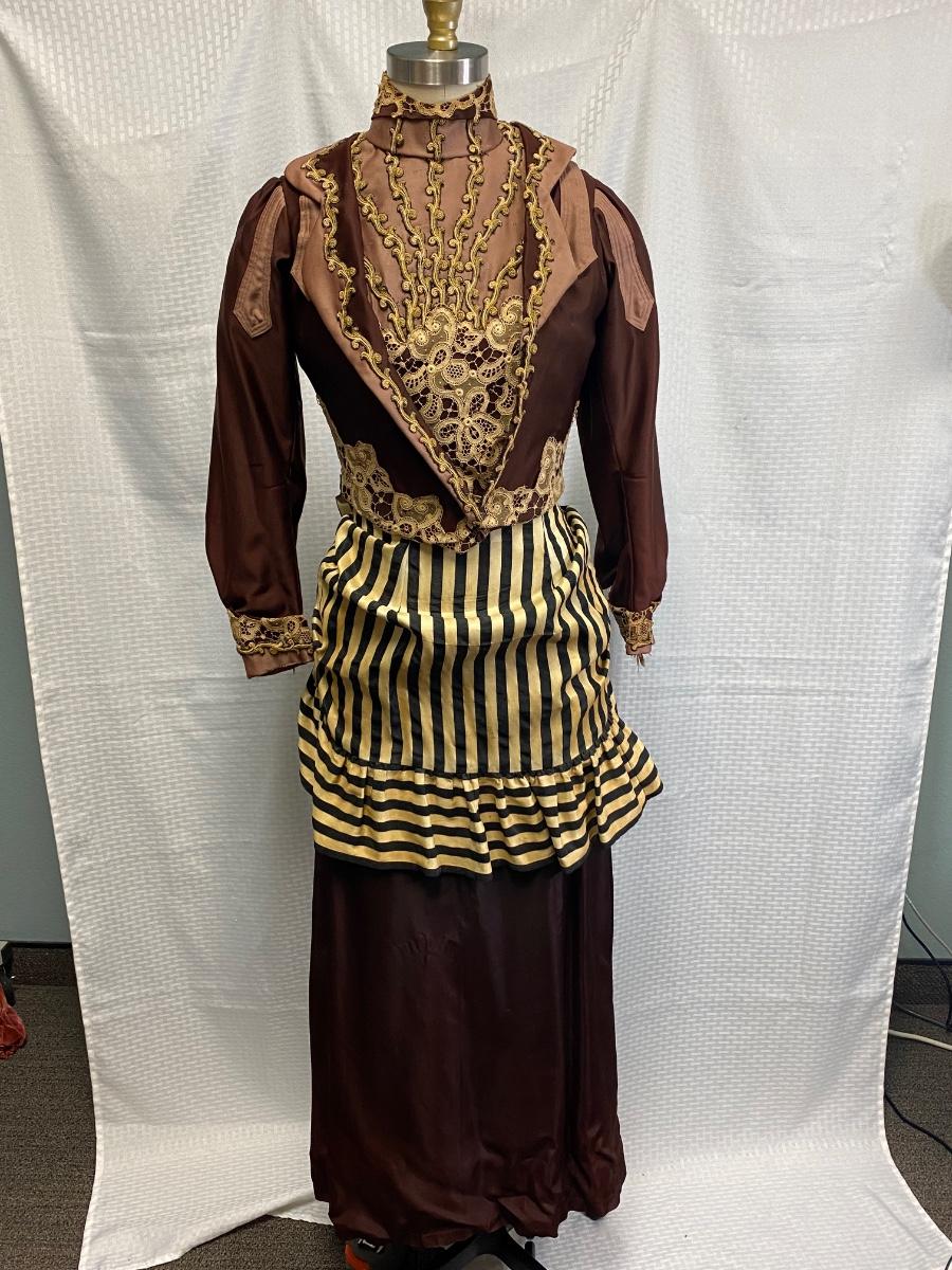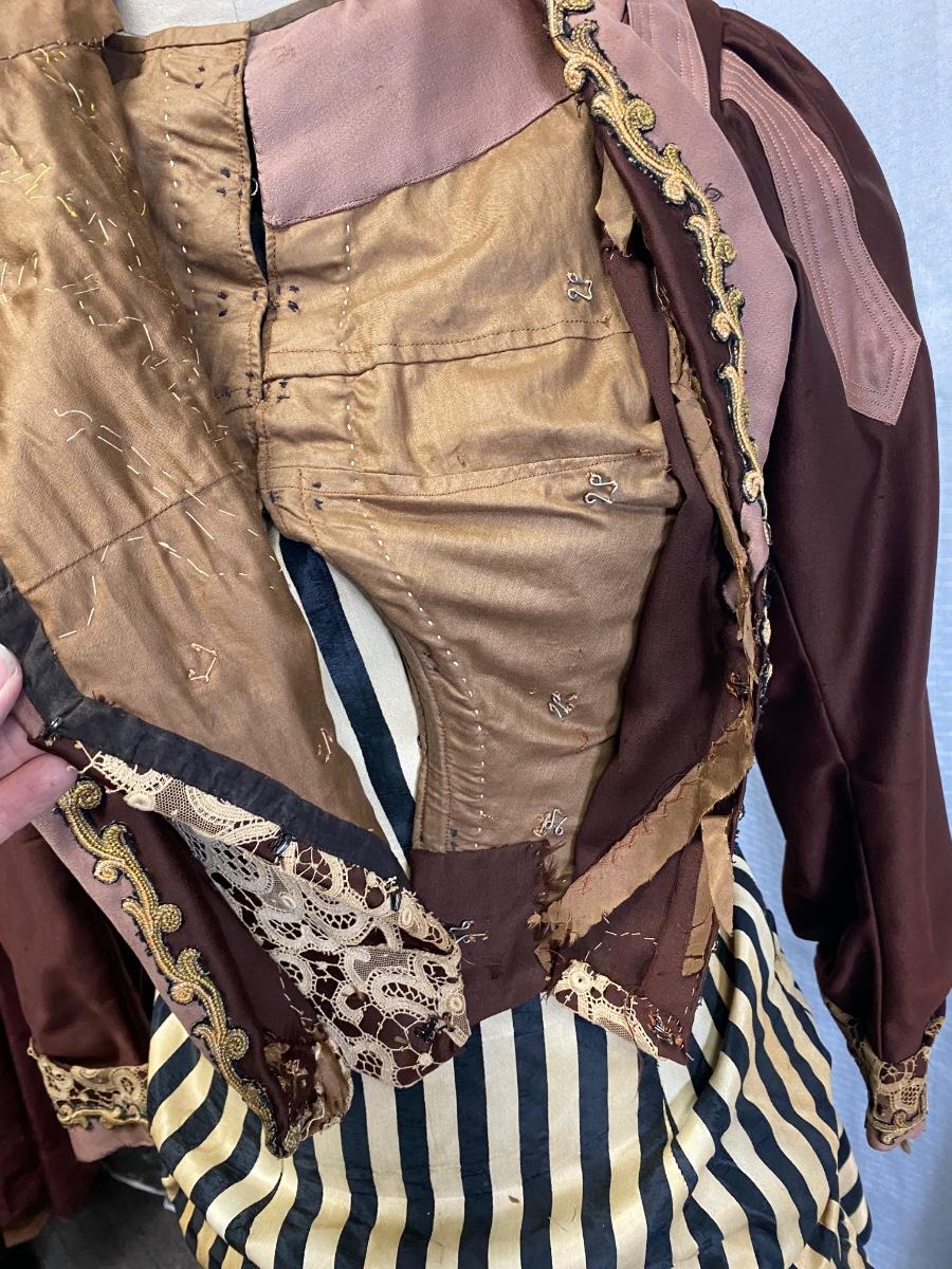 Antique Victorian Edwardian Purple Black & White Three-Piece Dress Skirt Blouse Jacket. Dark plum skirt and jacket with a black & white striped blouse. Skirt is solid color but has discoloring near the bottom. Jacket has hook and eye closures with multiple layers, sewn in boning. Blouse has a gathered look to it to give a bit of curve to the wearer. There is discolor from age and a few hooks and eyes need to be replaced. Fabric is delicate and could tear easily if pulled on. Fit the size 8 mannequin mostly, the torso of coat is smaller than mannequin. Great time period piece, good for costume, reference, or pattern for reproduction.