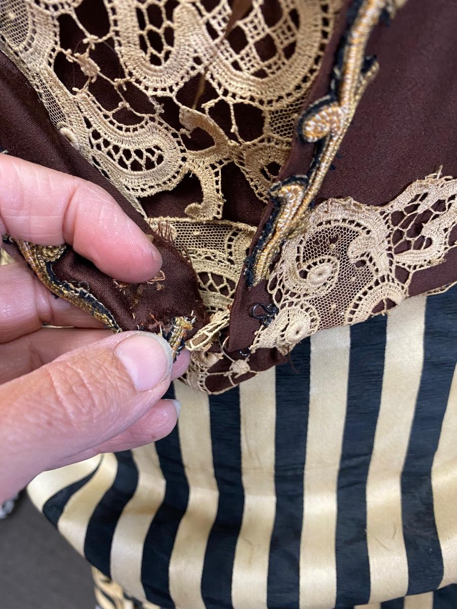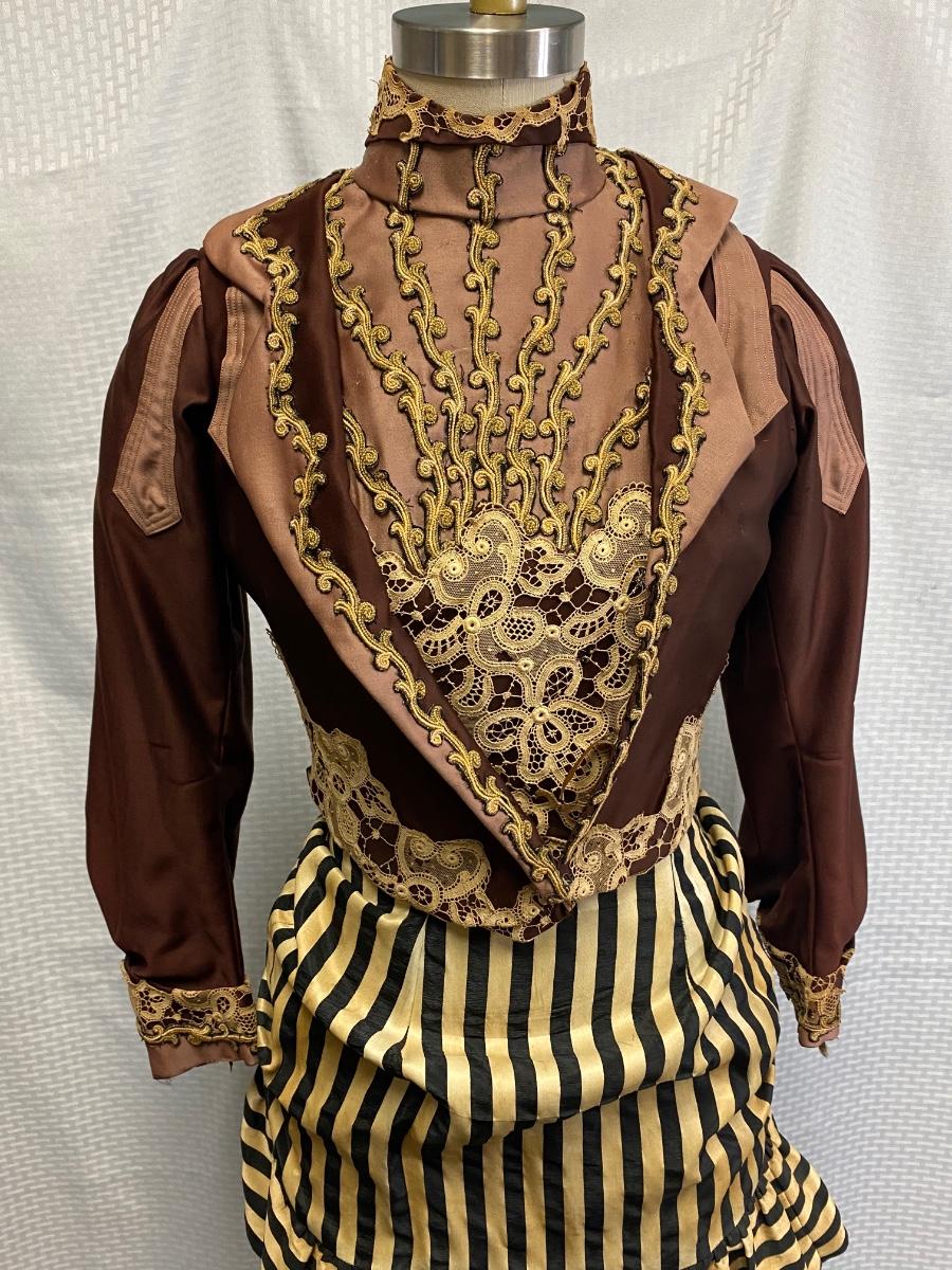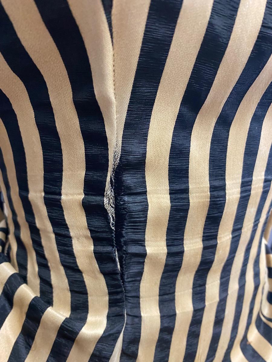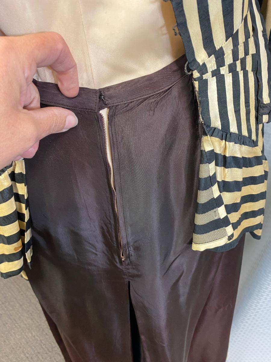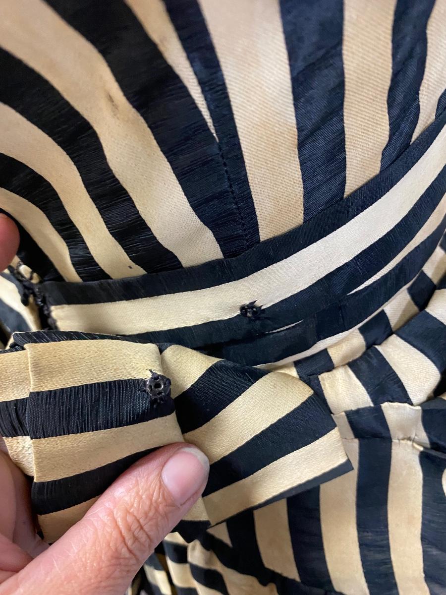 Antique Victorian Edwardian Purple Black & White Three-Piece Dress Skirt Blouse Jacket. Dark plum skirt and jacket with a black & white striped blouse. Skirt is solid color but has discoloring near the bottom. Jacket has hook and eye closures with multiple layers, sewn in boning. Blouse has a gathered look to it to give a bit of curve to the wearer. There is discolor from age and a few hooks and eyes need to be replaced. Fabric is delicate and could tear easily if pulled on. Fit the size 8 mannequin mostly, the torso of coat is smaller than mannequin. Great time period piece, good for costume, reference, or pattern for reproduction.