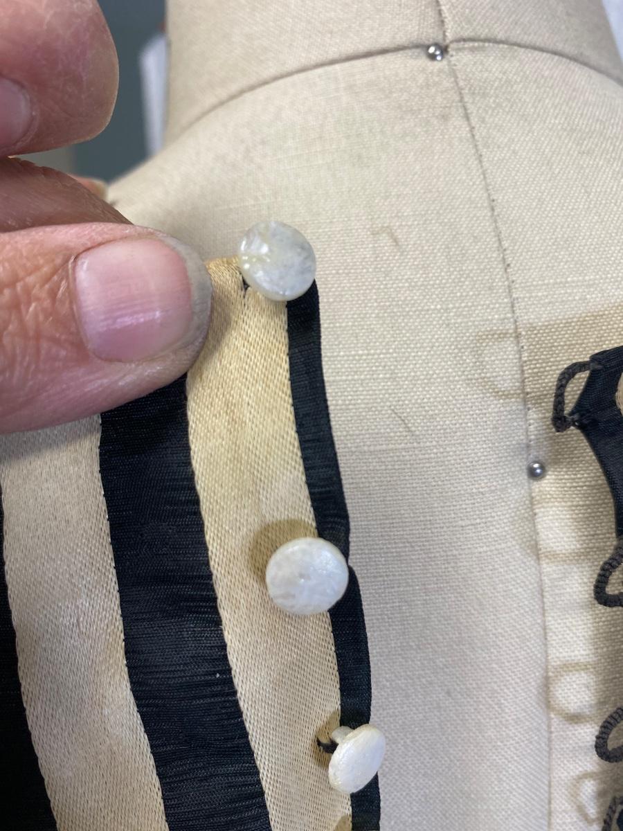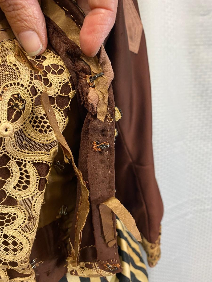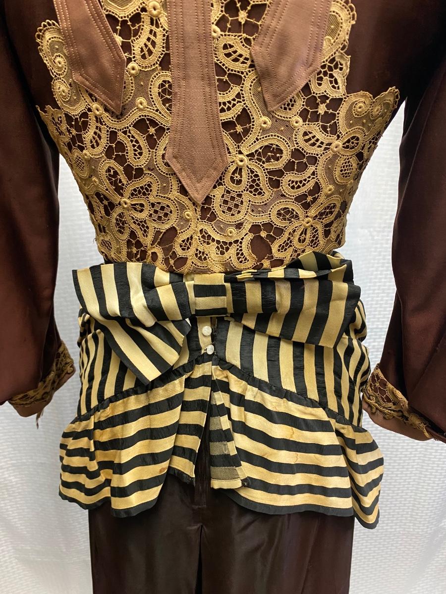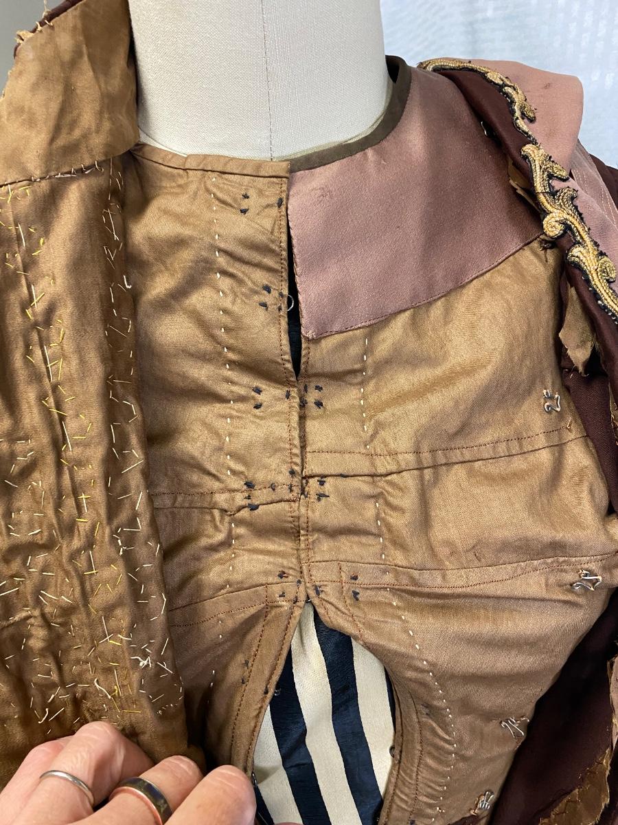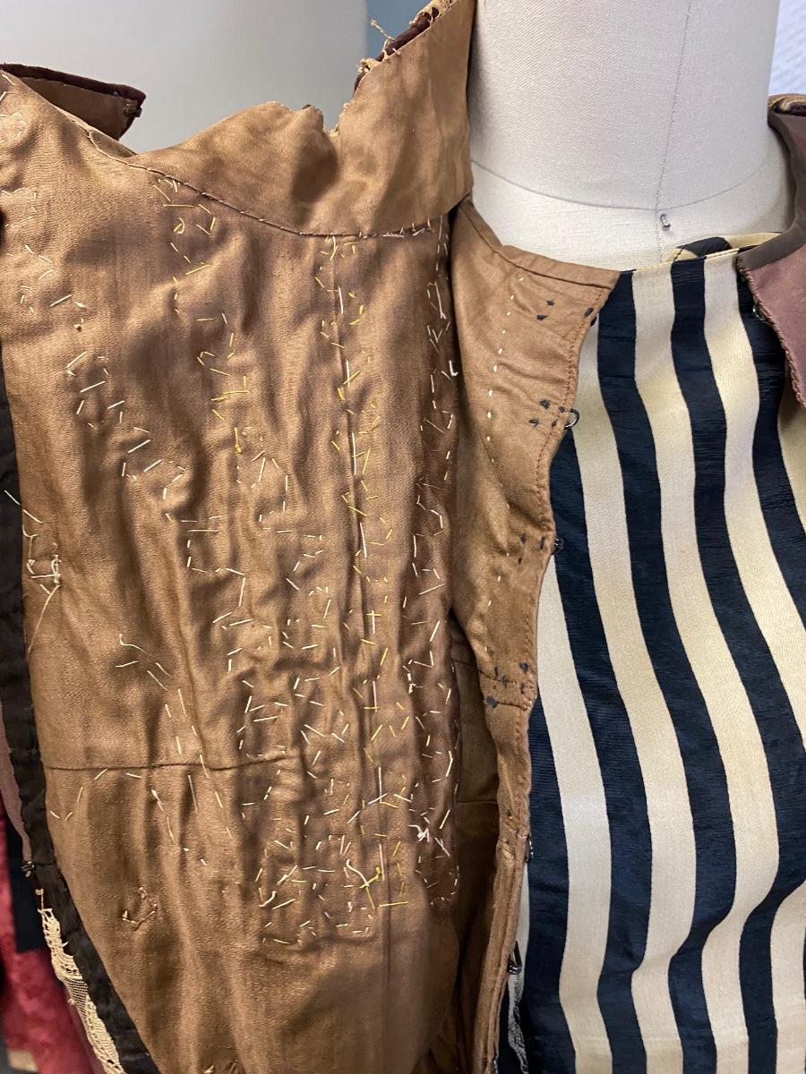 Antique Victorian Edwardian Purple Black & White Three-Piece Dress Skirt Blouse Jacket. Dark plum skirt and jacket with a black & white striped blouse. Skirt is solid color but has discoloring near the bottom. Jacket has hook and eye closures with multiple layers, sewn in boning. Blouse has a gathered look to it to give a bit of curve to the wearer. There is discolor from age and a few hooks and eyes need to be replaced. Fabric is delicate and could tear easily if pulled on. Fit the size 8 mannequin mostly, the torso of coat is smaller than mannequin. Great time period piece, good for costume, reference, or pattern for reproduction.