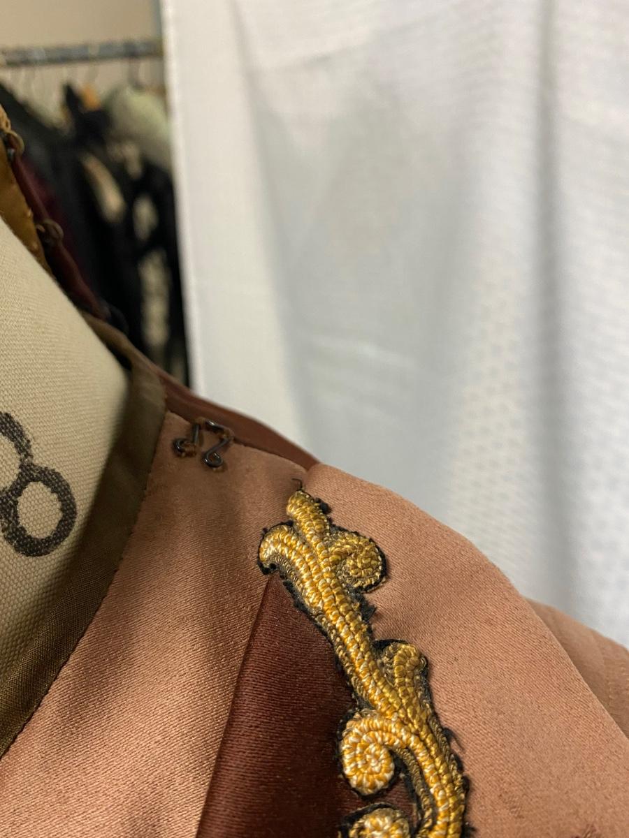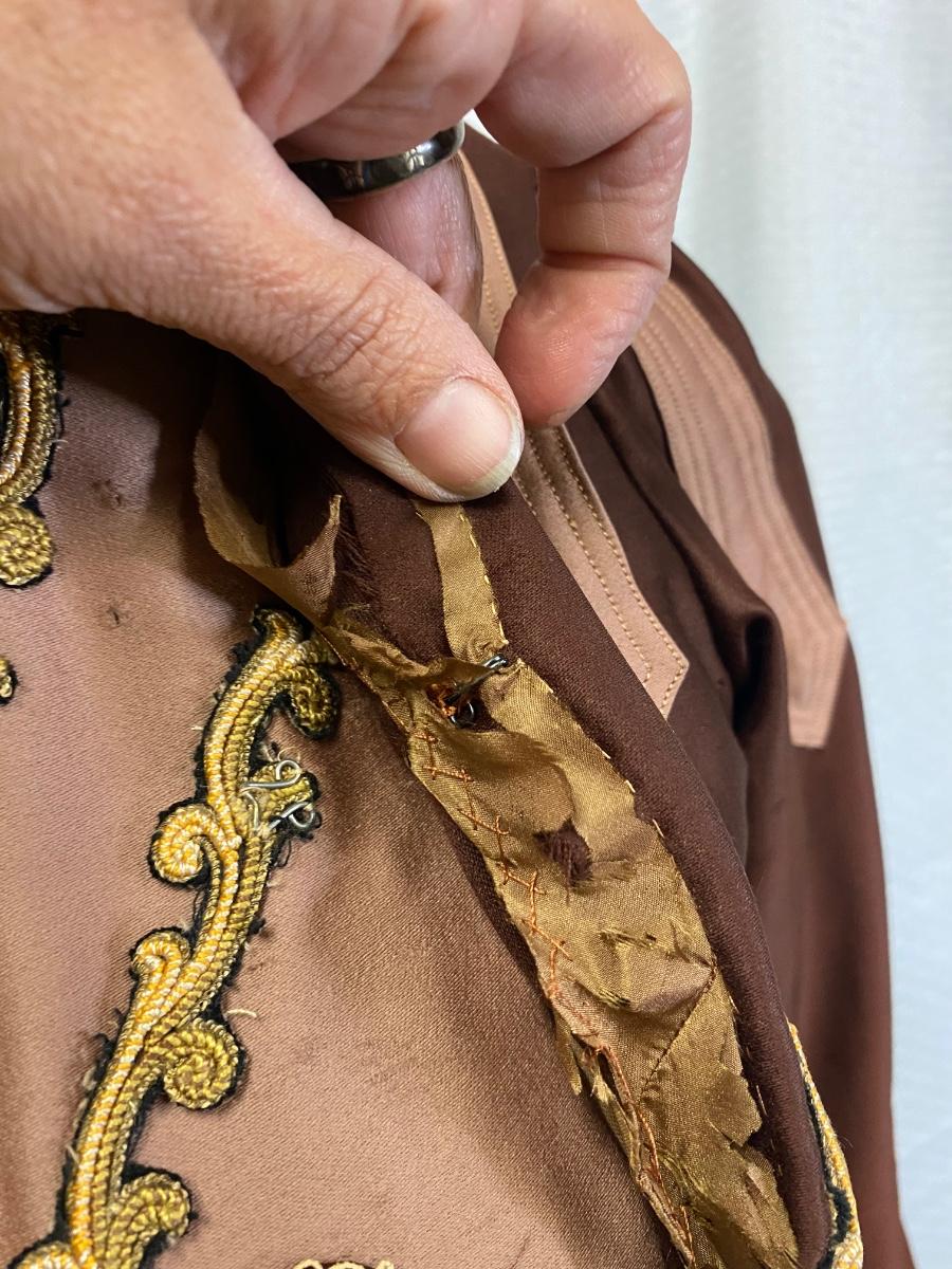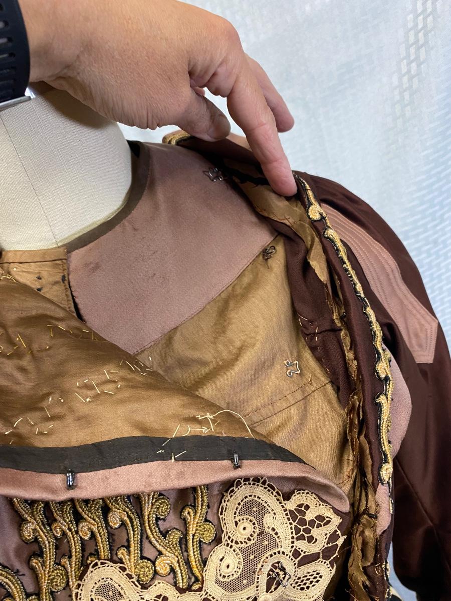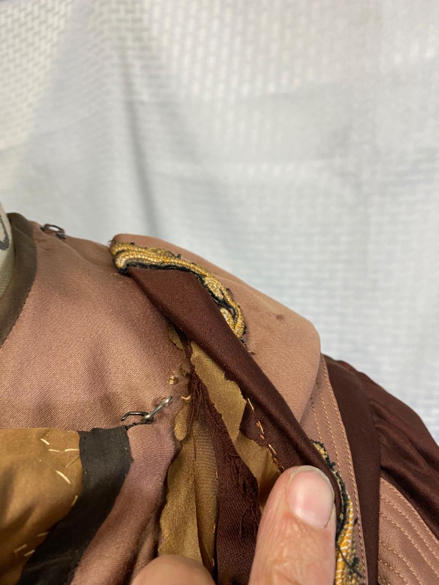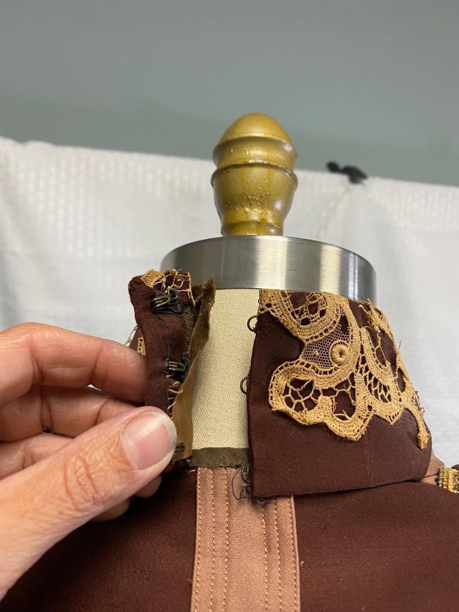 Antique Victorian Edwardian Purple Black & White Three-Piece Dress Skirt Blouse Jacket. Dark plum skirt and jacket with a black & white striped blouse. Skirt is solid color but has discoloring near the bottom. Jacket has hook and eye closures with multiple layers, sewn in boning. Blouse has a gathered look to it to give a bit of curve to the wearer. There is discolor from age and a few hooks and eyes need to be replaced. Fabric is delicate and could tear easily if pulled on. Fit the size 8 mannequin mostly, the torso of coat is smaller than mannequin. Great time period piece, good for costume, reference, or pattern for reproduction.