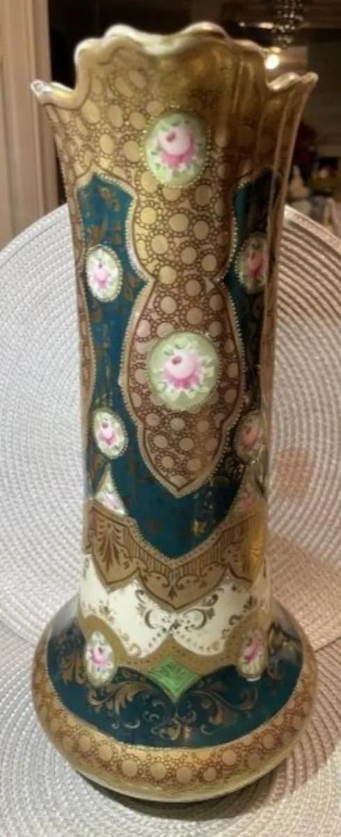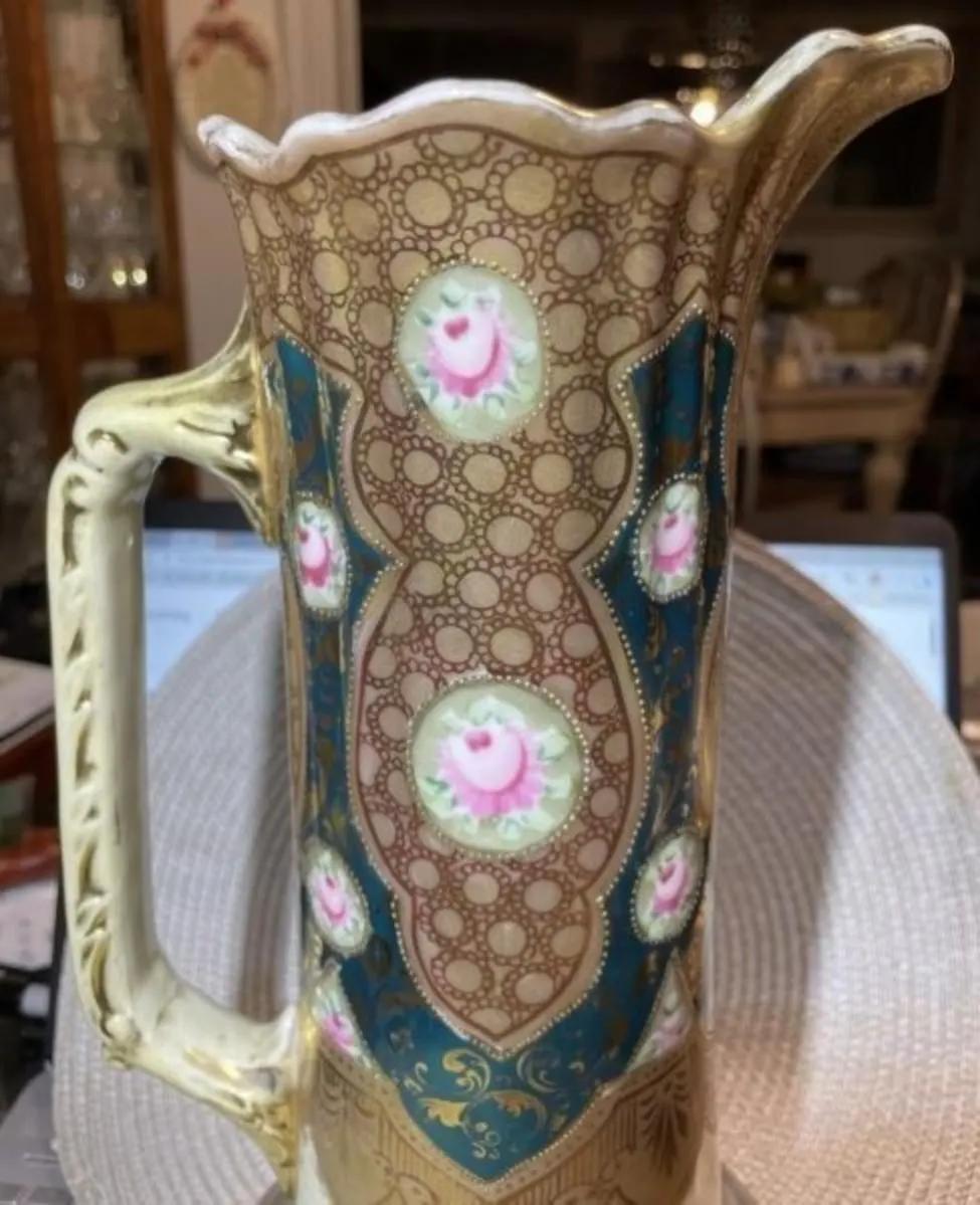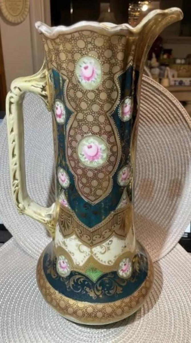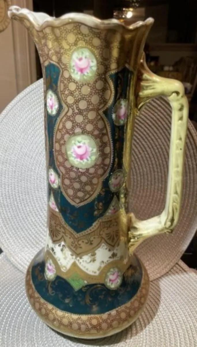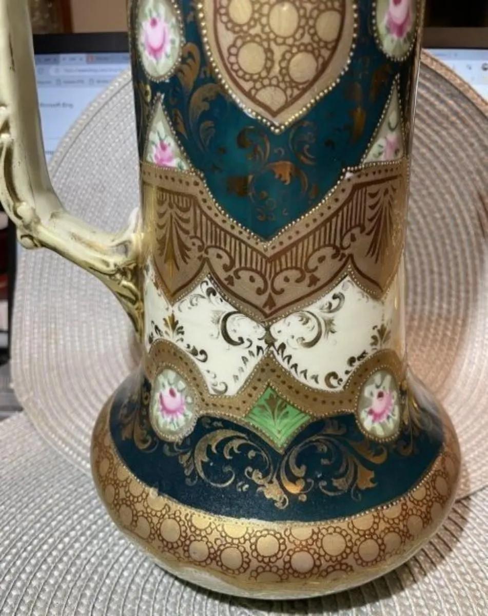 Antique Victorian Era Decorated Tankard/Pitcher Unmarked Base 13.5" Tall in Good Preowned Condition. $15 DOMESTIC INHOUSE SHIPPING.