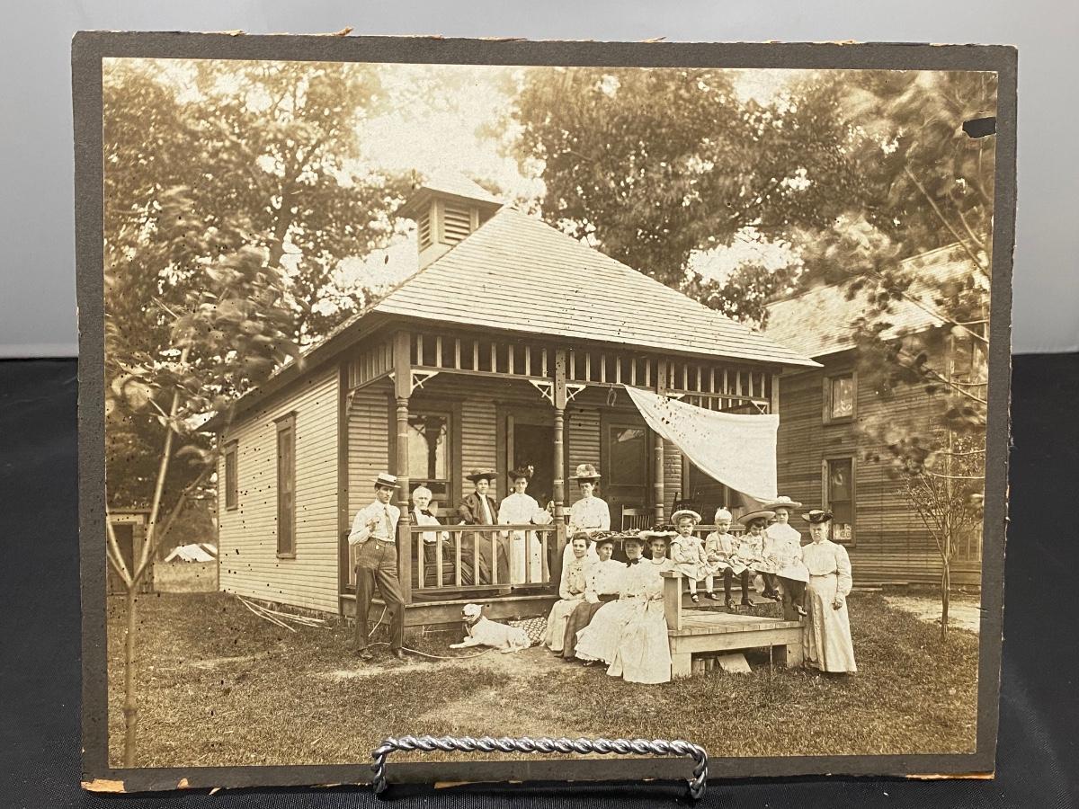 Antique multigeneration photograph of a family. Posed on the porch of a home, there is notes on the back. Photo is from 1908 in Ohio. Some wear along the edges but in overall good condition.