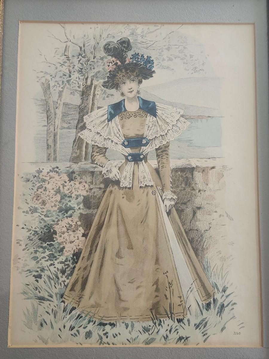 Antique fashion plate print depicting a Victorian era woman in a period dress with lace detailing and hat, rendered in soft muted tones. Print is professionally matted and housed in an ornate decorative frame. Image includes visible plate number 3148 in the lower corner. Sold as a decorative antique print suitable for display, collection, or period decor.