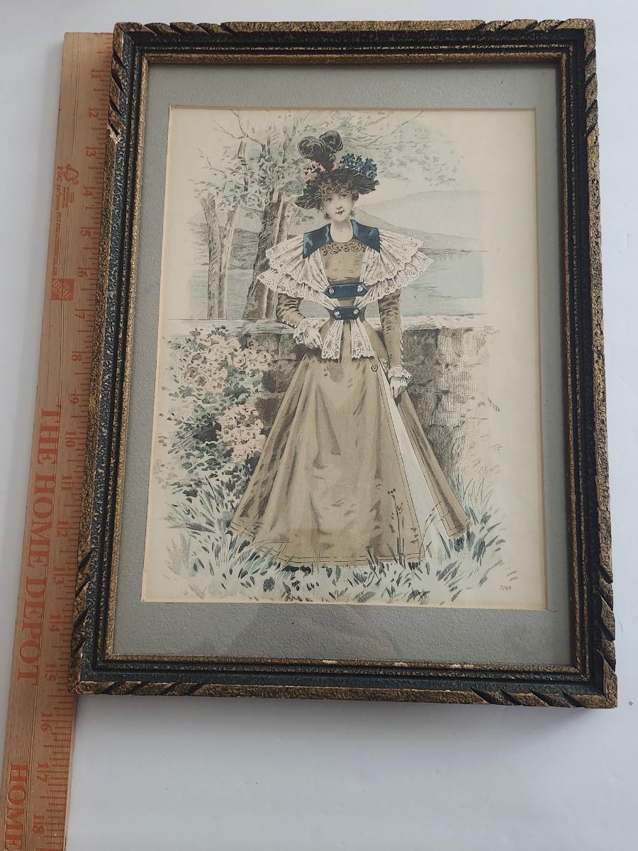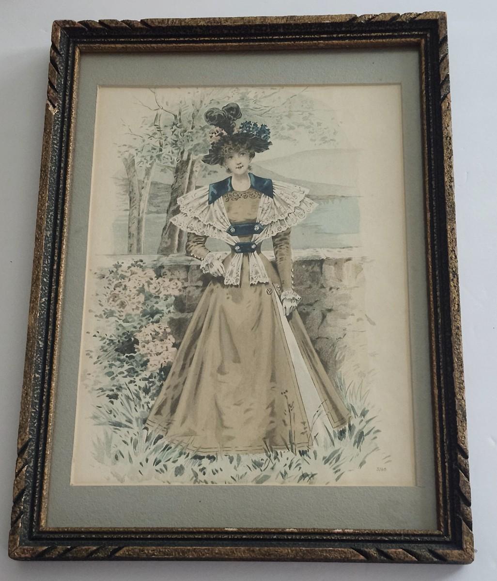 Antique Victorian Fashion Plate Print Framed Period Dress Illustration With Ornate Matting And Decorative Frame