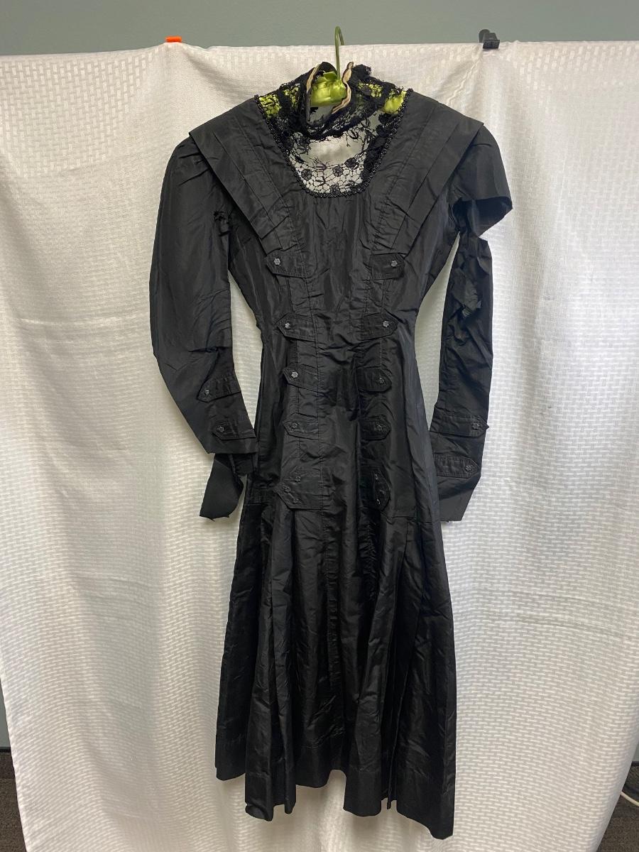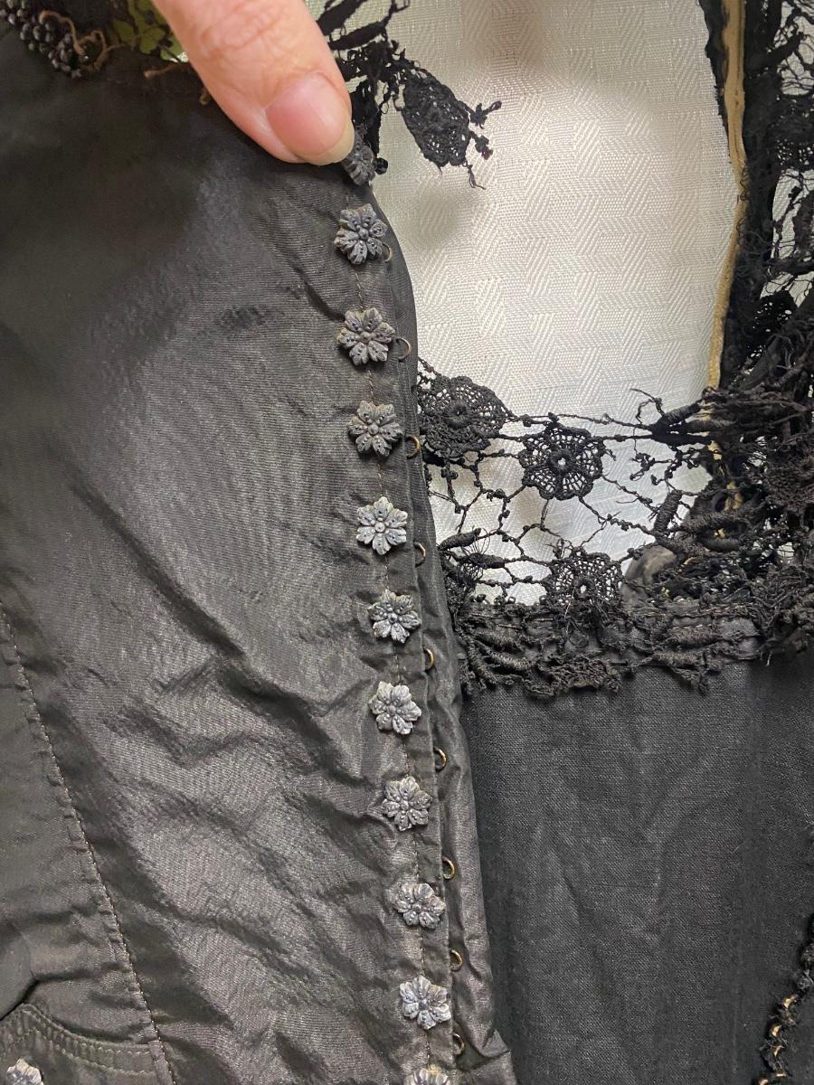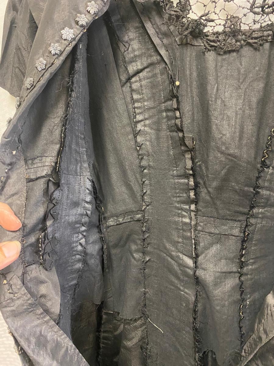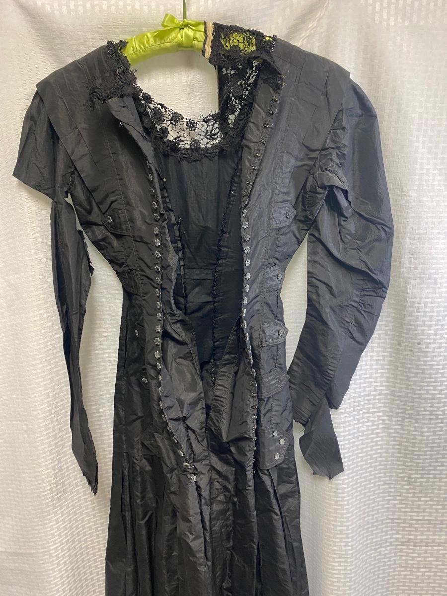 Antique Victorian Gothic Black Morning Dress Gown. The fabric is a bit delicate and will tear easily if not handled carefully. Needs some repair. Great for reproduction pattern or cosplay costume. Small size, will not fit mannequin, looks like it may have been altered a little when looking at the back. Narrow of waist is about 10.5" size.
