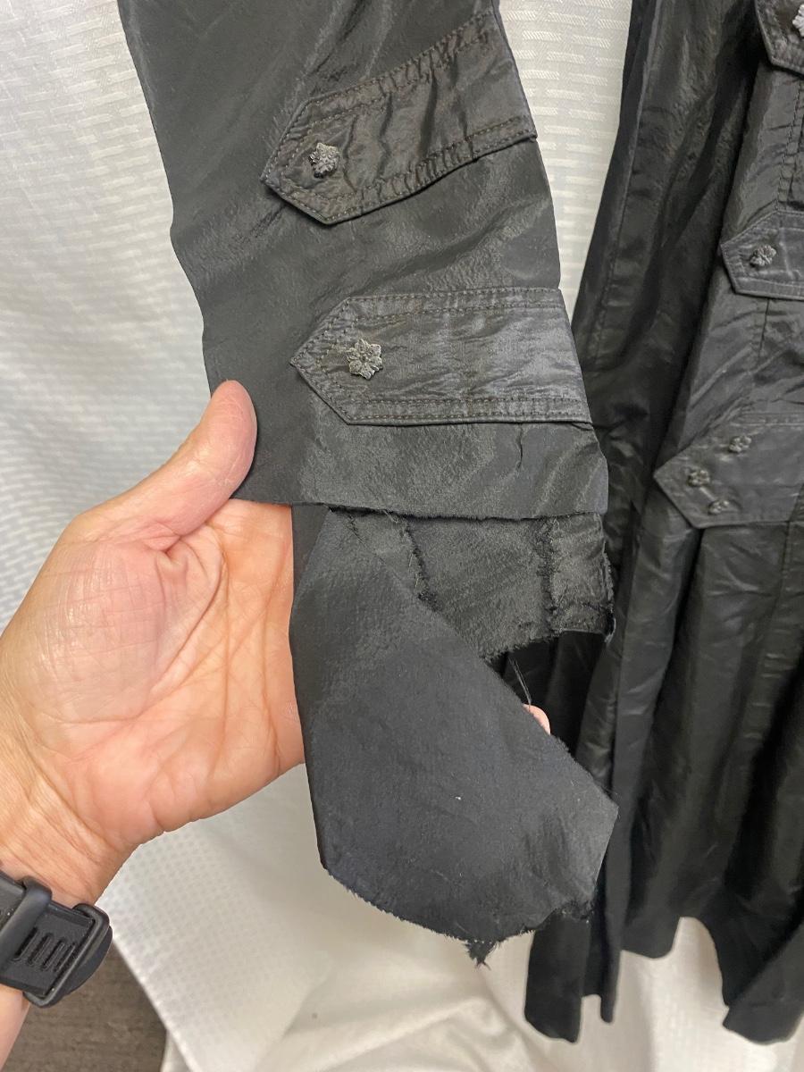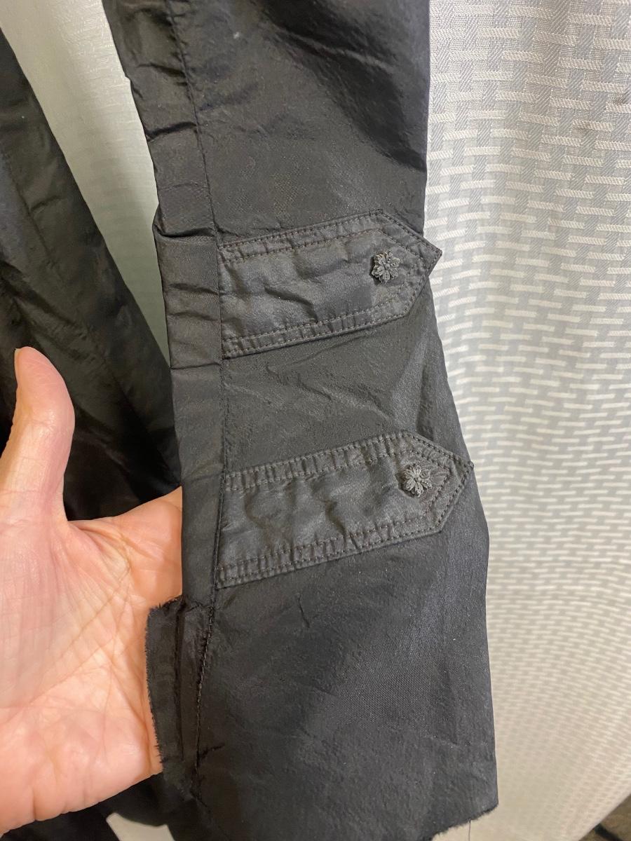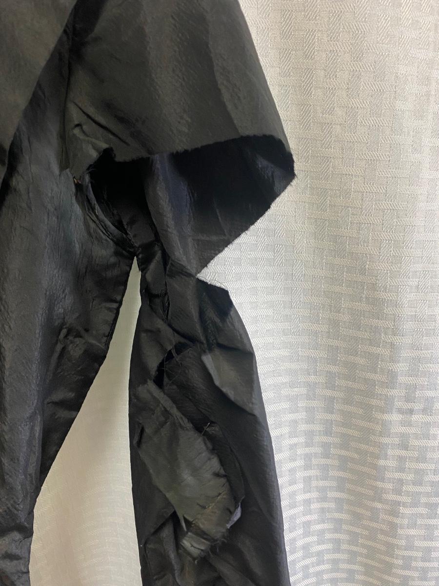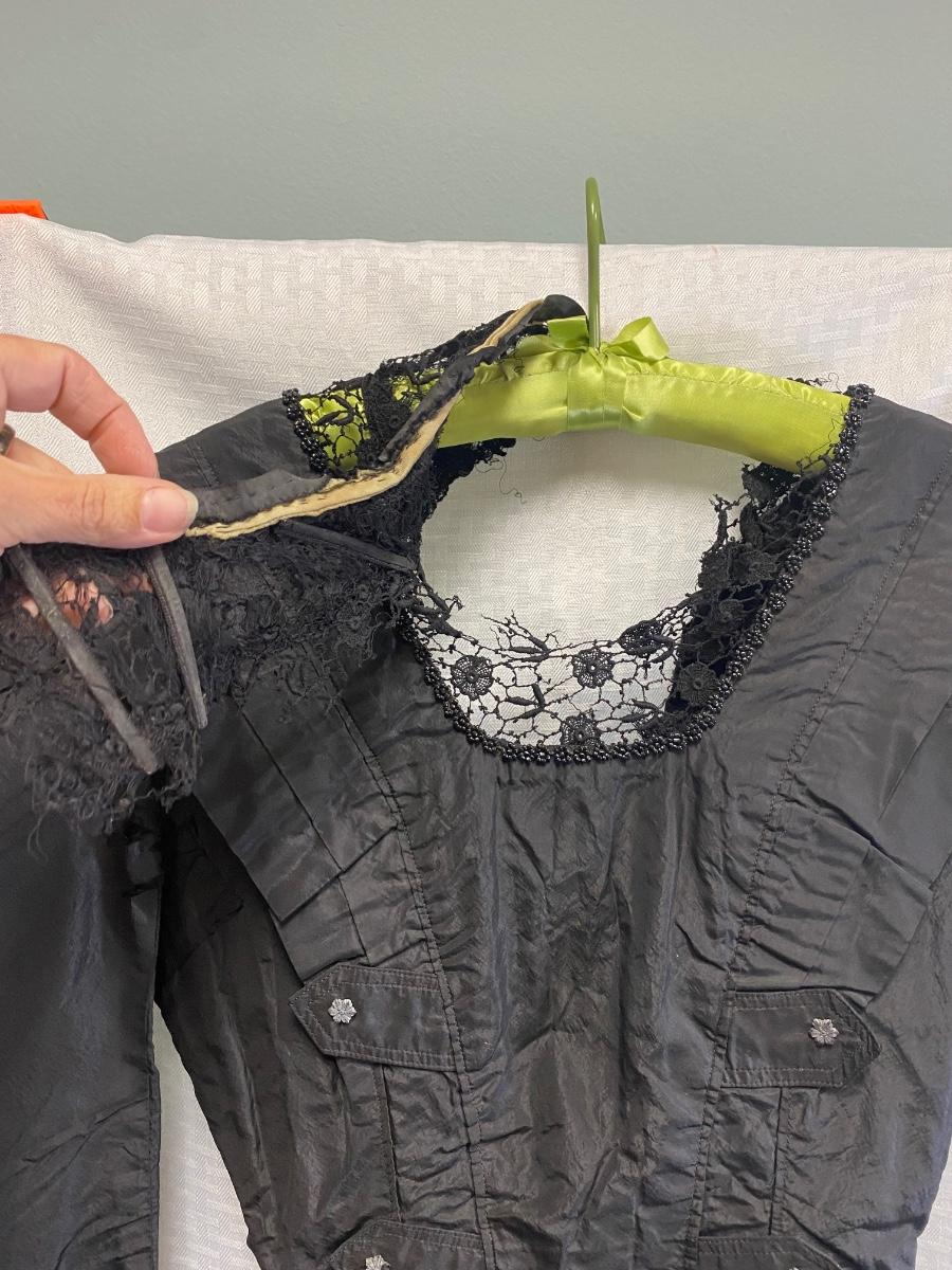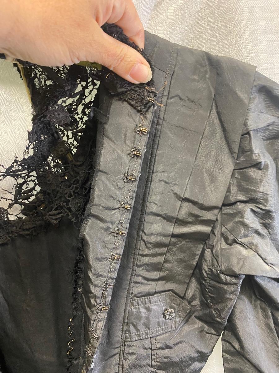 Antique Victorian Gothic Black Morning Dress Gown. The fabric is a bit delicate and will tear easily if not handled carefully. Needs some repair. Great for reproduction pattern or cosplay costume. Small size, will not fit mannequin, looks like it may have been altered a little when looking at the back. Narrow of waist is about 10.5" size.
