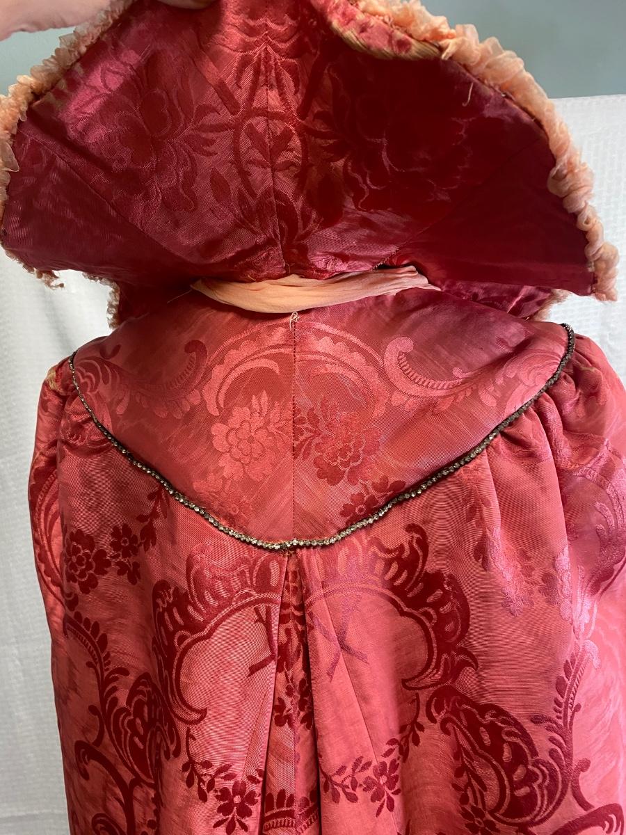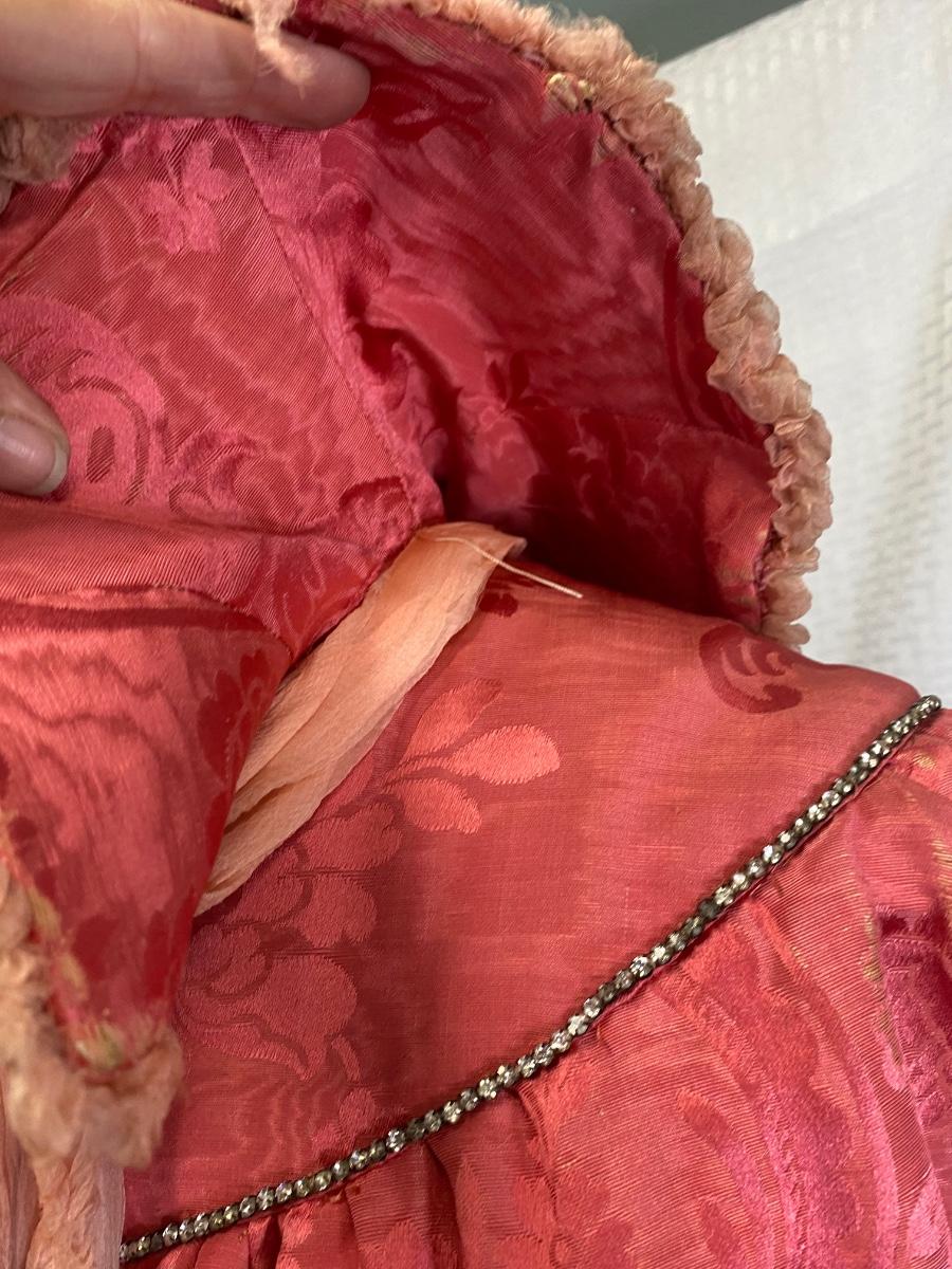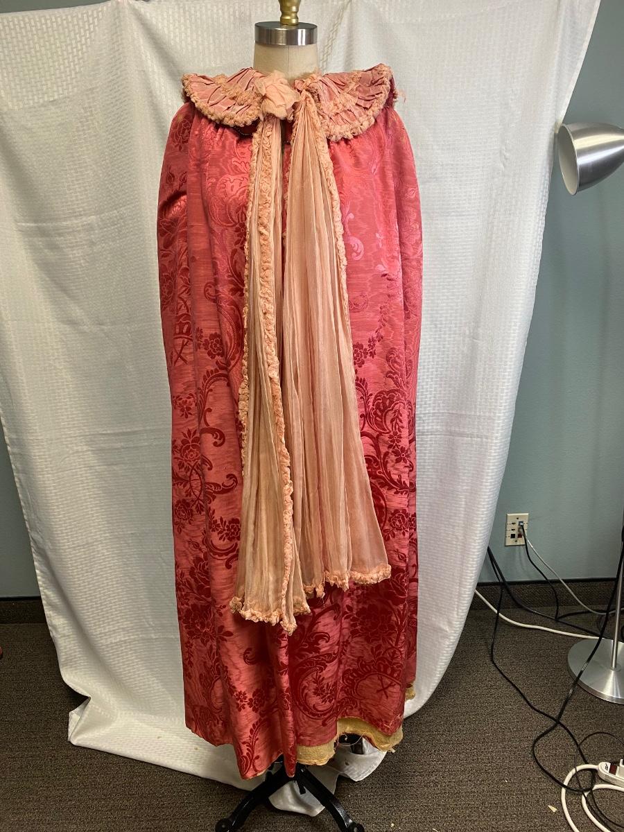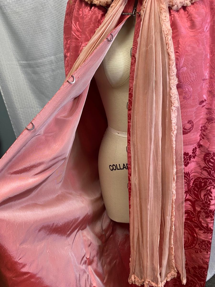 Antique Victorian Heavy Pink Robe Cape. Dark pink floral damask fabric with a lighter lining. Hook and eye closure at the neck. The neck collar has boning in it, almost like it should have originally flared up possibly. Very heavy weight. The bottom hem has split or torn. Fits the size 8 mannequin nice, maybe up to a size 12.