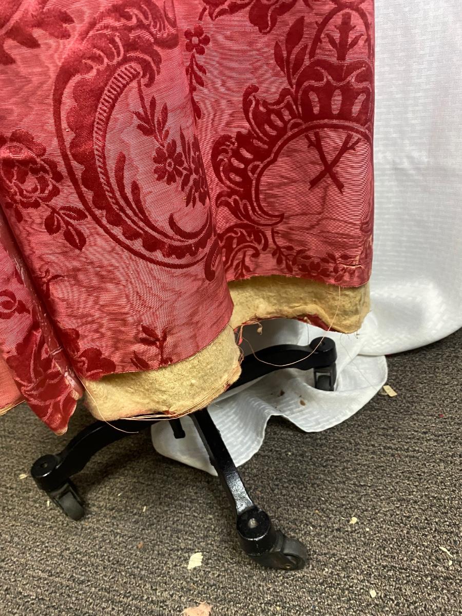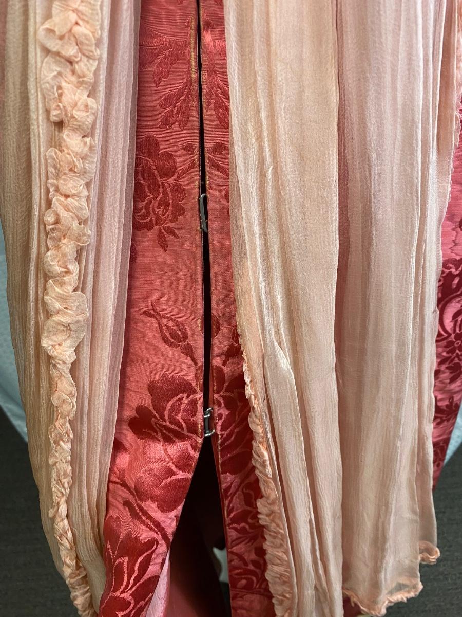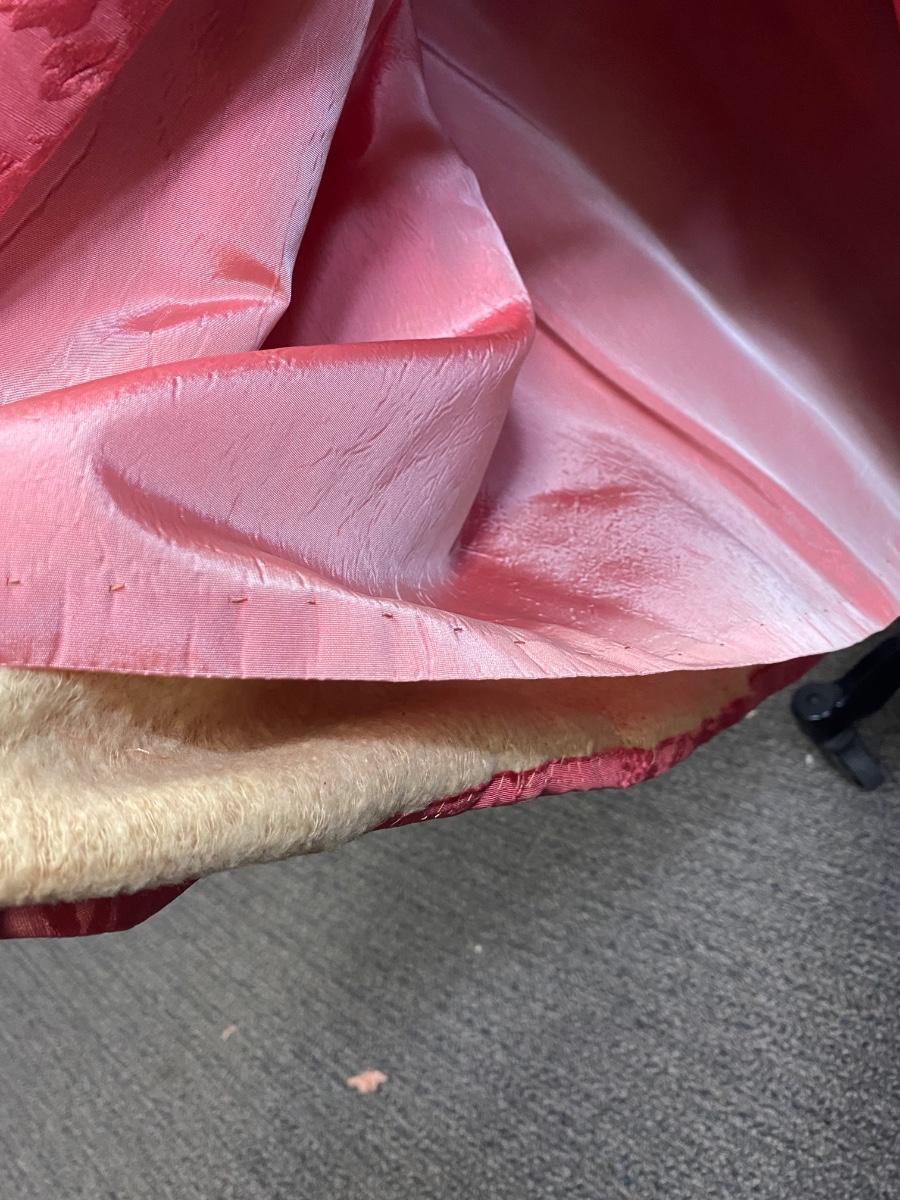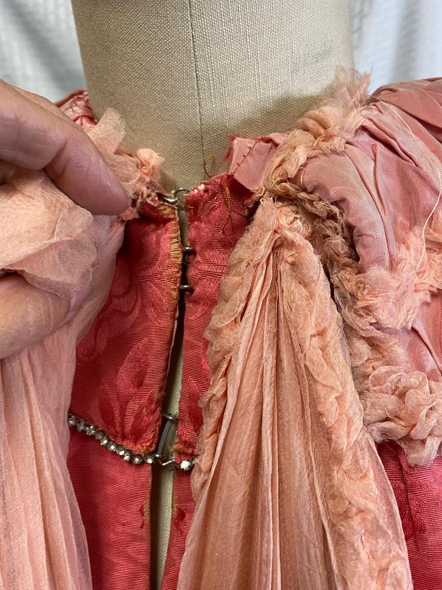 Antique Victorian Heavy Pink Robe Cape. Dark pink floral damask fabric with a lighter lining. Hook and eye closure at the neck. The neck collar has boning in it, almost like it should have originally flared up possibly. Very heavy weight. The bottom hem has split or torn. Fits the size 8 mannequin nice, maybe up to a size 12.