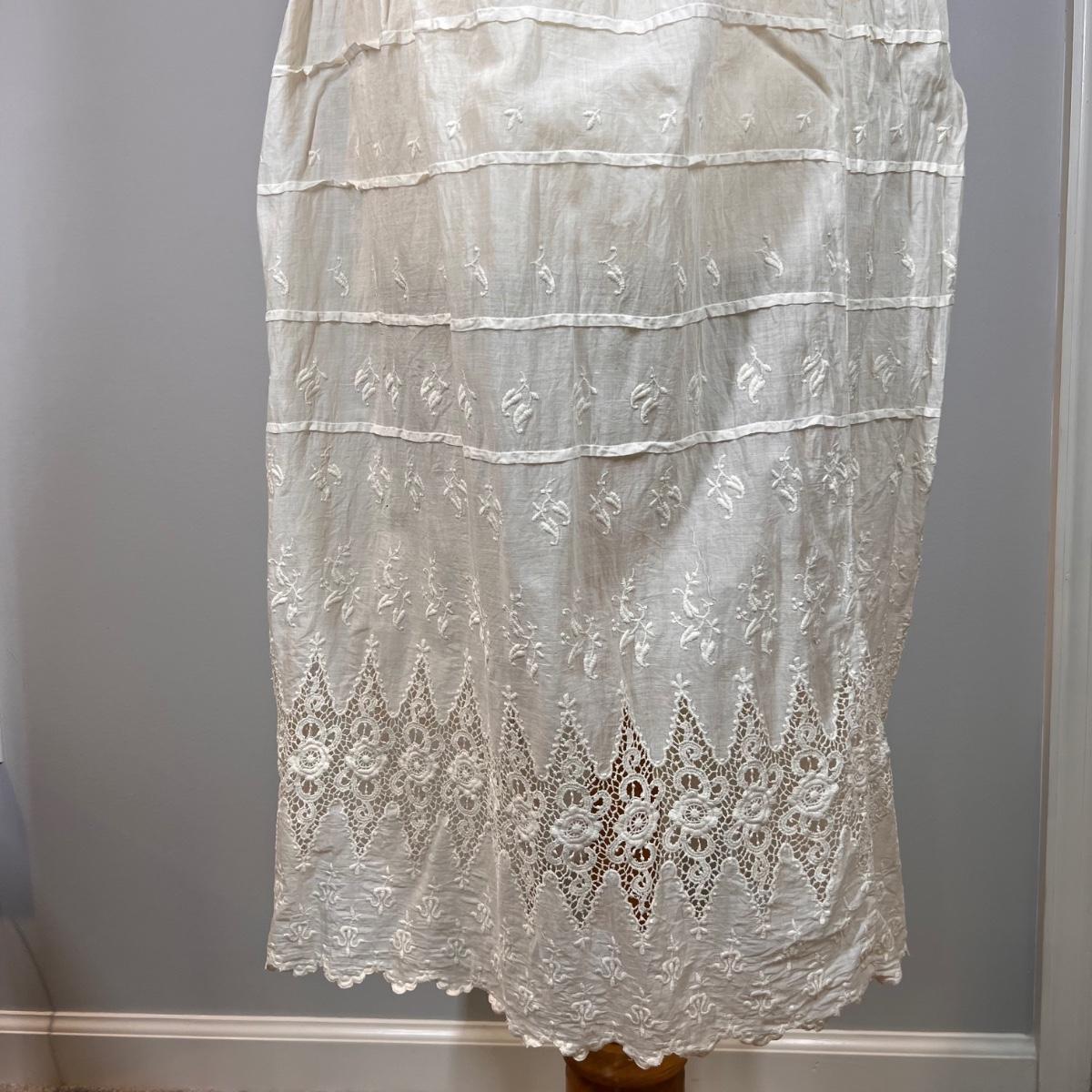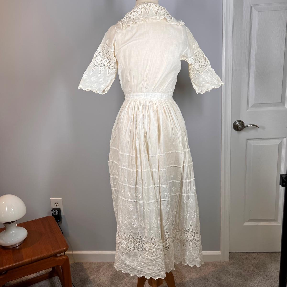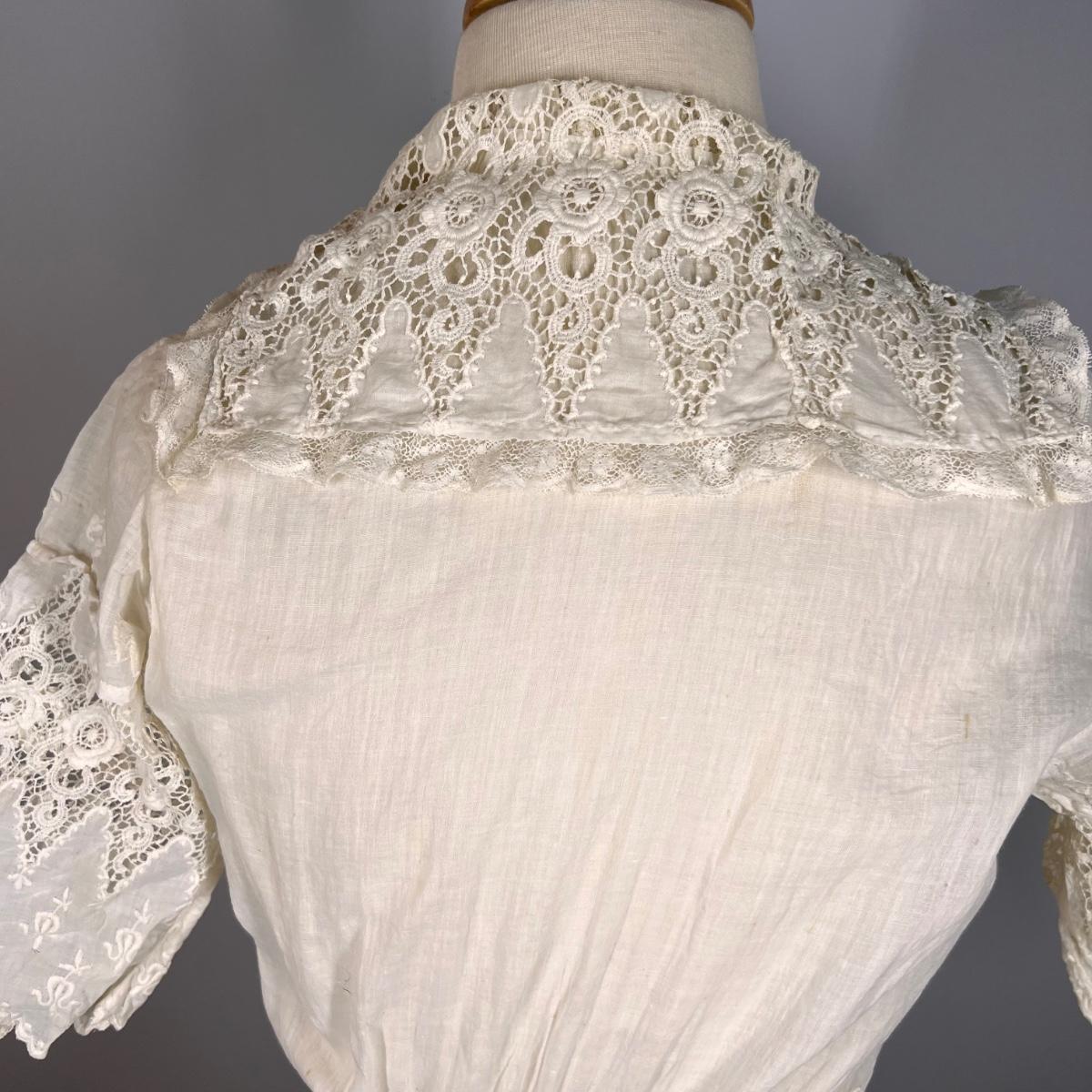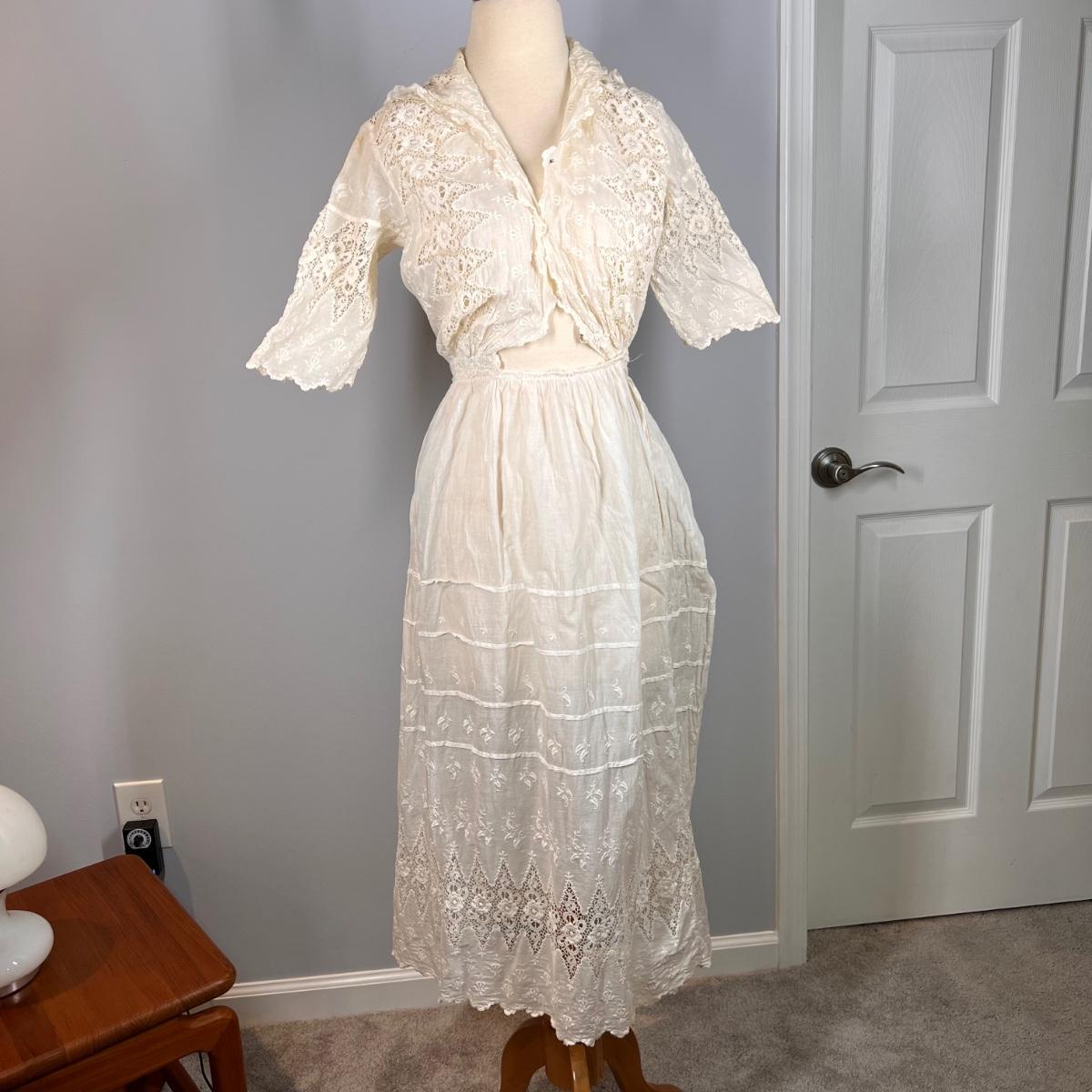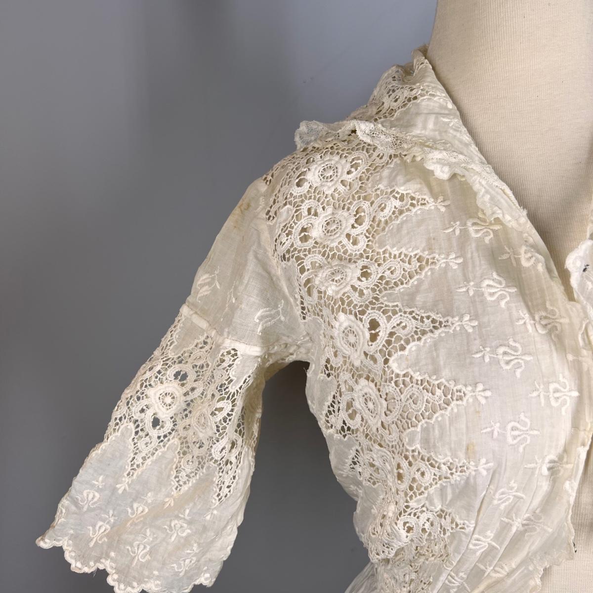 Turn of the century lace and cotton dress with lace collar. Size xs. Needs slight repair to snaps and hook eyes. Great condition for age.