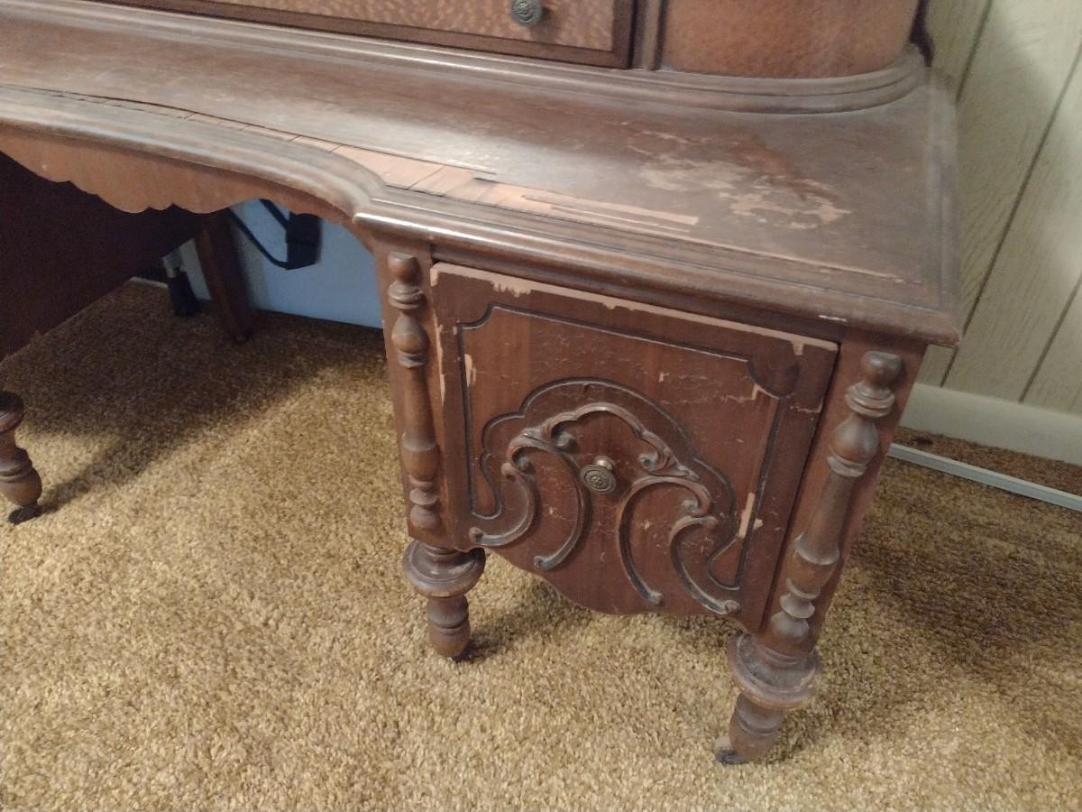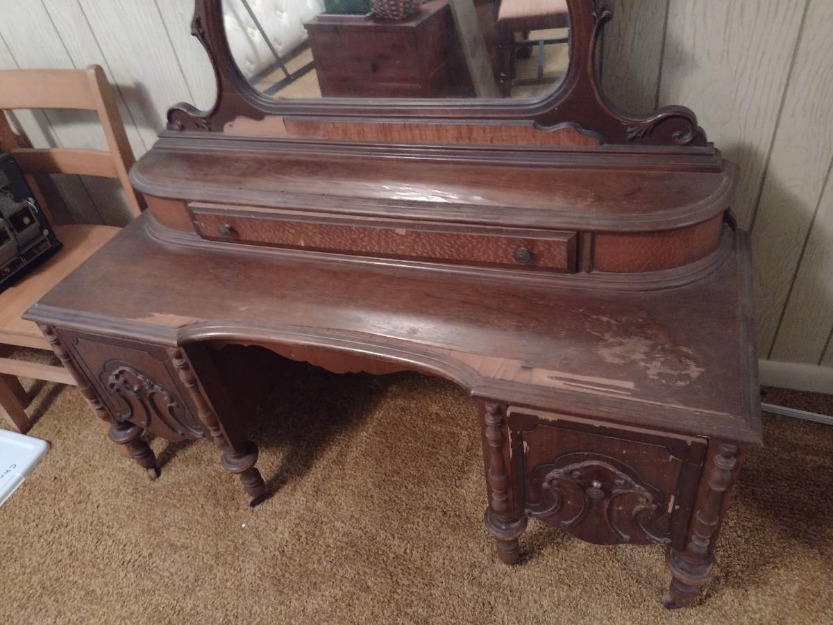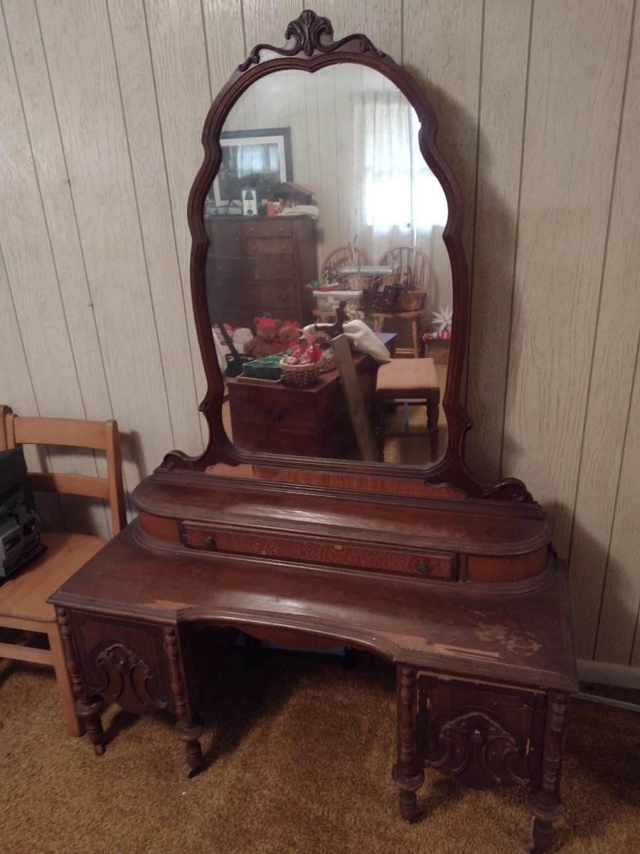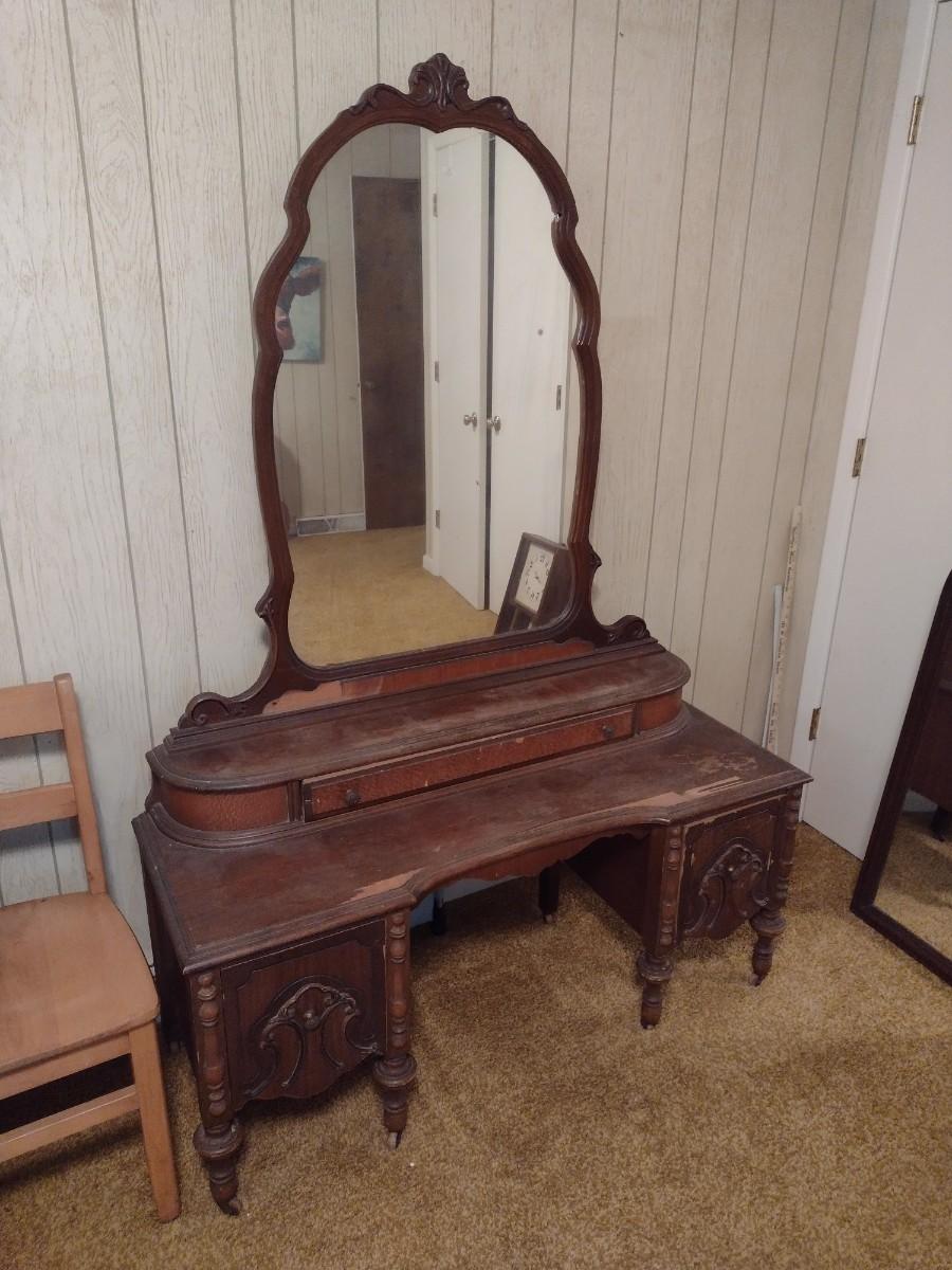 Antique Victorian Mahogany Vanity Desk with Mirror. Has some delamination to finish as shown.