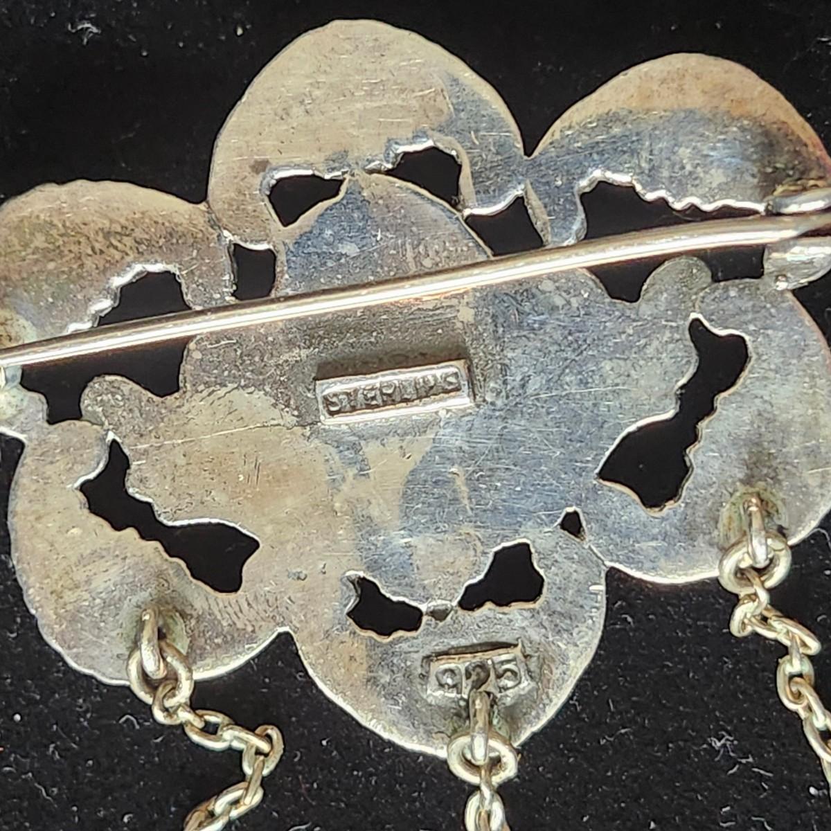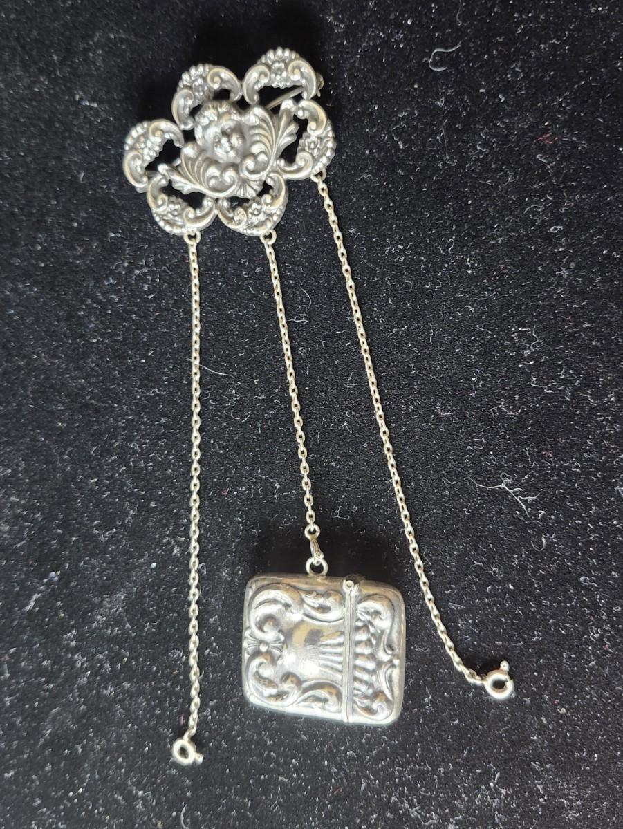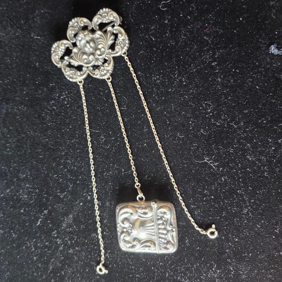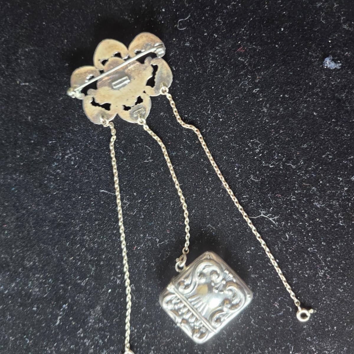 Sterling silver pin with 3 chains from where a shistle, snuff bottle, key, or a pill box might hang as ornaments.