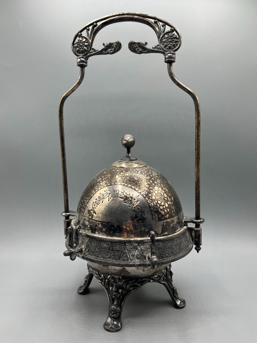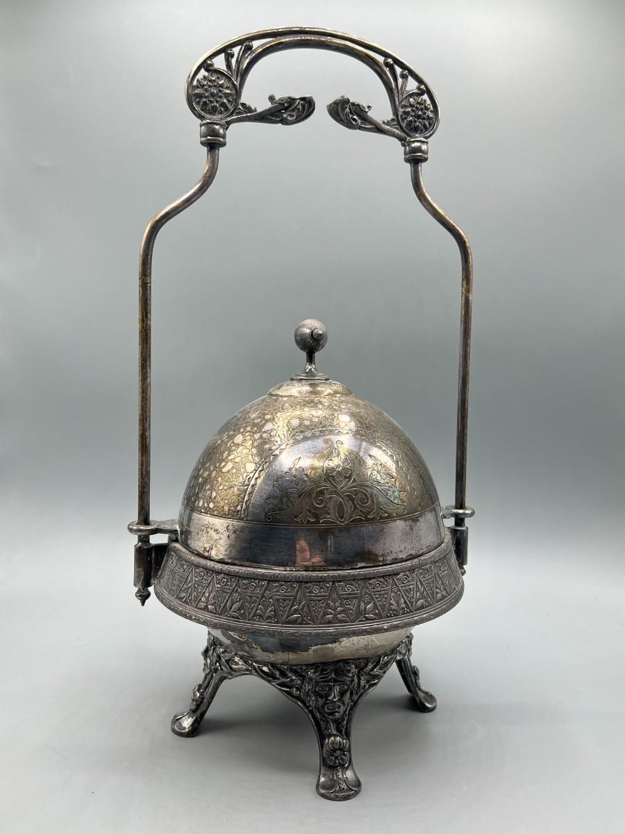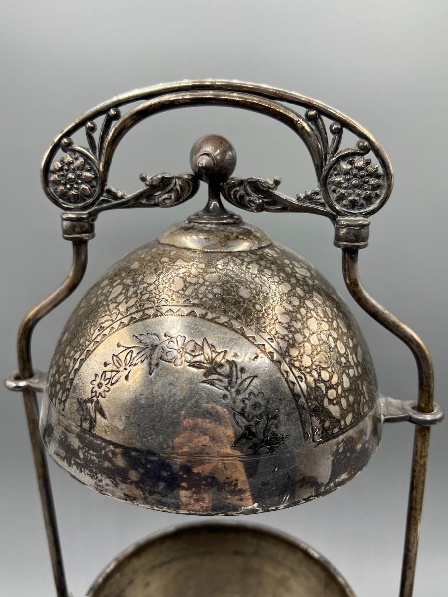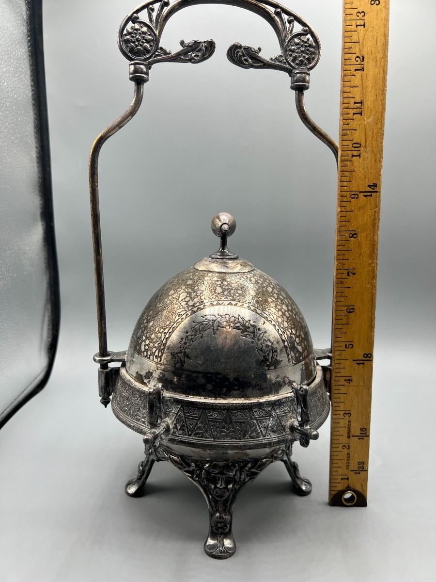 Antique Victorian Silver Plate Gothic Ornate Decorated Covered Butter Dish Centerpiece