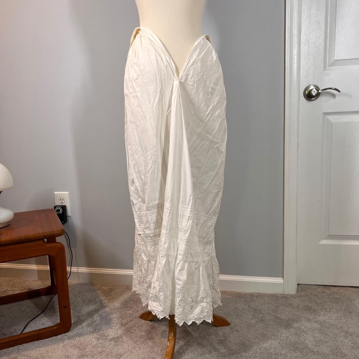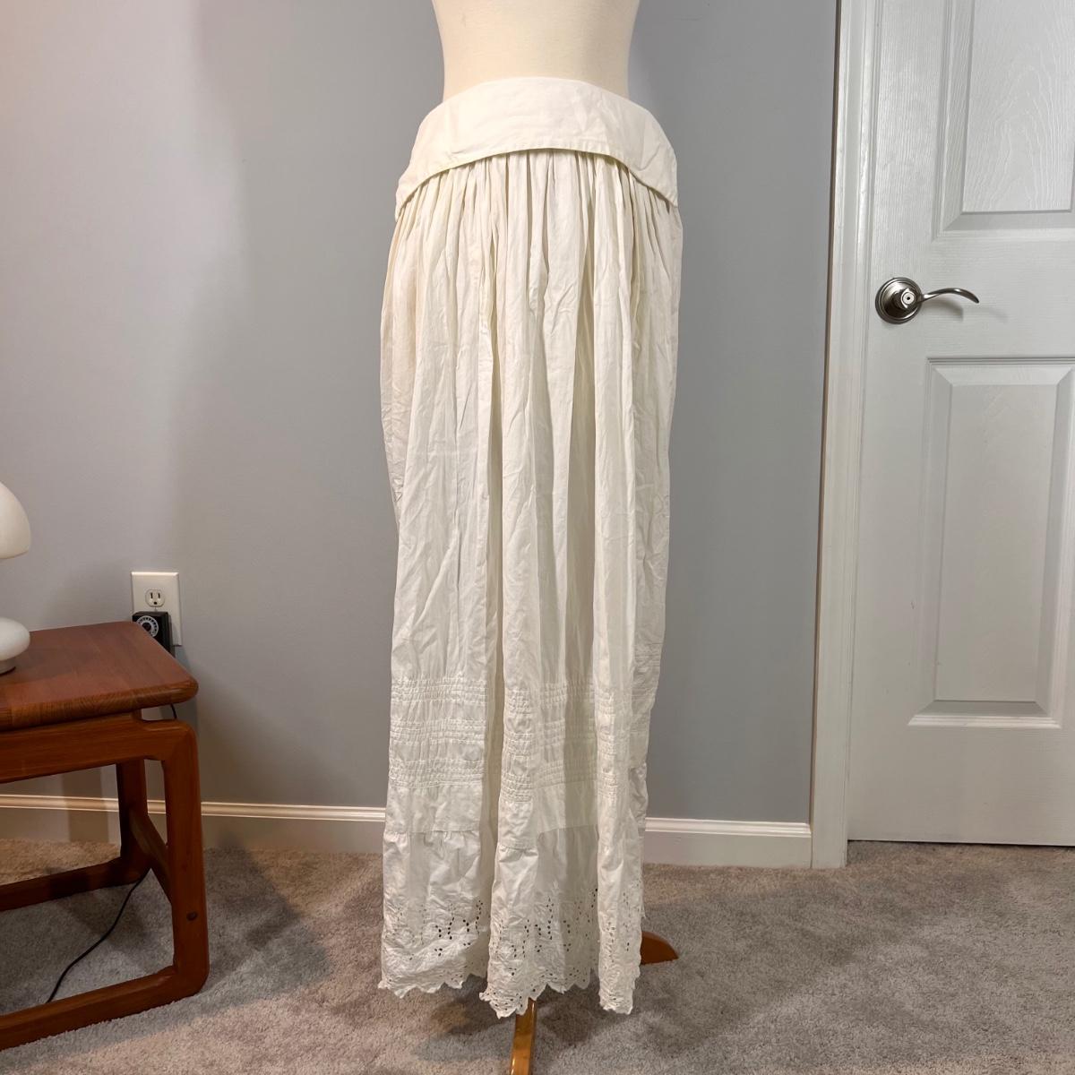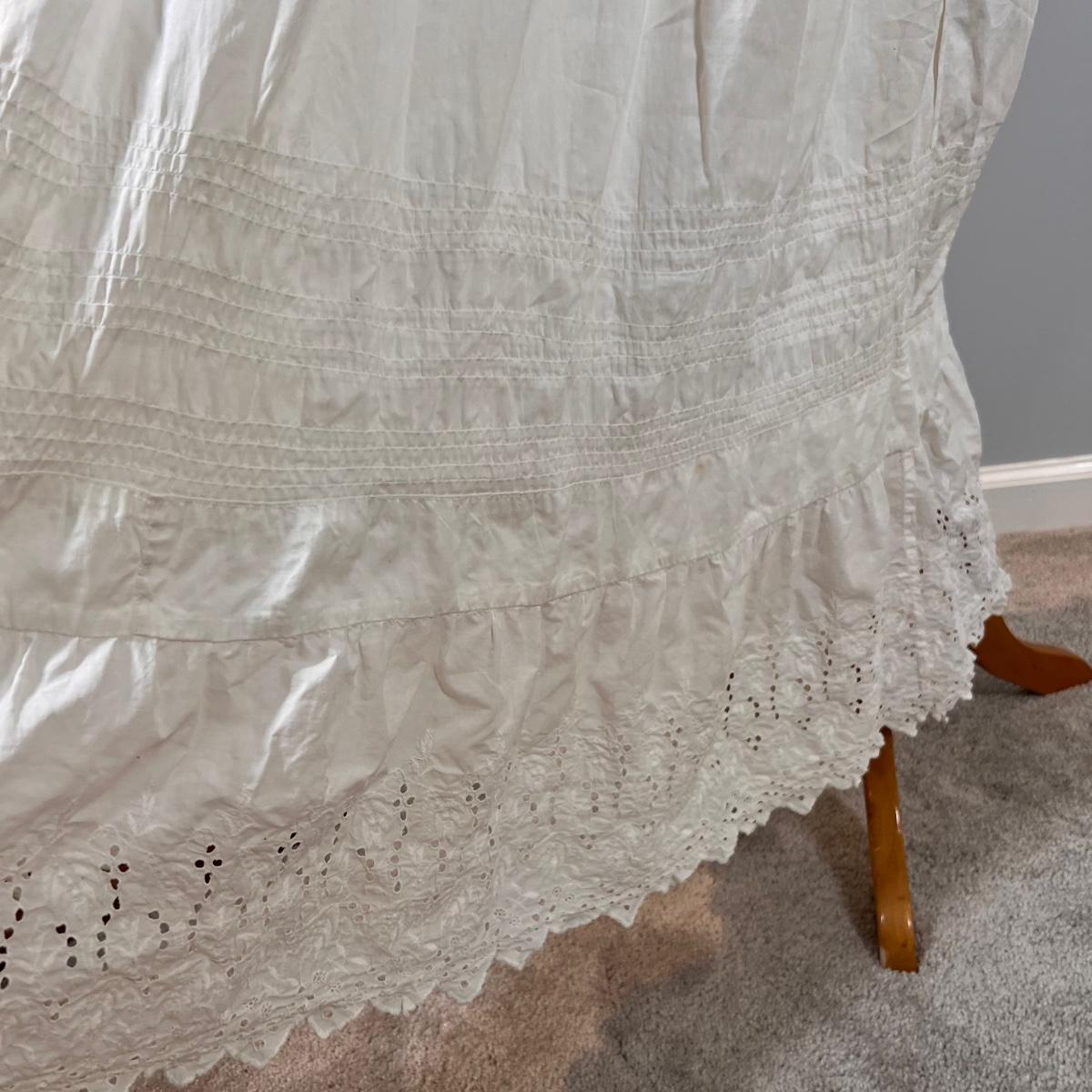 Antique skirt with embroidered lace detailed hem. Small stains good condition for age. No closure at waist.