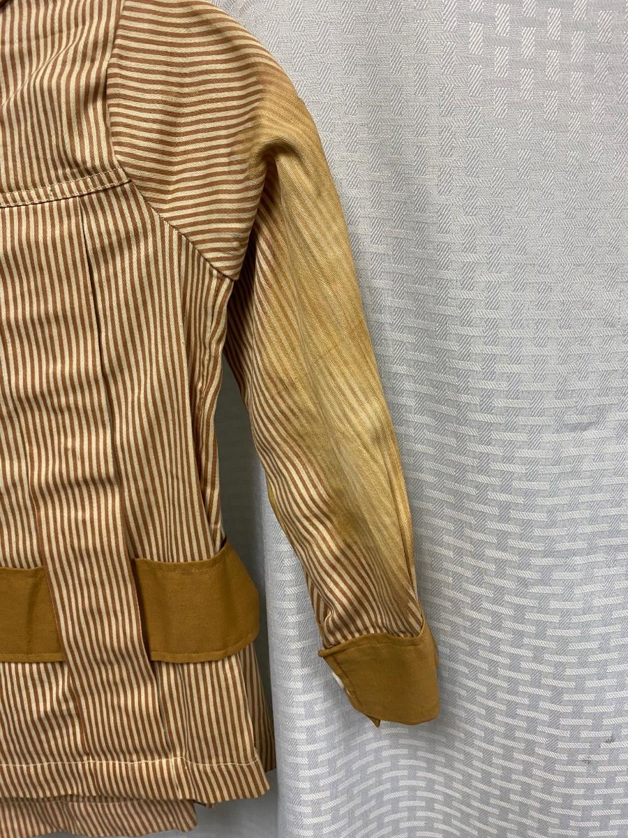 Antique Victorian Small Boy Toddler Two Piece Tan & White Striped Suit. No holes, but quite a few bleached out looking spots. Toddler size. Pants have suspenders but the elastic is bad. Despite the large spots the outfit is in wearable condition, heavy weight cotton.