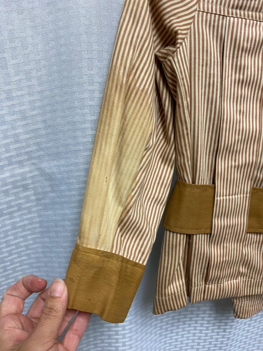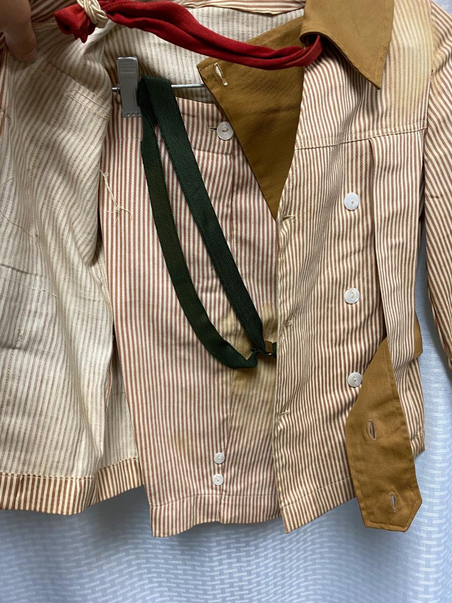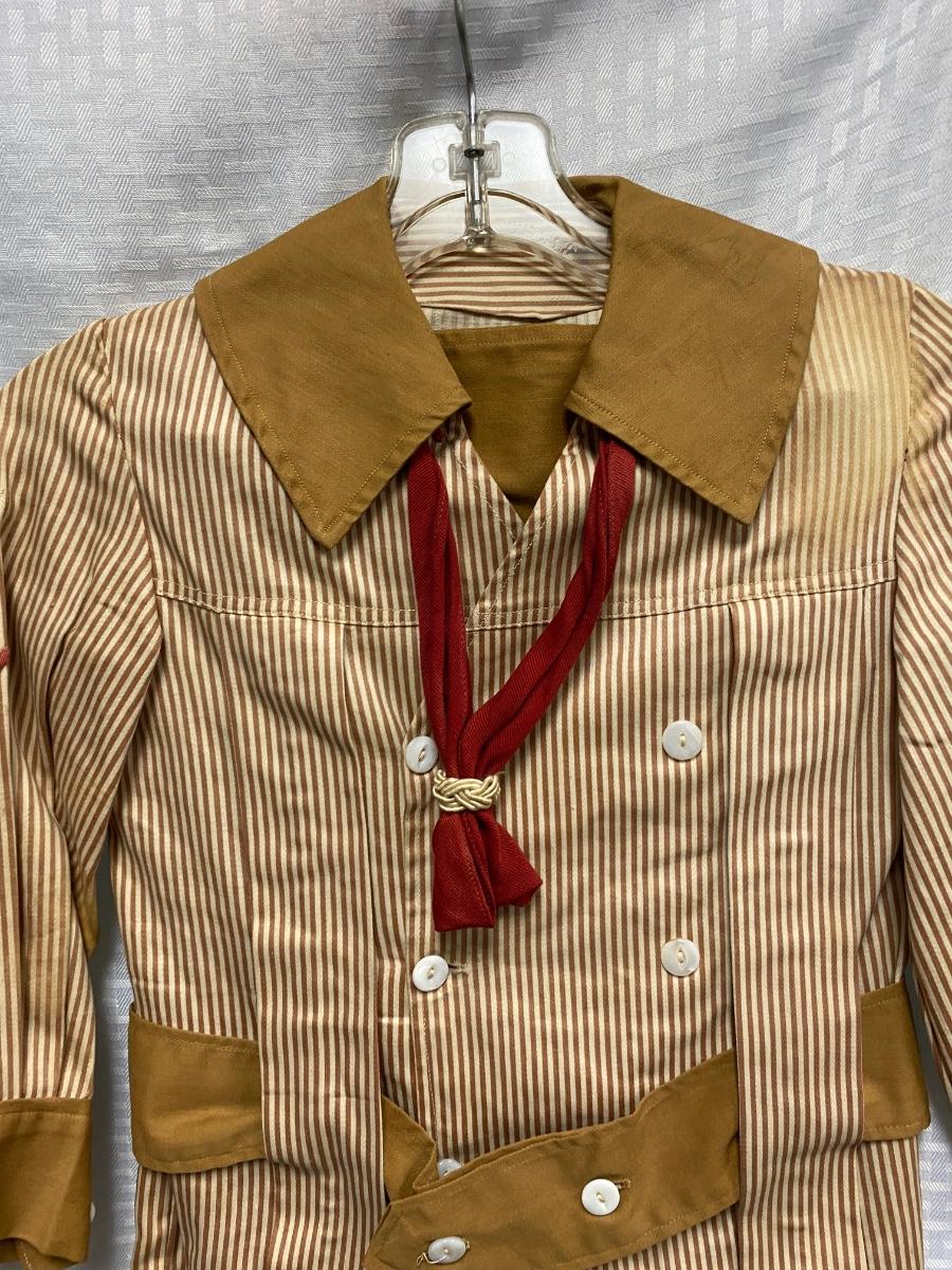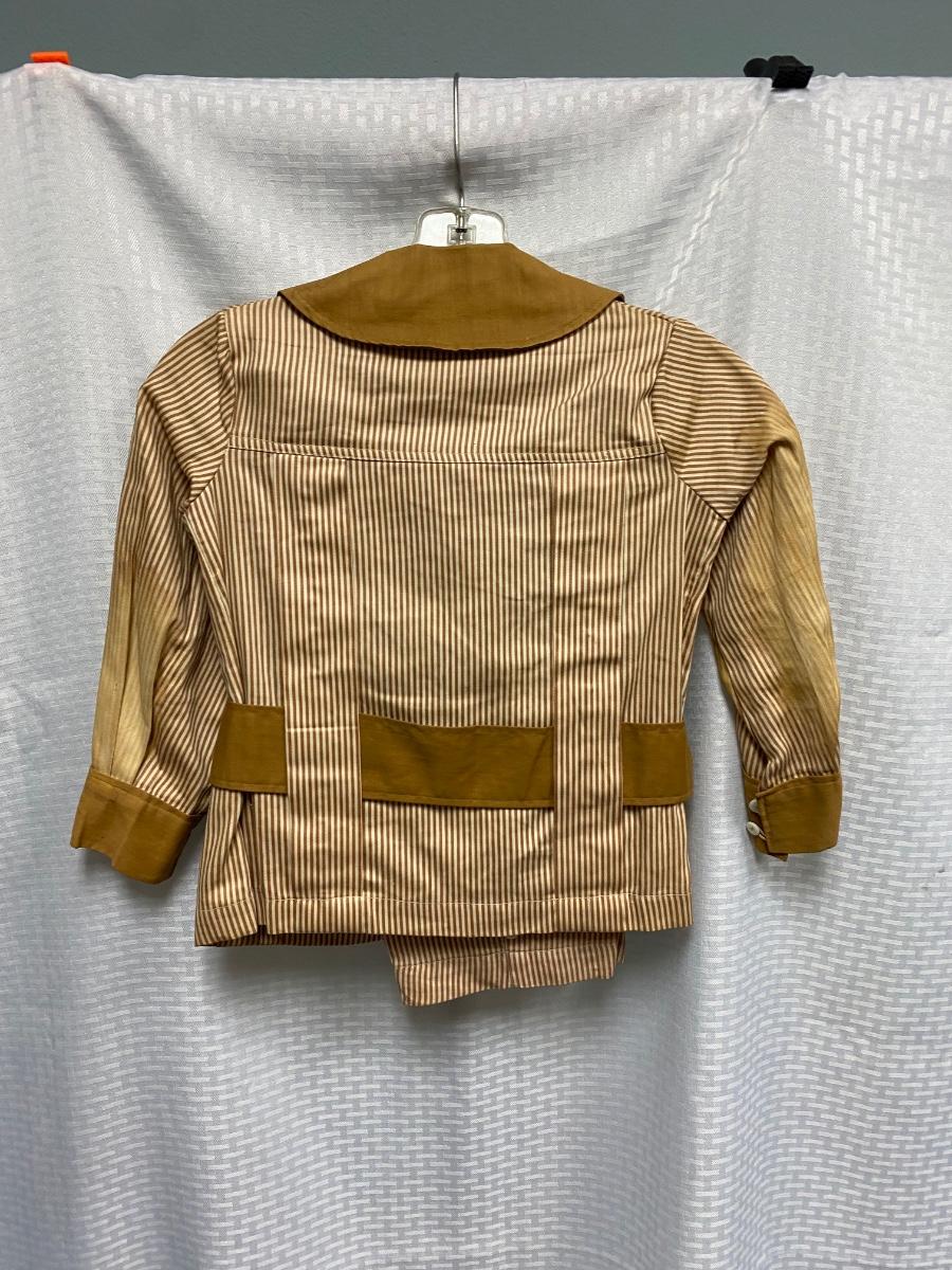 Antique Victorian Small Boy Toddler Two Piece Tan & White Striped Suit. No holes, but quite a few bleached out looking spots. Toddler size. Pants have suspenders but the elastic is bad. Despite the large spots the outfit is in wearable condition, heavy weight cotton.