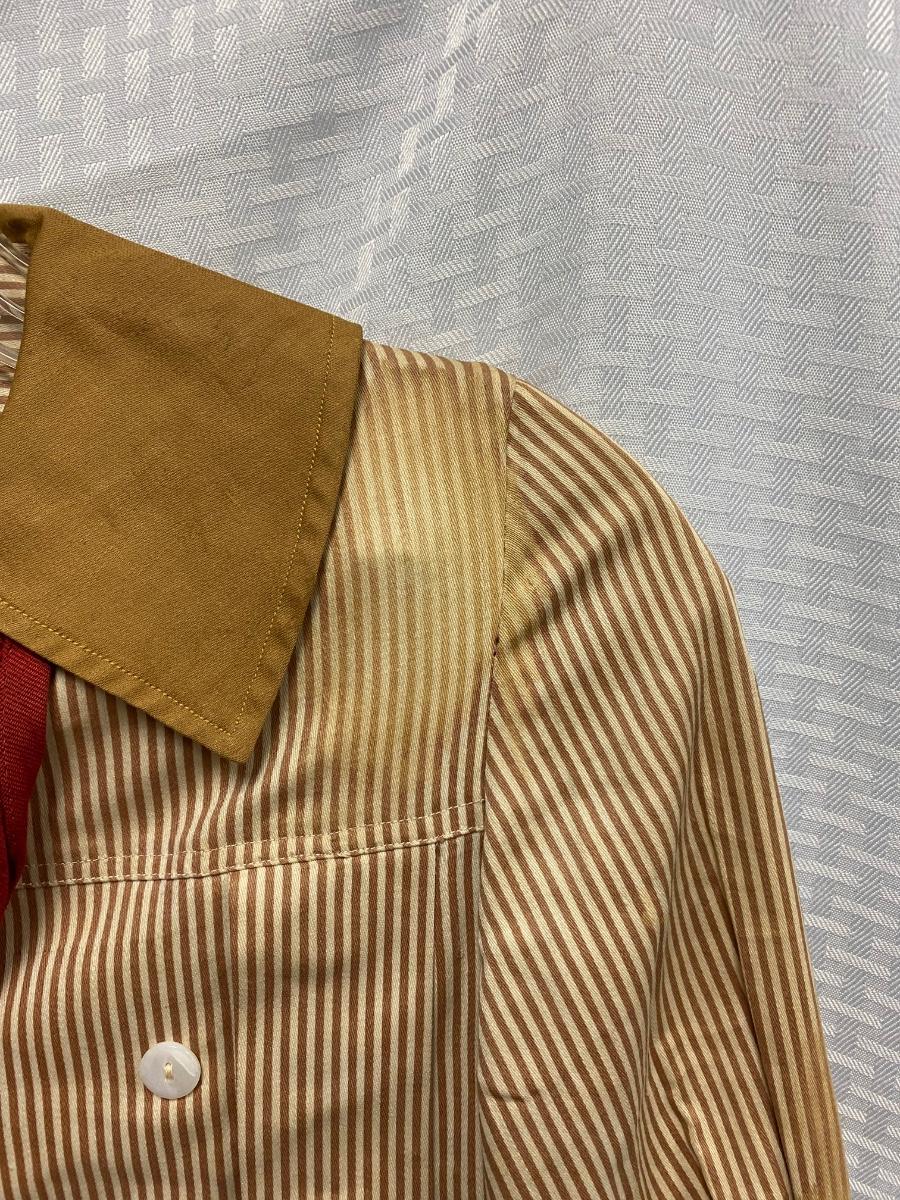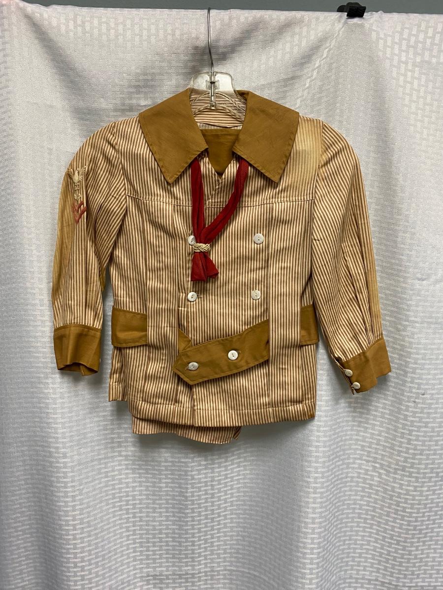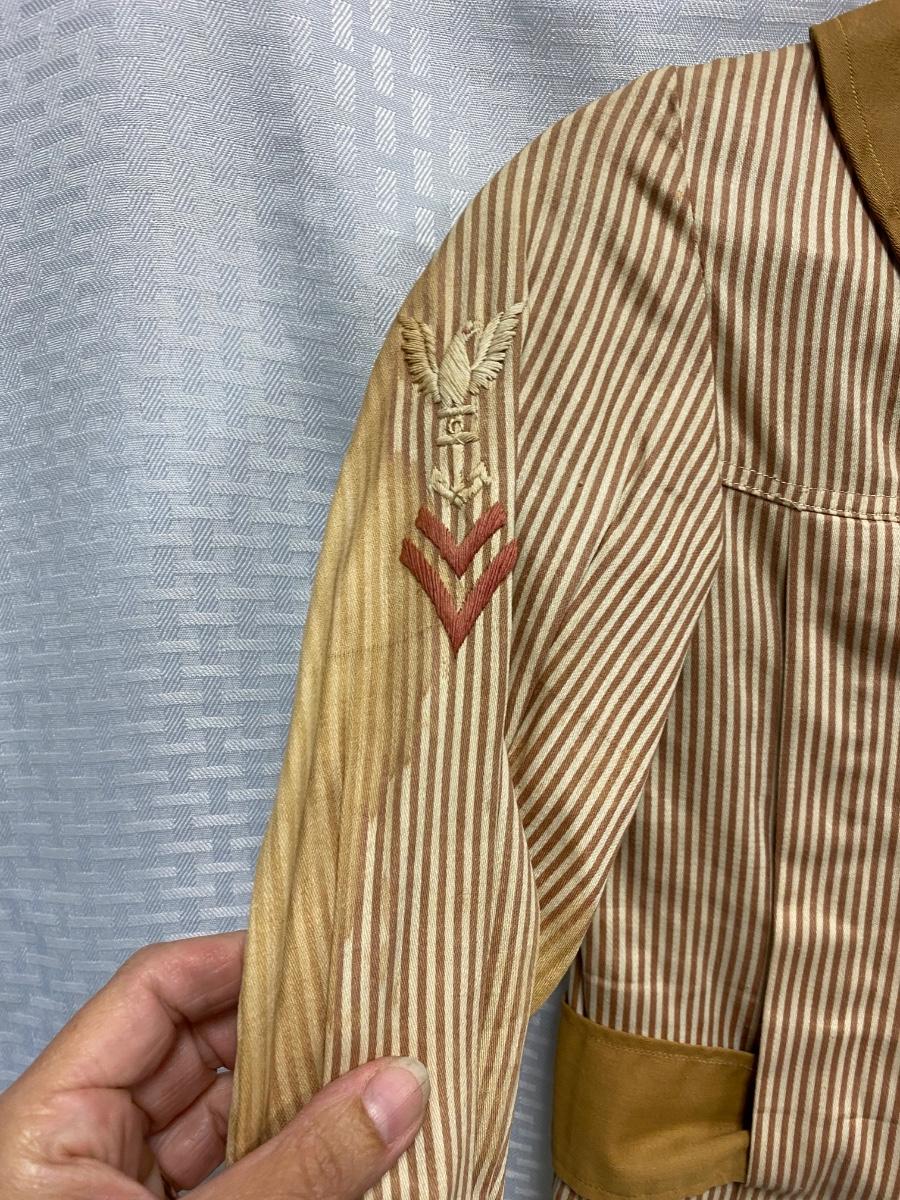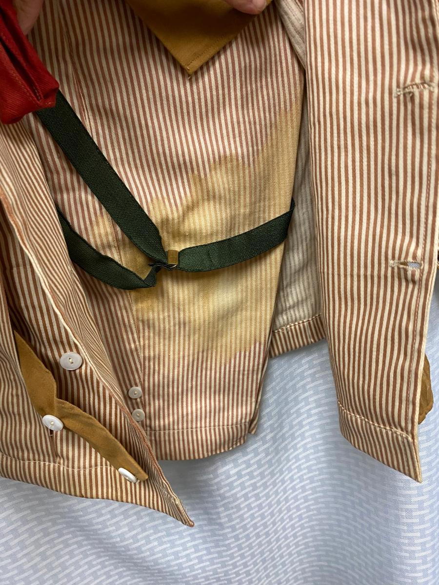 Antique Victorian Small Boy Toddler Two Piece Tan & White Striped Suit. No holes, but quite a few bleached out looking spots. Toddler size. Pants have suspenders but the elastic is bad. Despite the large spots the outfit is in wearable condition, heavy weight cotton.