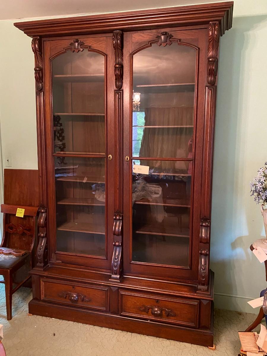 LOT 345 Antique Victorian Step Back Book Case/ Display Cabinet Good Condition 17x58x7 ft 6 in, Breaks Down For Easy Moving