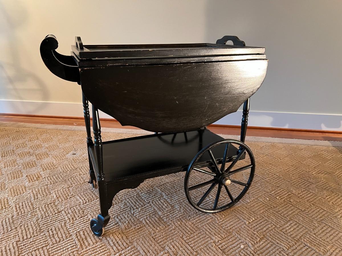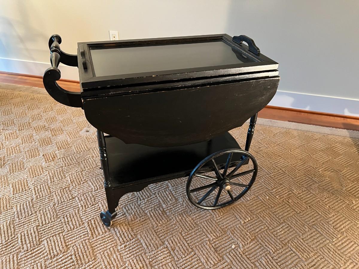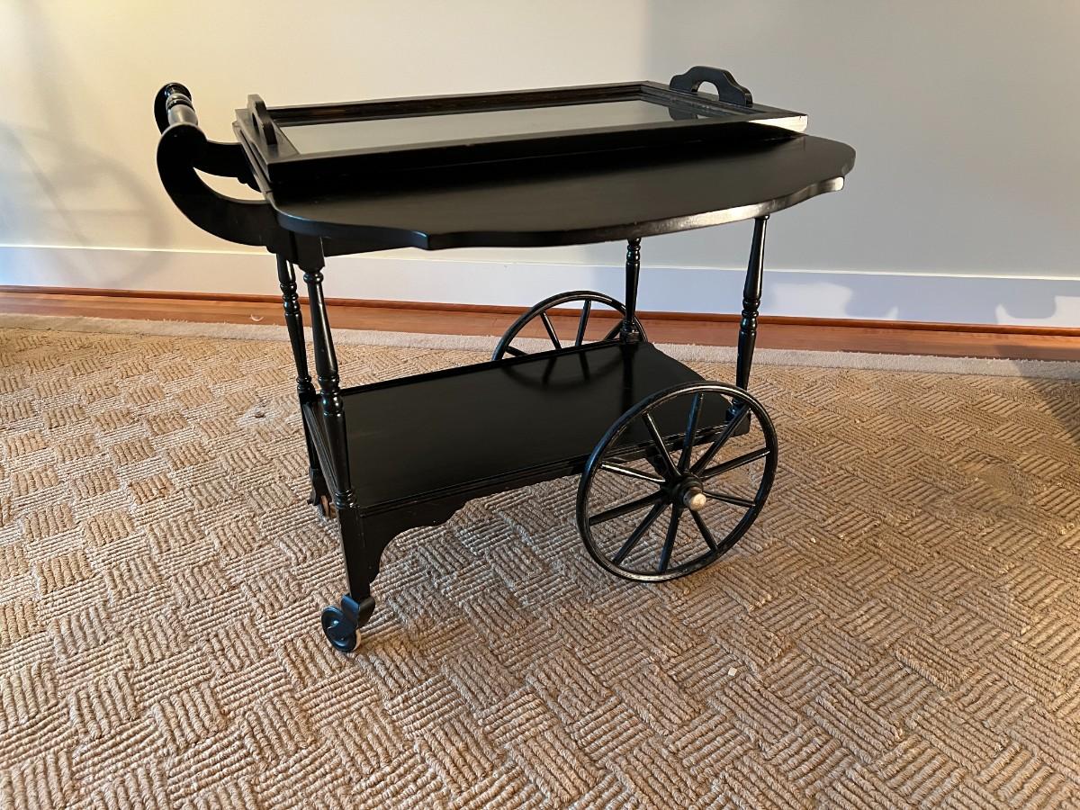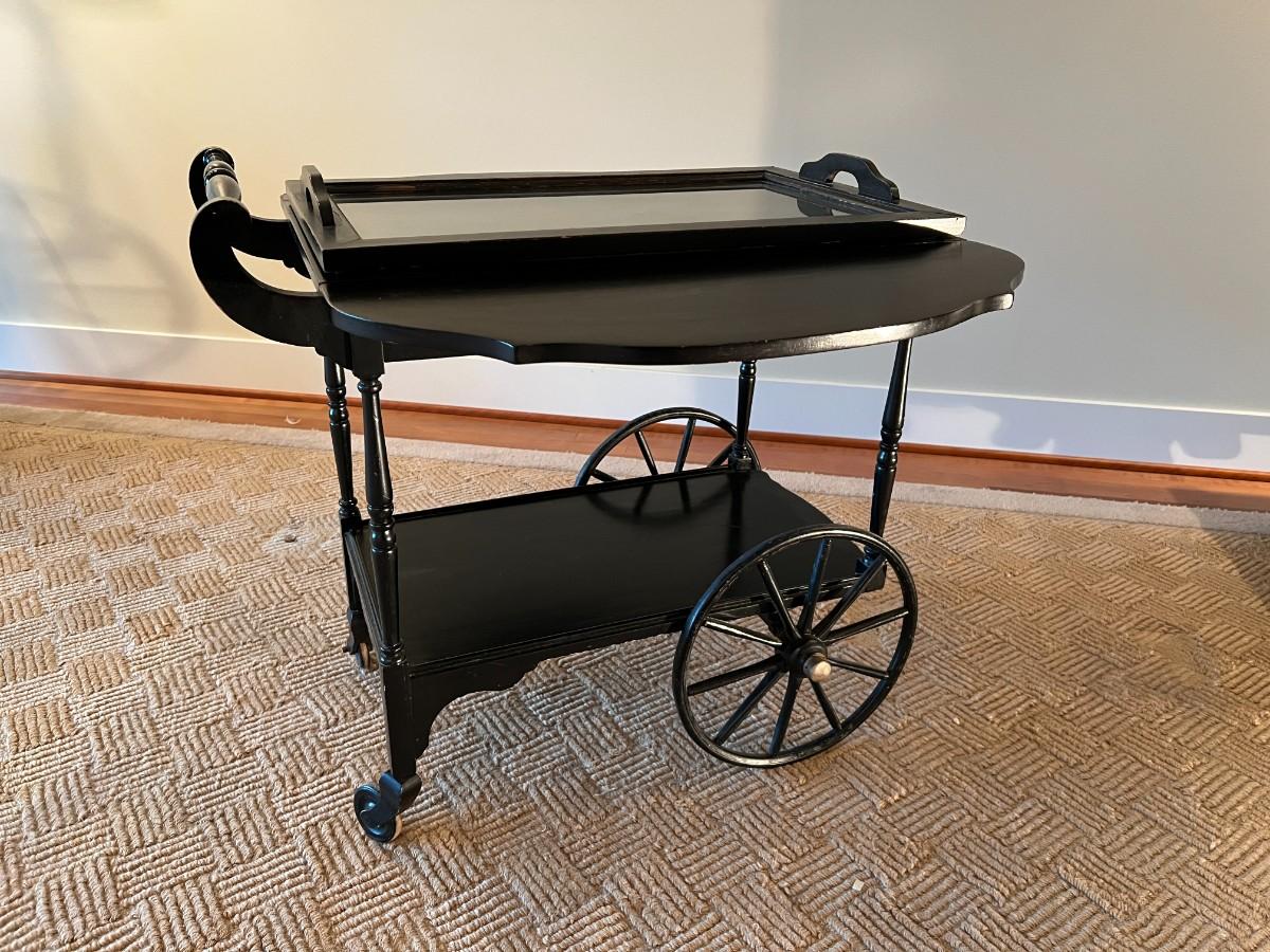 Antique Victorian Style Black Wood Expandable Bar Cart with Glass Tray