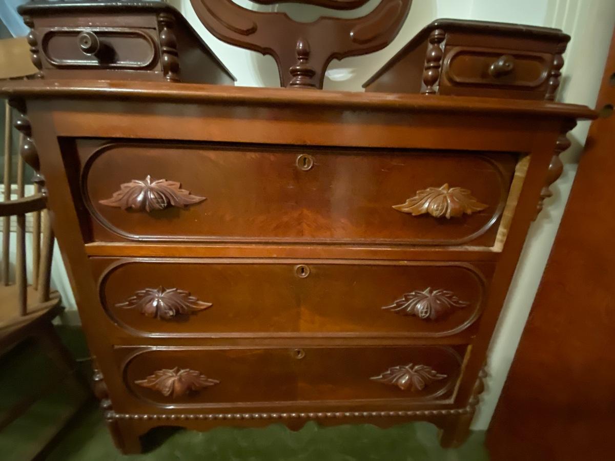 Beautiful Antique Victorian Style Burled Walnut 3-drawer dresser. Three full drawers with acorn pulls, and two small countertop drawers, tilt mirror. 68H x 38W x 18D. In very good condition. This 1800s dresser is from the client's grandmother's home on Magazine St. in New Orleans. YOU MUST BRING A DOLLY, BLANKETS, AND HELP TO MOVE THIS.