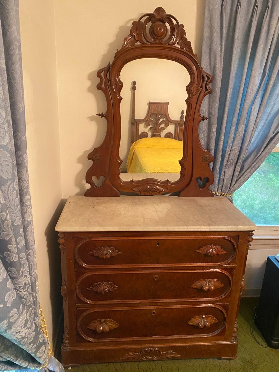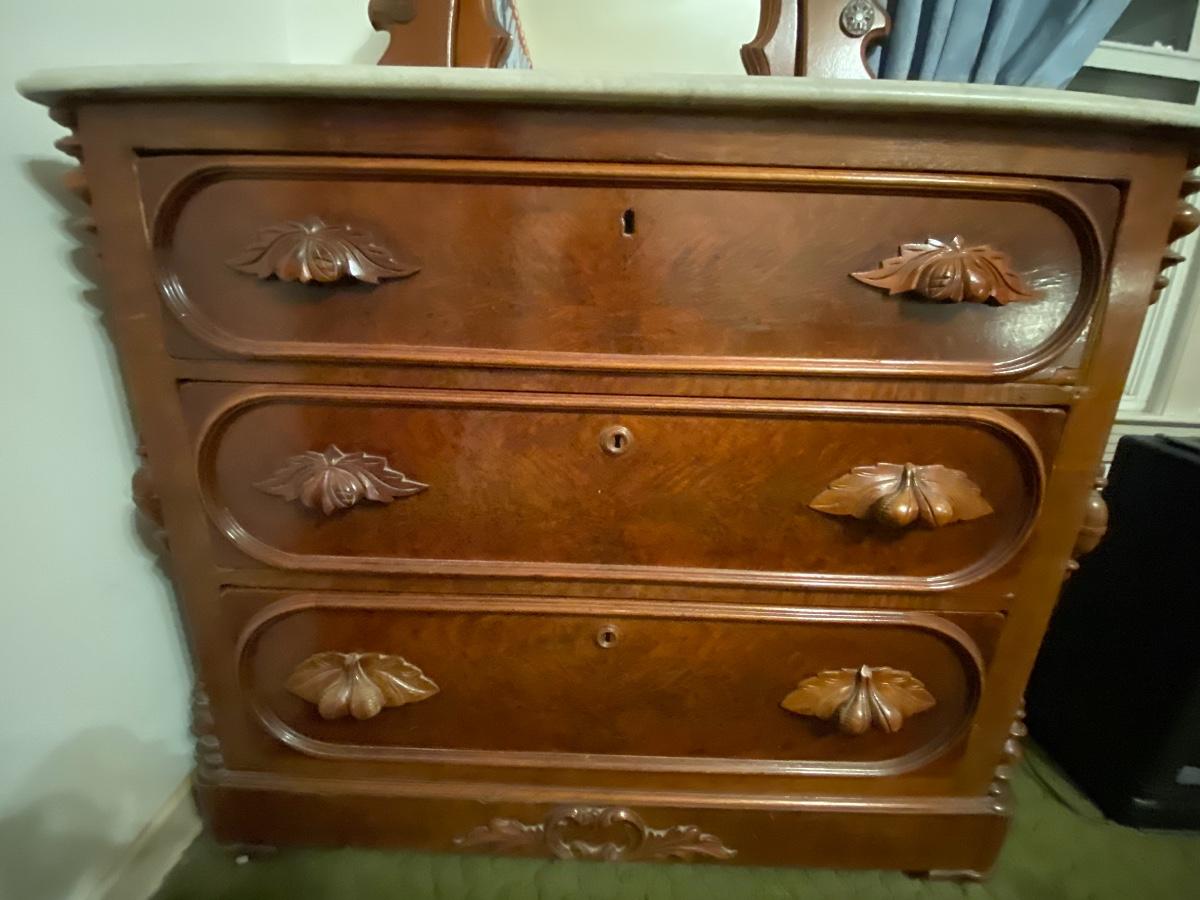Beautiful antique Victorian style marble top, burled walnut three drawer dresser with acorn pulls and tilt mirror. 79H x 42W x 19D. In very good condition. This 1800s dresser is from the client's grandmother's home on Magazine St. in New Orleans. YOU MUST BRING A DOLLY, BLANKETS, AND HELP TO MOVE THIS.