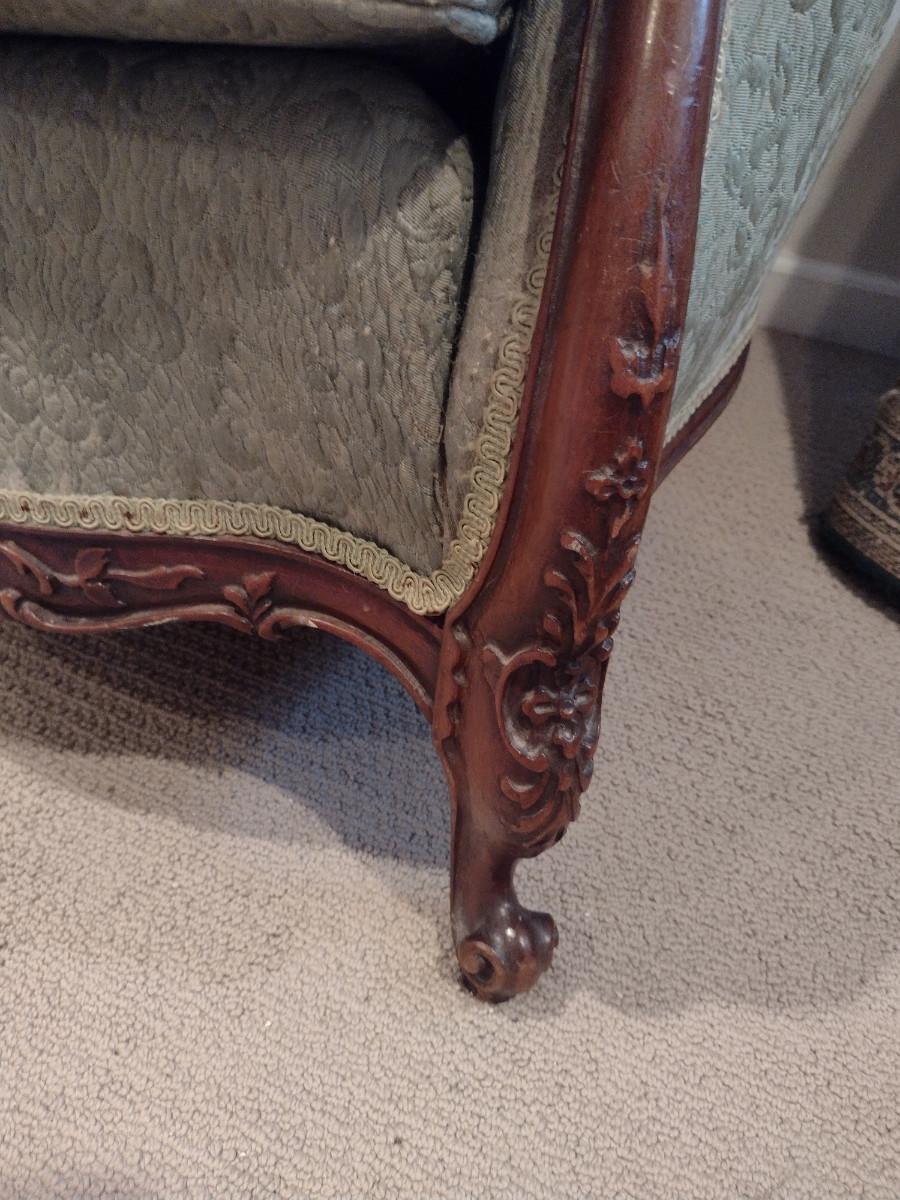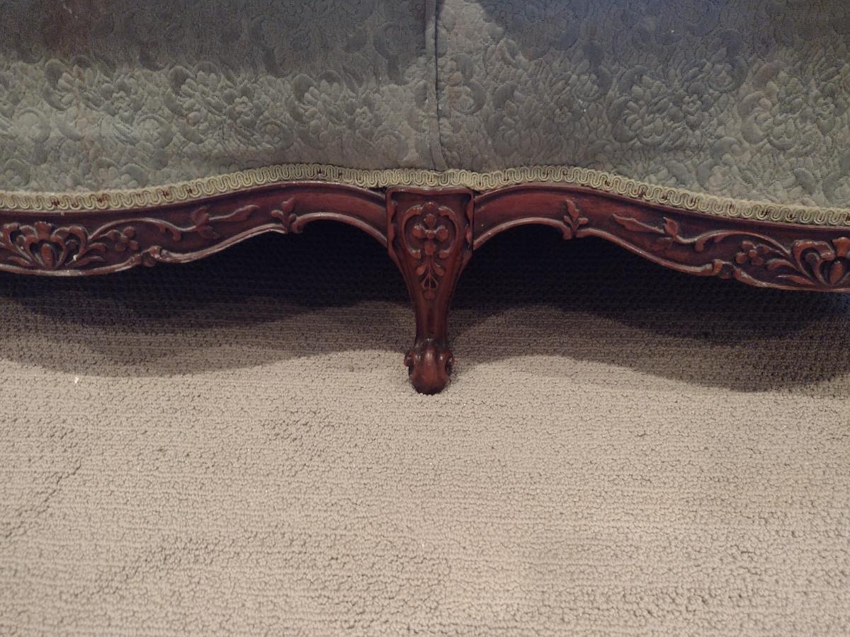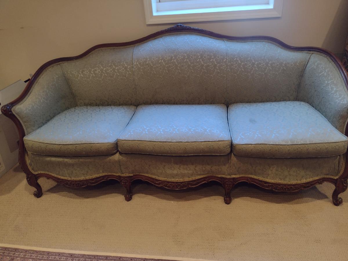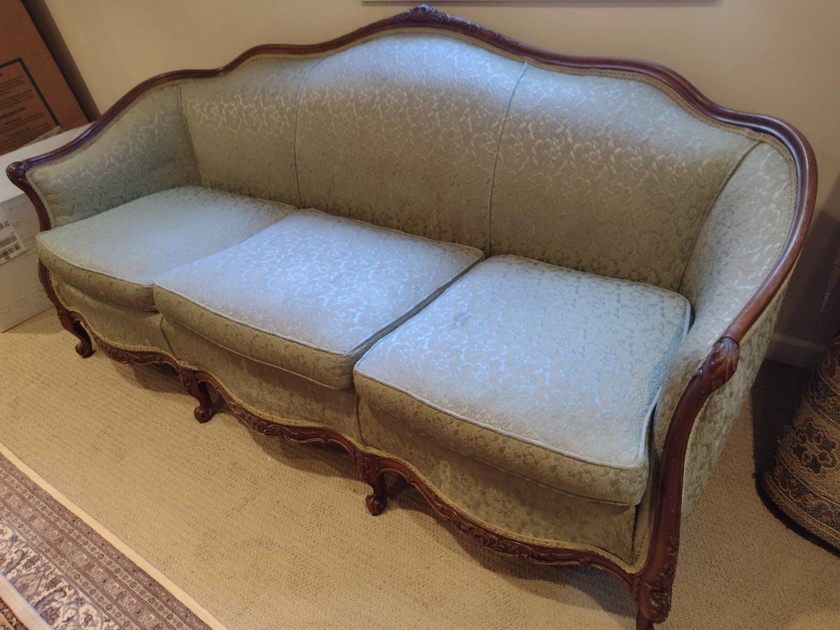 Antique Victorian Style Wood Framed Camel Back Sofa with Feather Filled Cushions- Approx 74" Long Item stored within feet of driveway for easy and quick load.