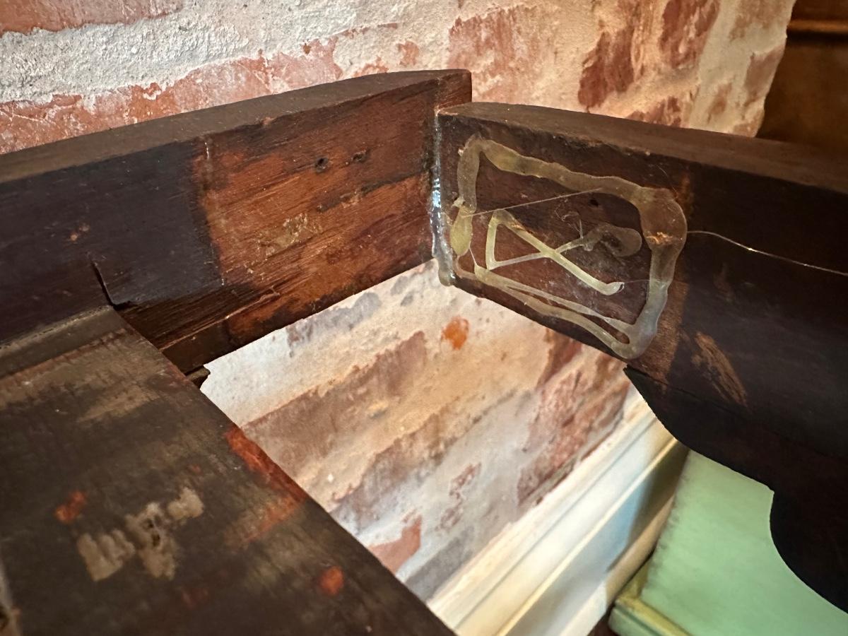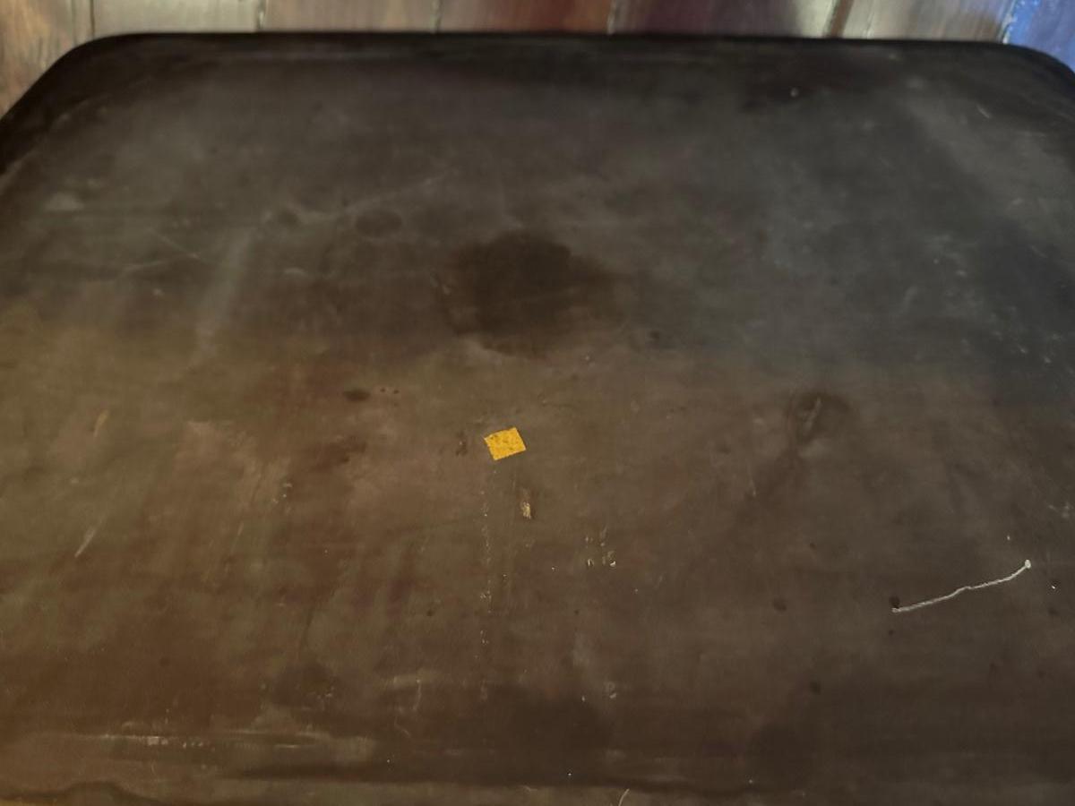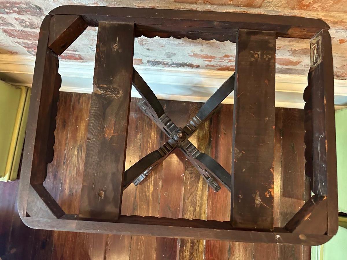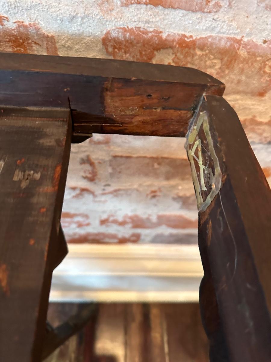 The wood has been repaired and the table is shaky, could use work to make it sturdy. One inside corner wood piece is missing and can be replaced, see pictures for reference.
