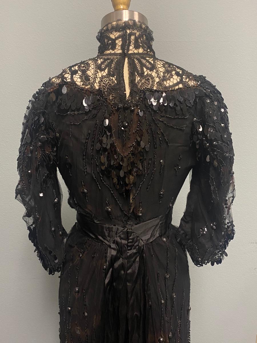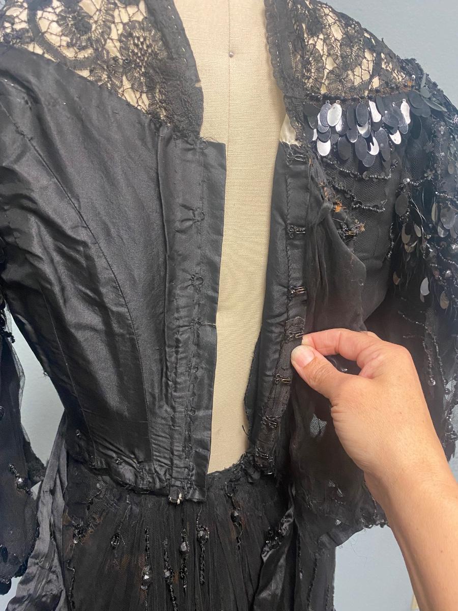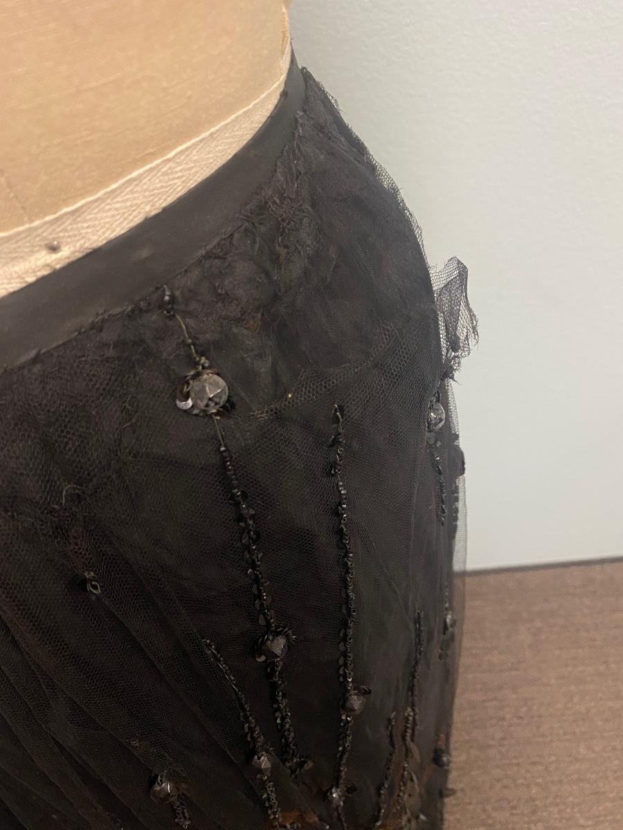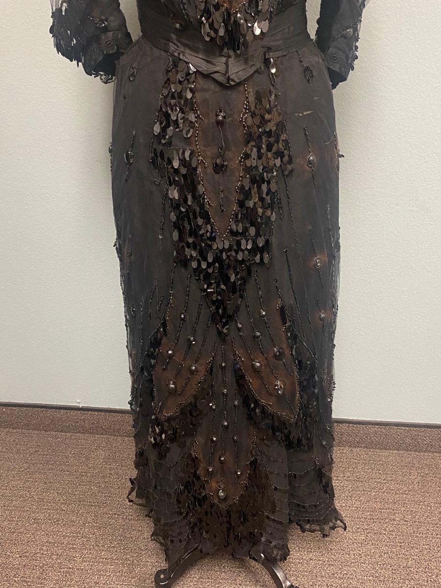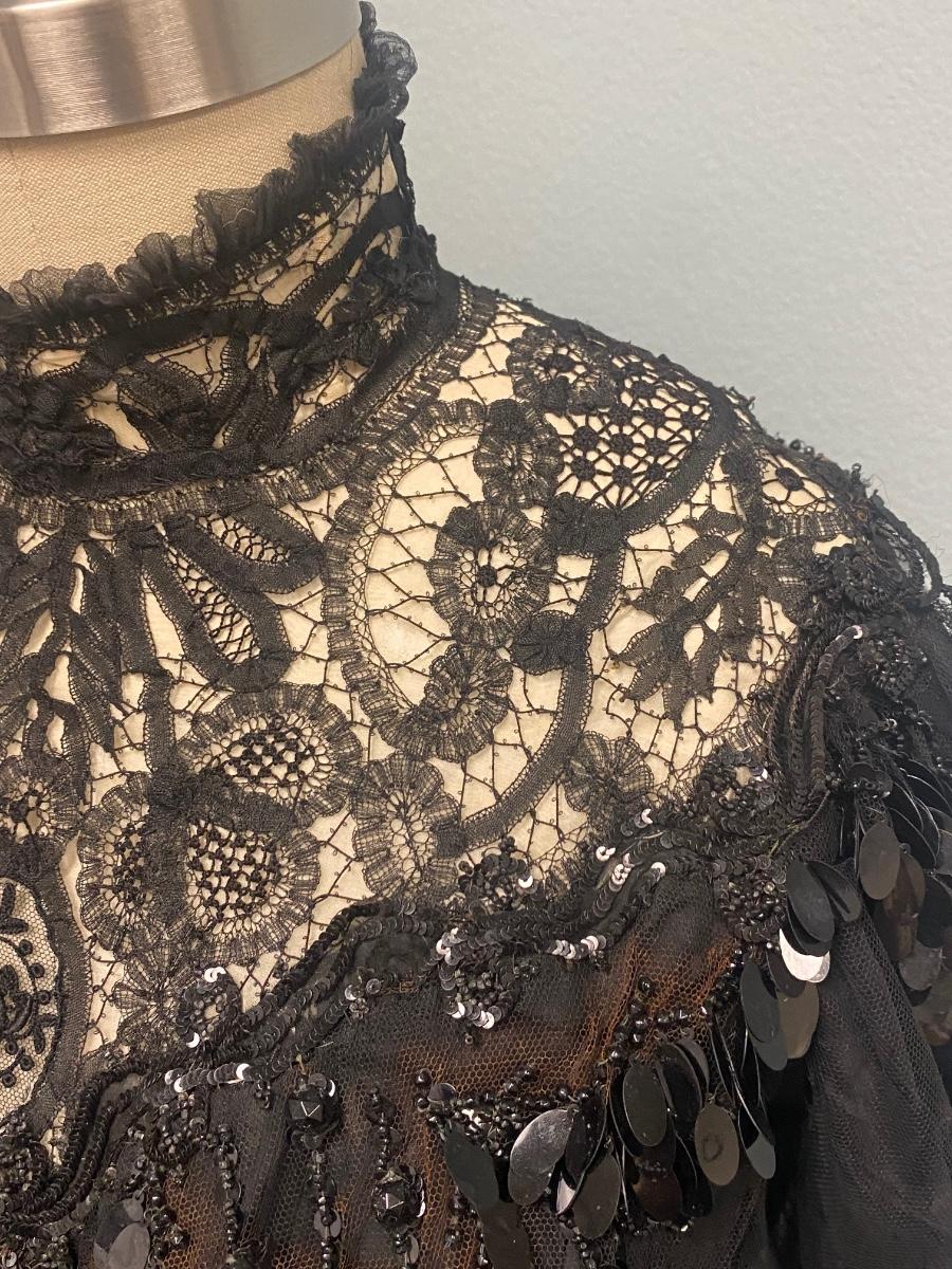 Antique Victorian Two Piece Beaded Gothic Fancy Mourning Dress Outfit. Heavily beaded bodice and skirt. There is discolor/fade mainly around the bead work. In vintage condition, lace and fabric is delicate, and beads are falling off if not handled carefully. There may be holes in the lace. Great for costume or reference pattern. Snug size 8.