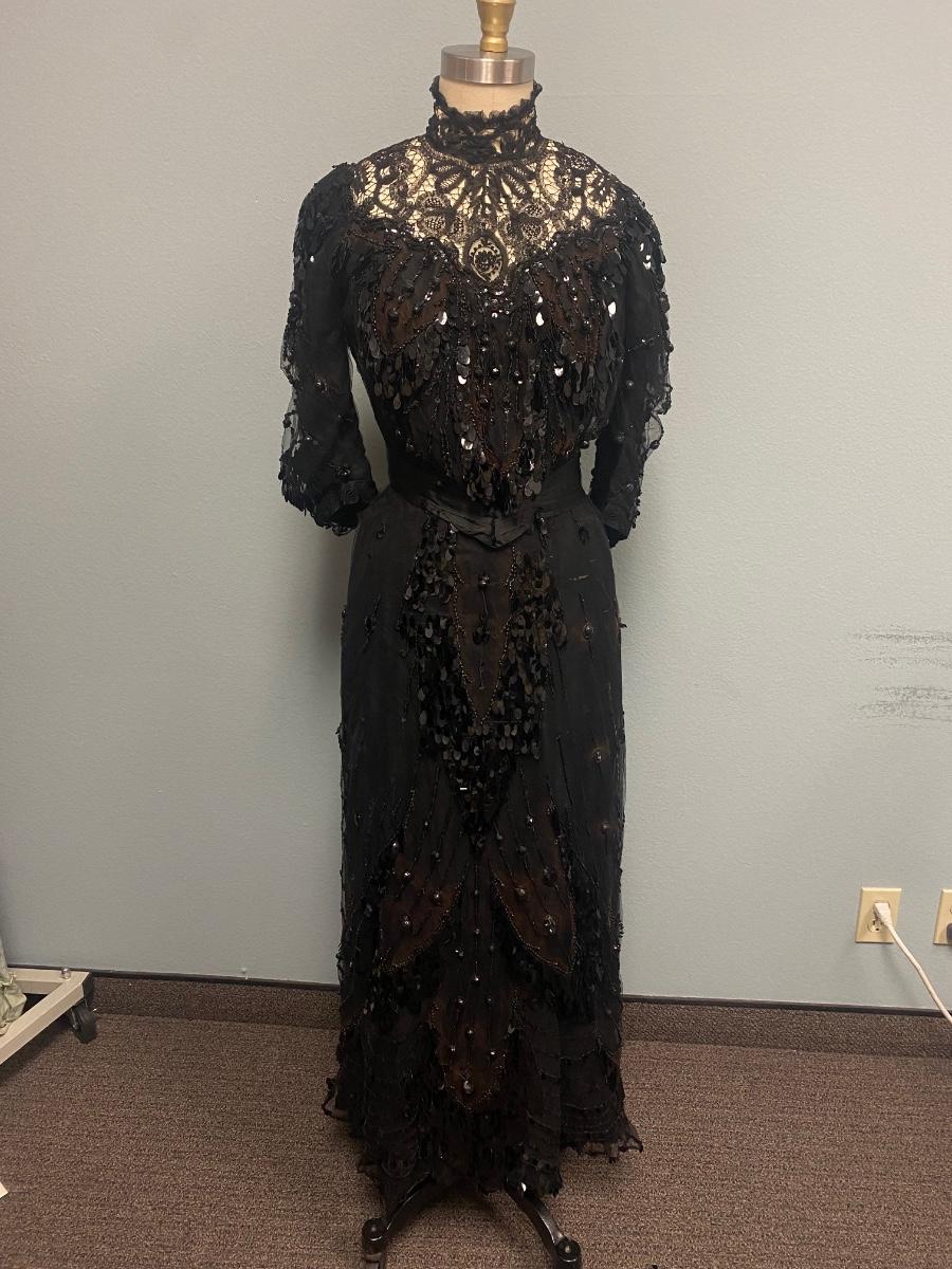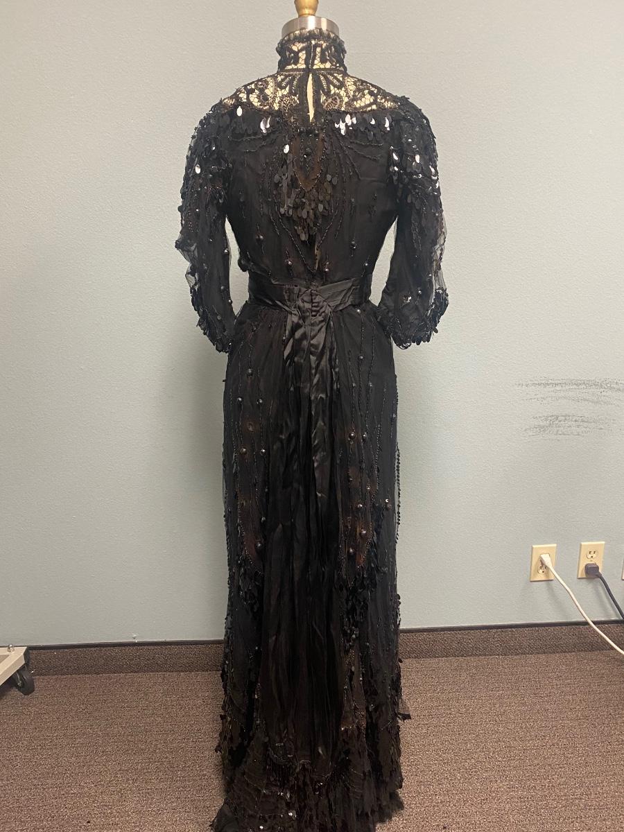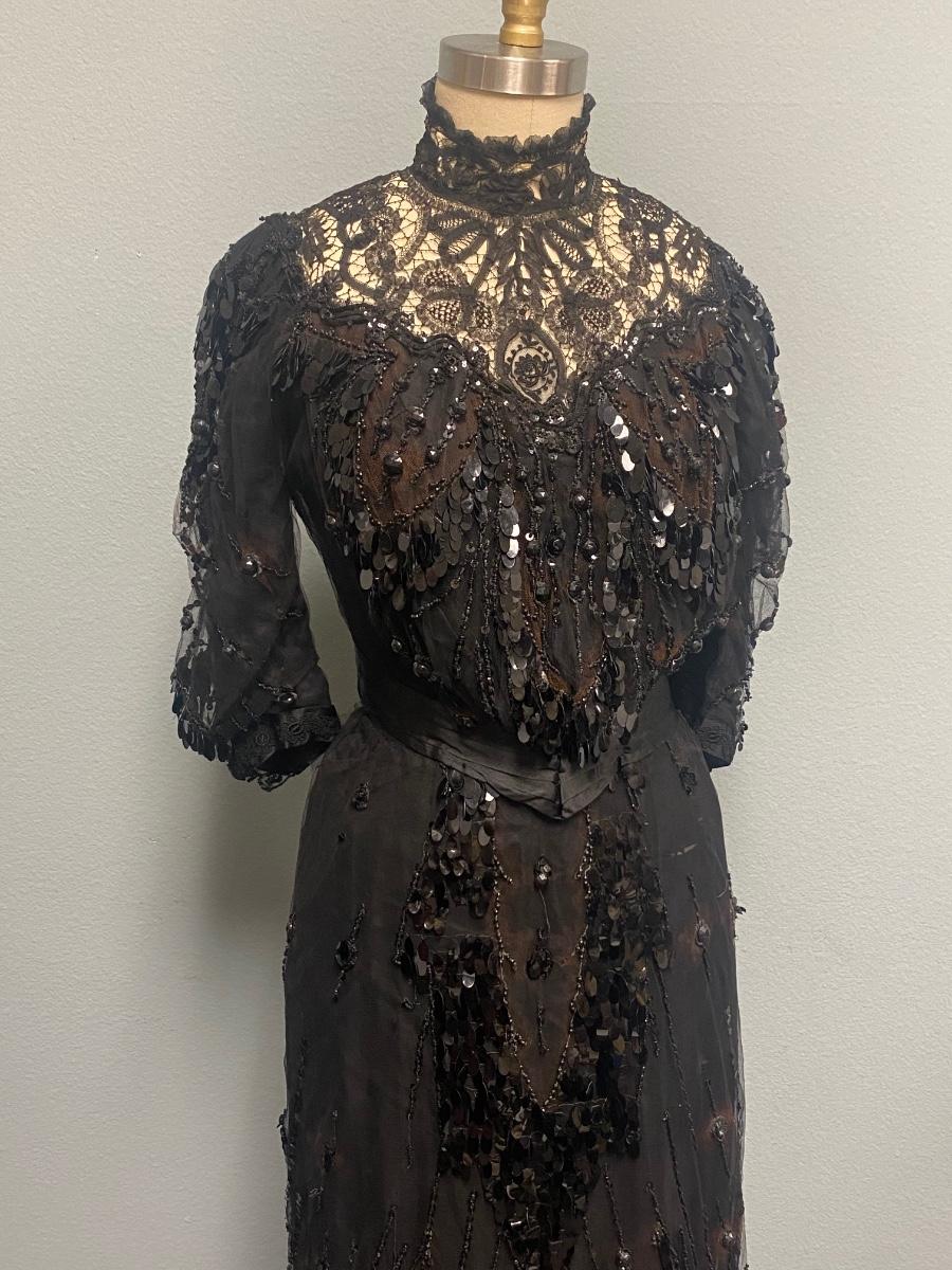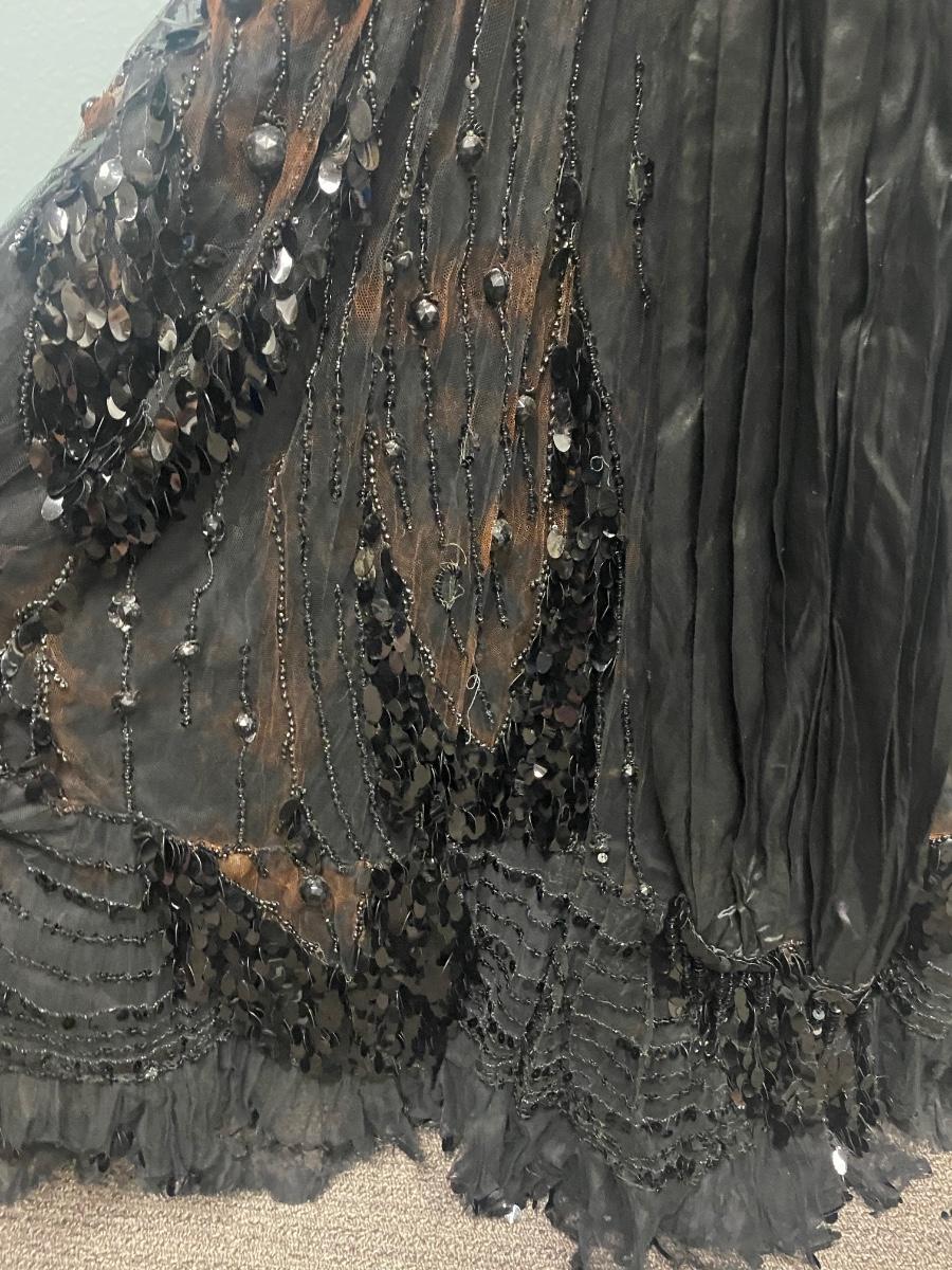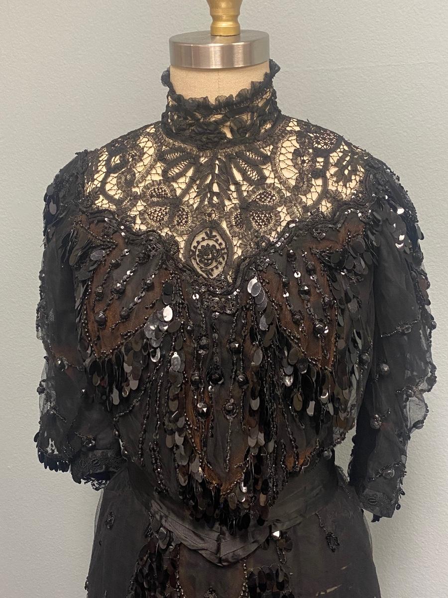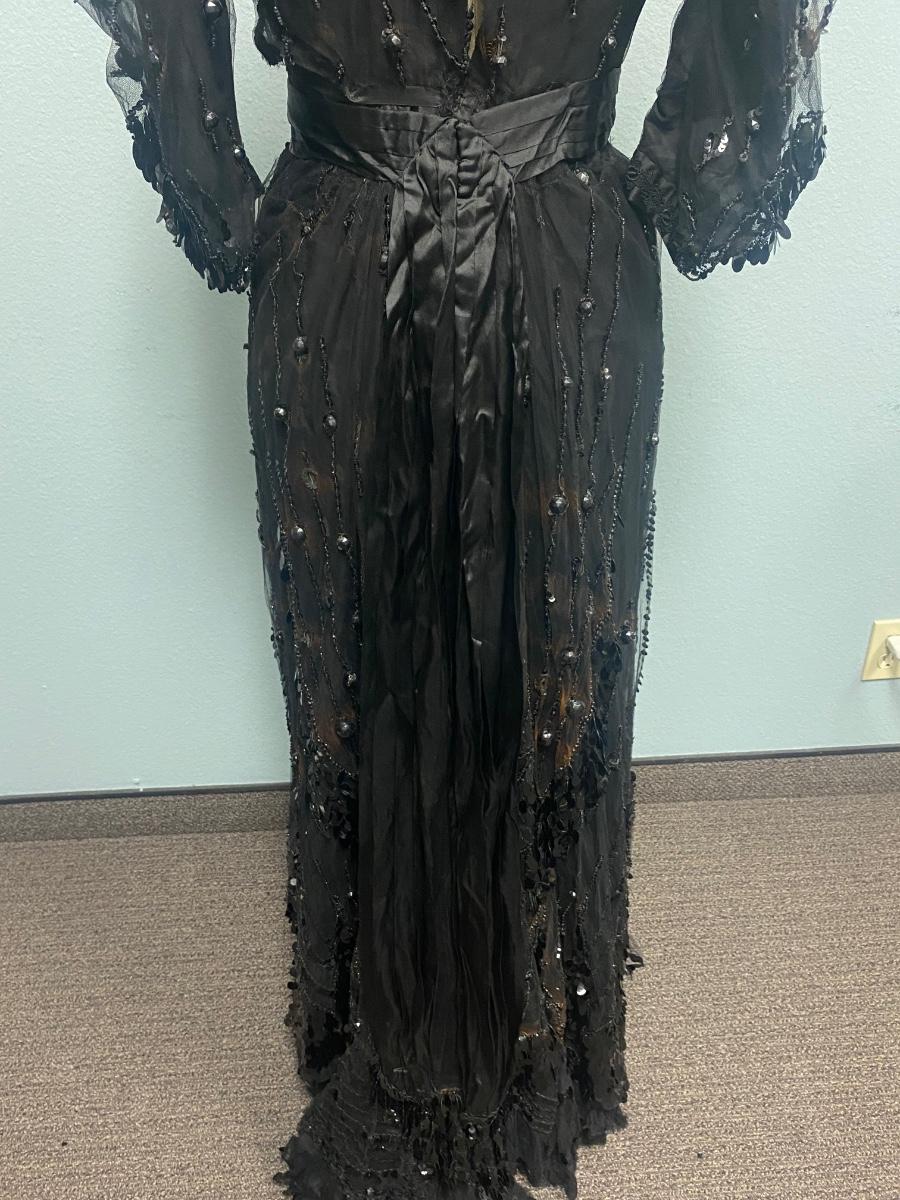 Antique Victorian Two Piece Beaded Gothic Fancy Mourning Dress Outfit. Heavily beaded bodice and skirt. There is discolor/fade mainly around the bead work. In vintage condition, lace and fabric is delicate, and beads are falling off if not handled carefully. There may be holes in the lace. Great for costume or reference pattern. Snug size 8.