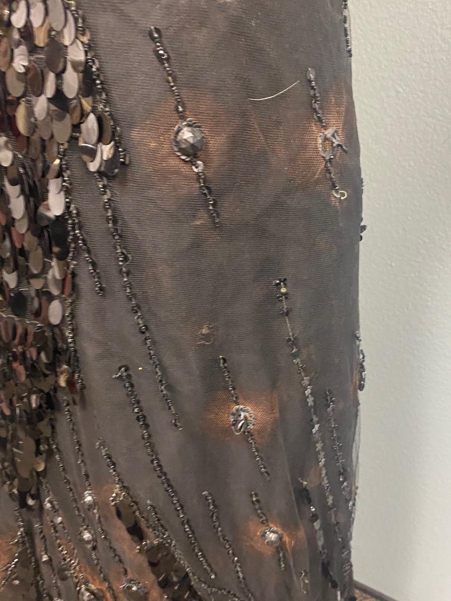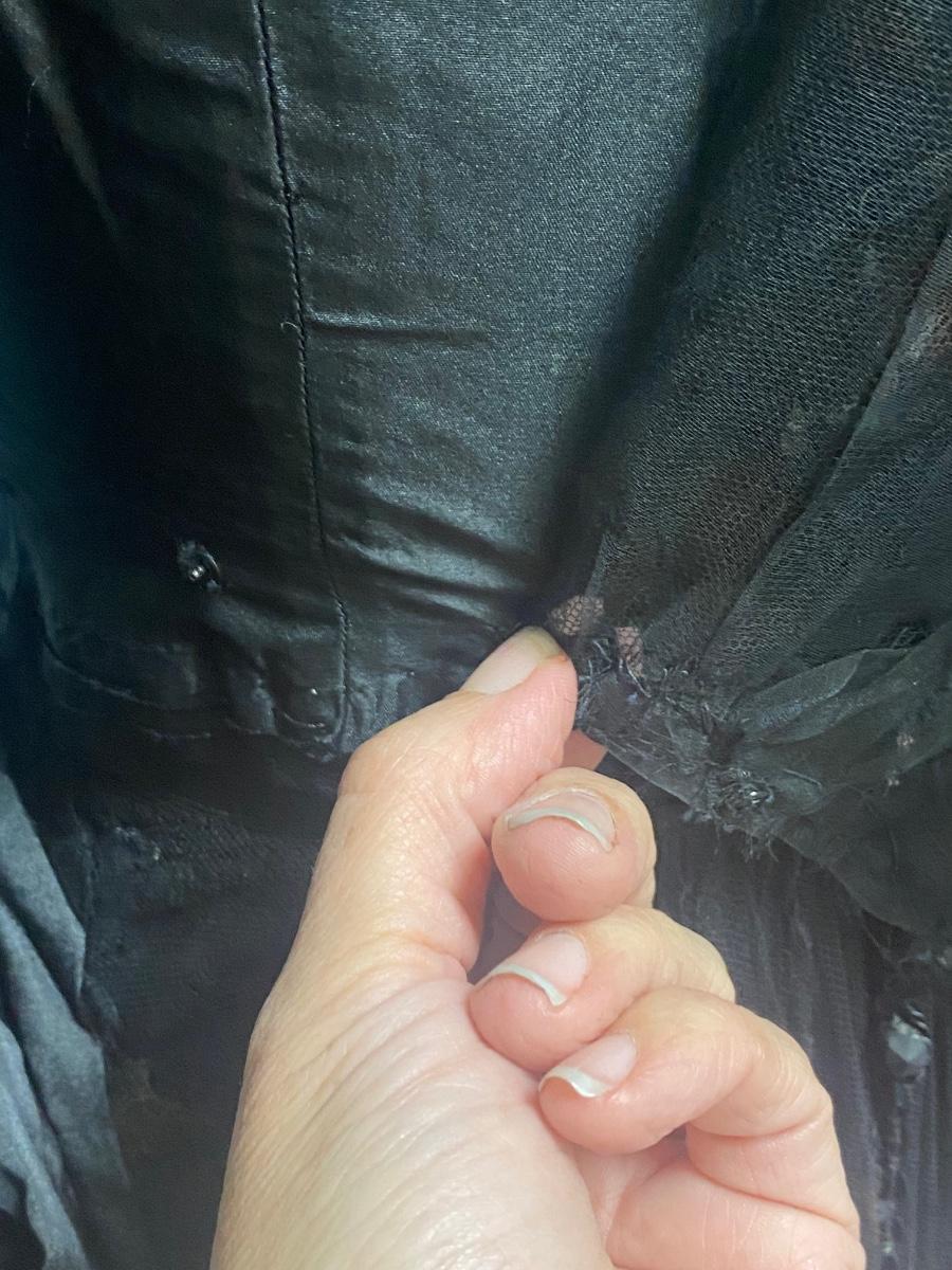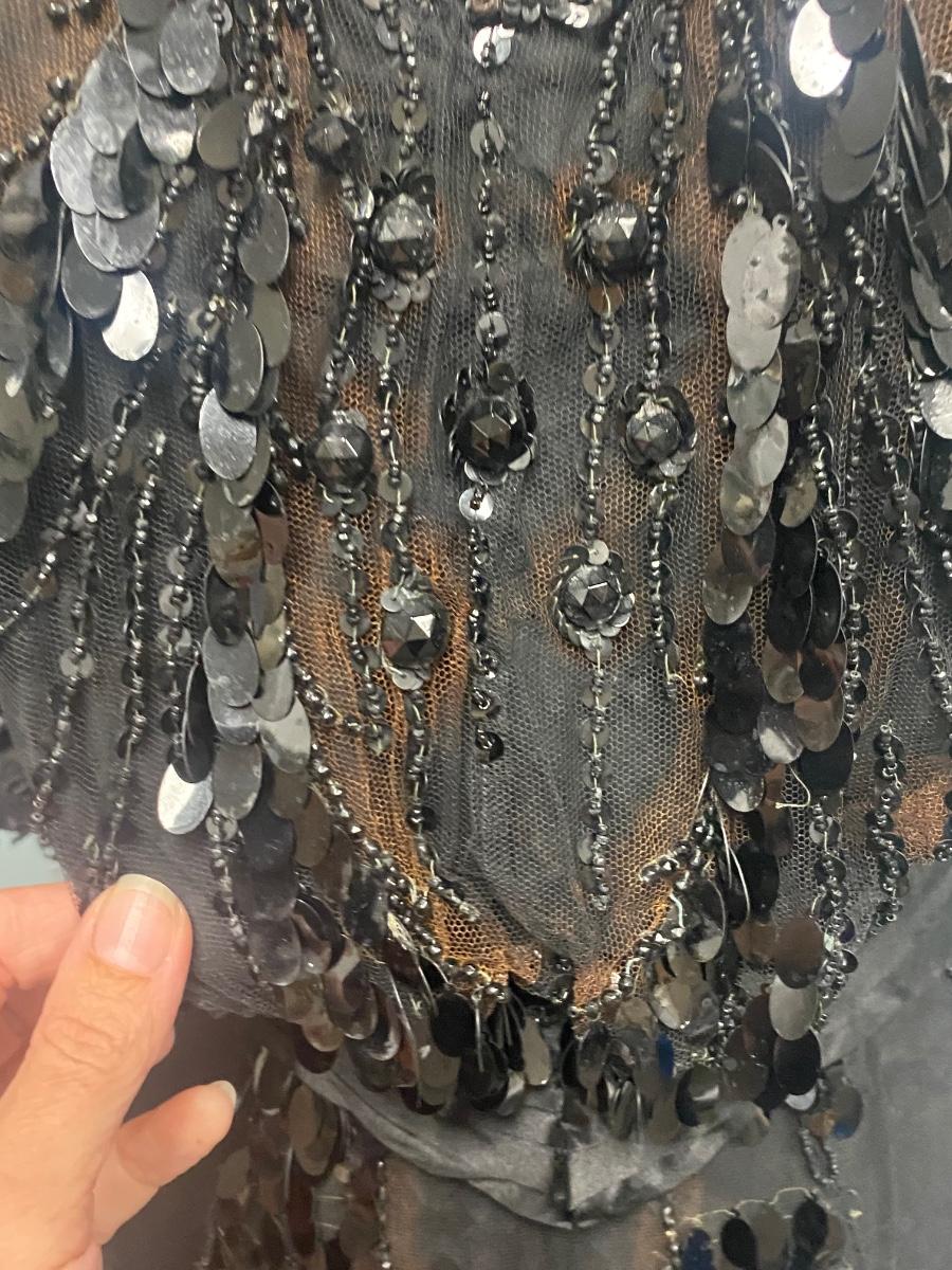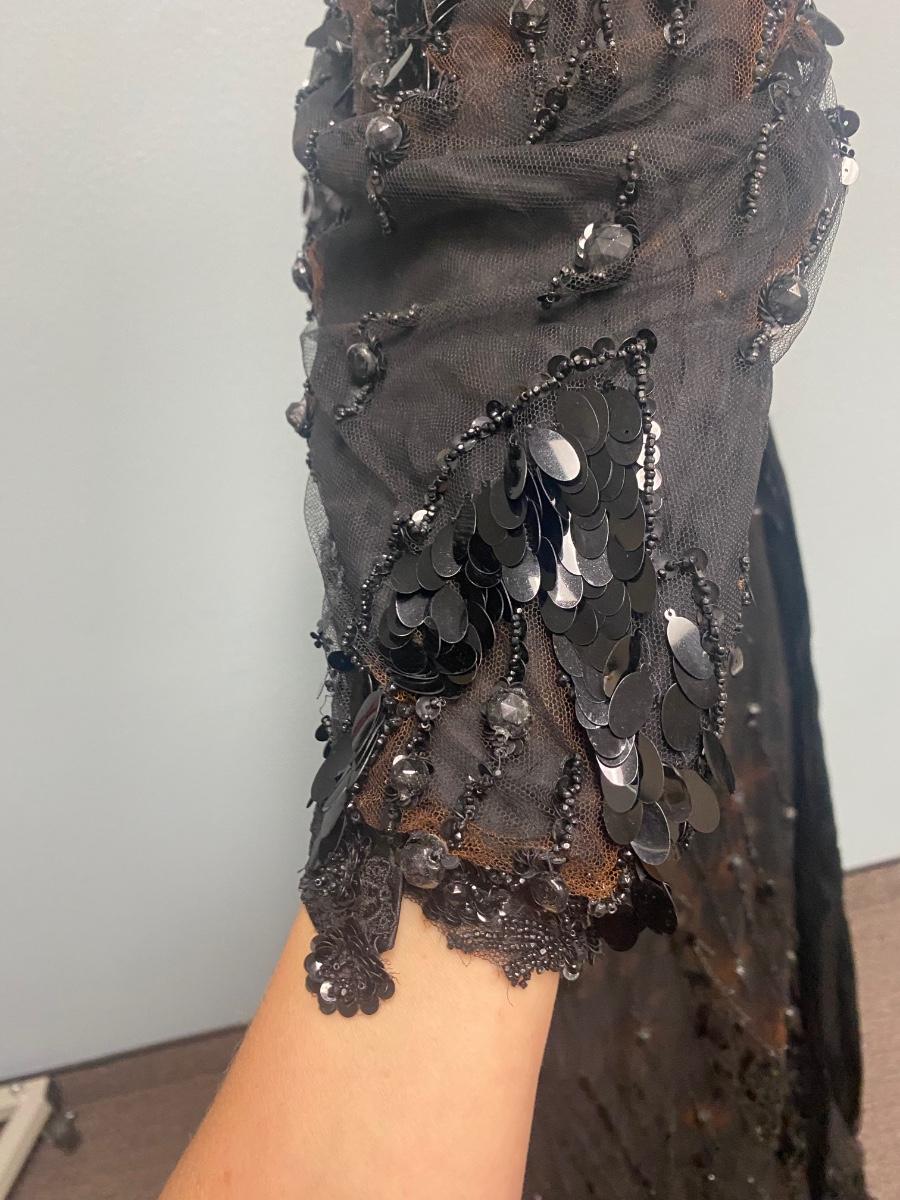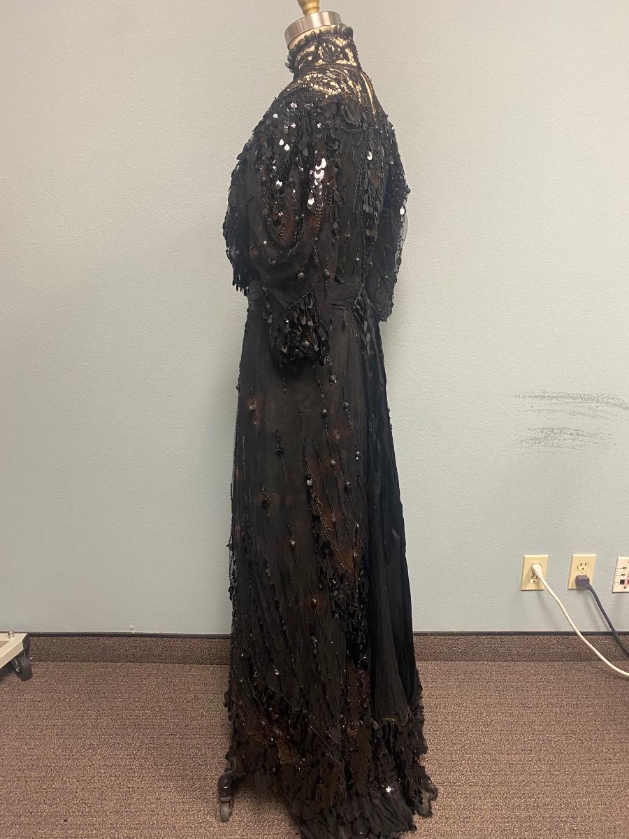 Antique Victorian Two Piece Beaded Gothic Fancy Mourning Dress Outfit. Heavily beaded bodice and skirt. There is discolor/fade mainly around the bead work. In vintage condition, lace and fabric is delicate, and beads are falling off if not handled carefully. There may be holes in the lace. Great for costume or reference pattern. Snug size 8.