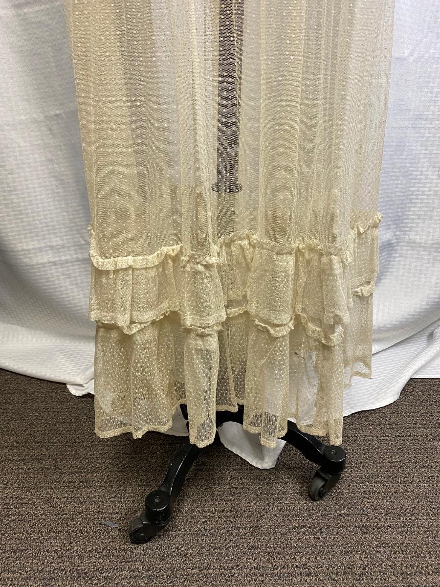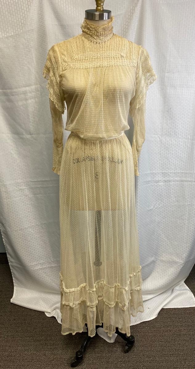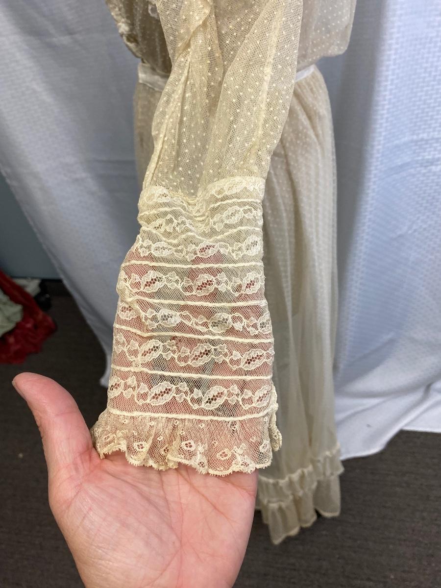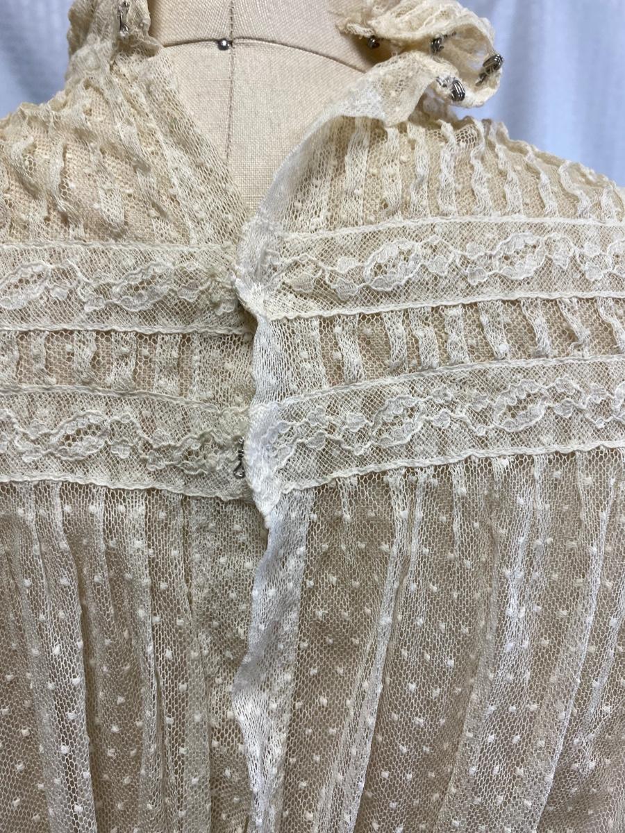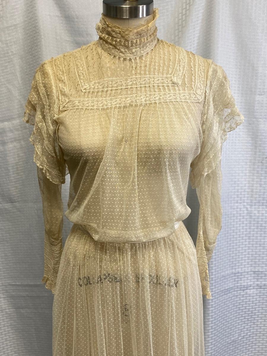 Antique Victorian Two Piece Dotted Lace Blouse & Skirt Boho Romantic Prairie Style. In good antique condition. Matching set does have some discolor normal for the age. No serious staining or holes. Hook and eye closure. The blouse has an unfinished bottom hem. About a size 8 could probably be refitted with the hook and eye closure. Part of a large Victorian collection currently on consignment that is being auctioned.