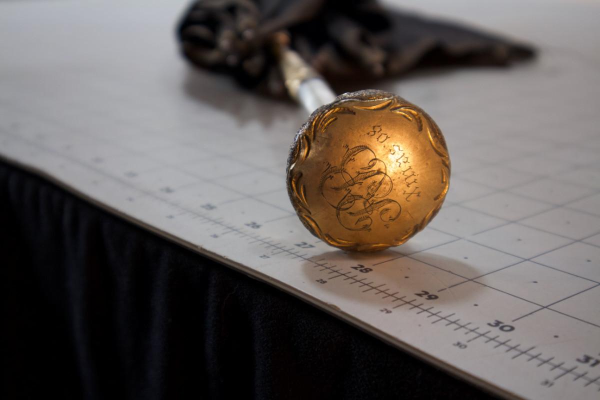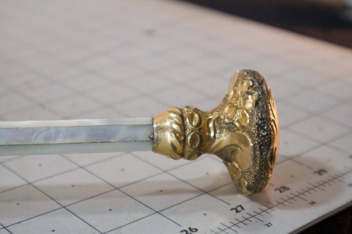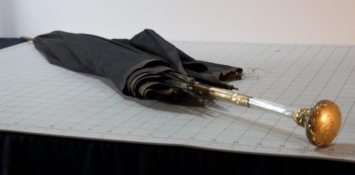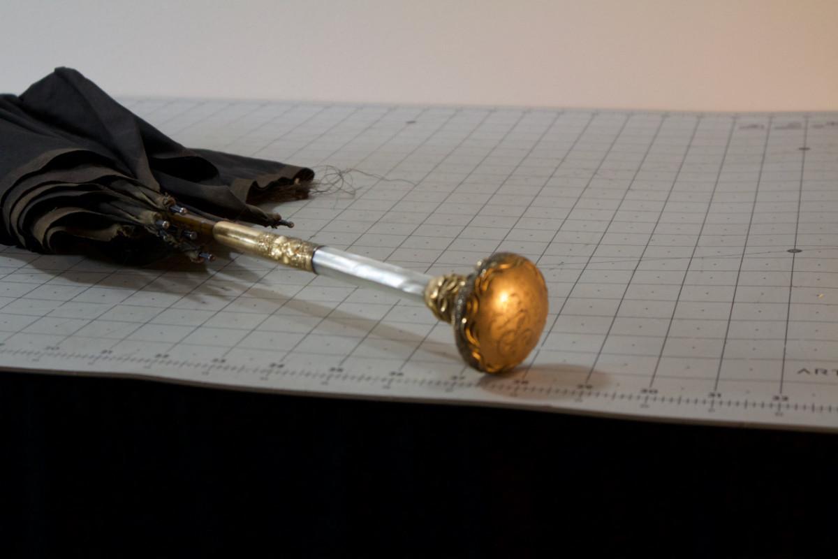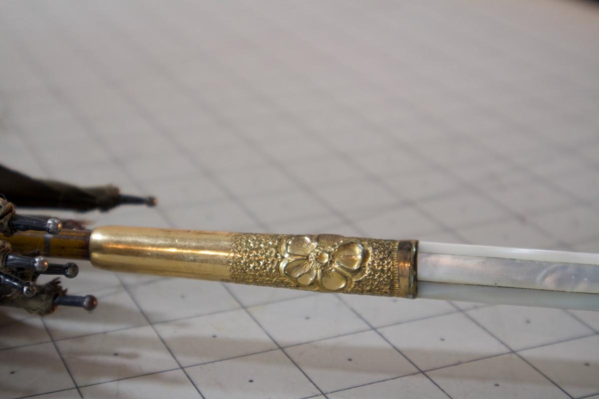 Antique Victorian Umbrella, Black with Gold Plated and Mother of Pearl Handle Dated 1908