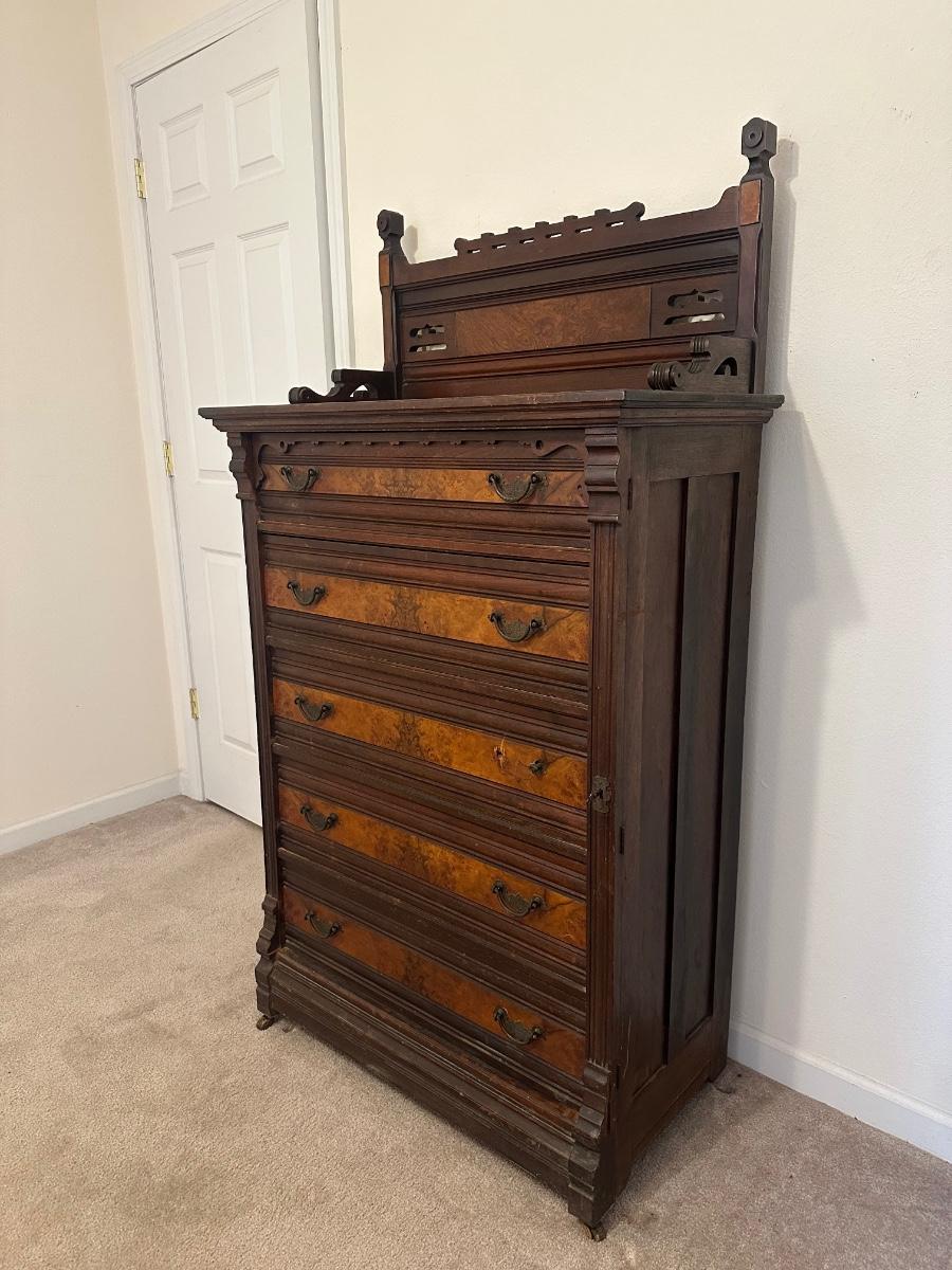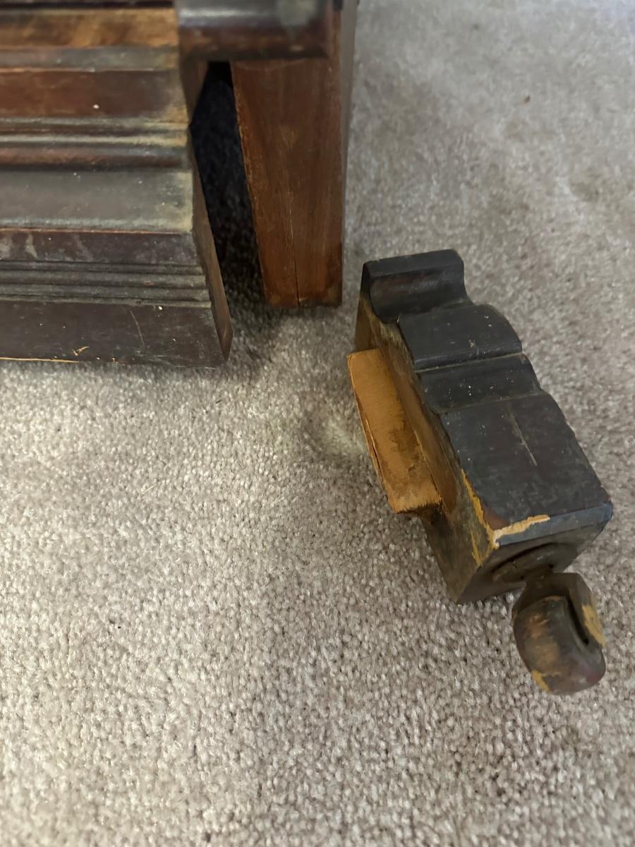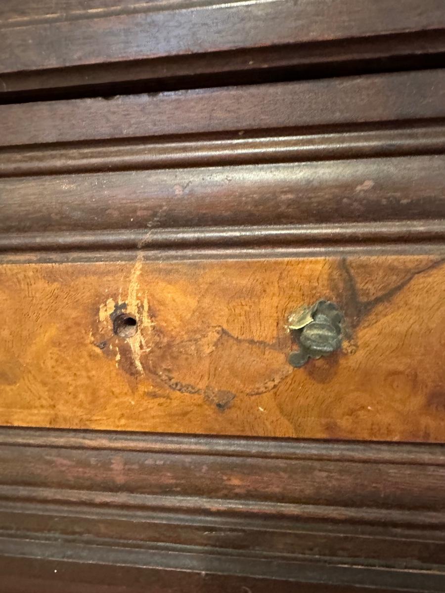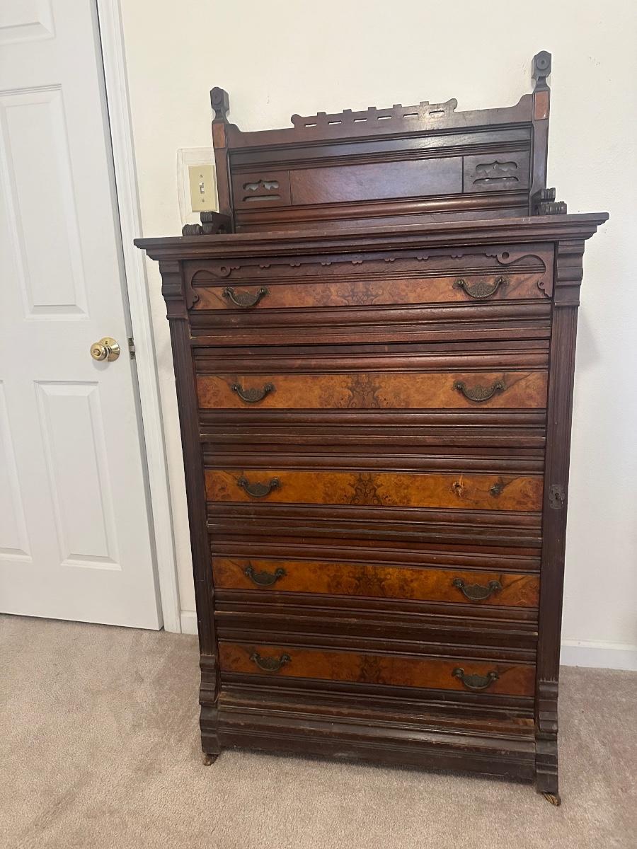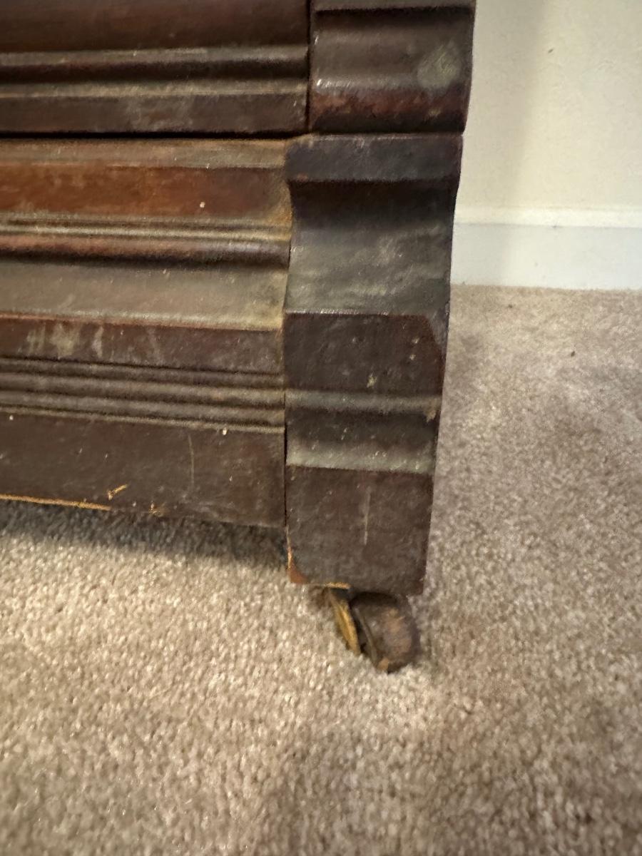 This is a fixer upper. Front right leg is broken but still sits underneath. The back left wheel is missing, but that can easily be replaced. One handle is missing. The lockside works and will lock drawers from opening. Small crack on top, see last pictures.