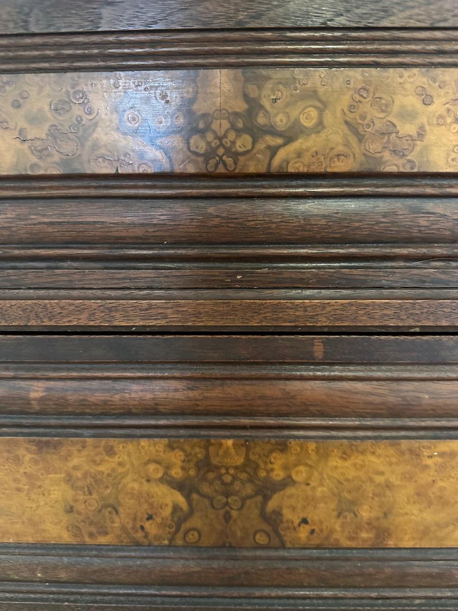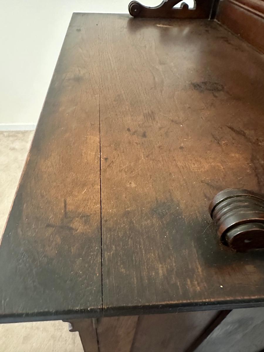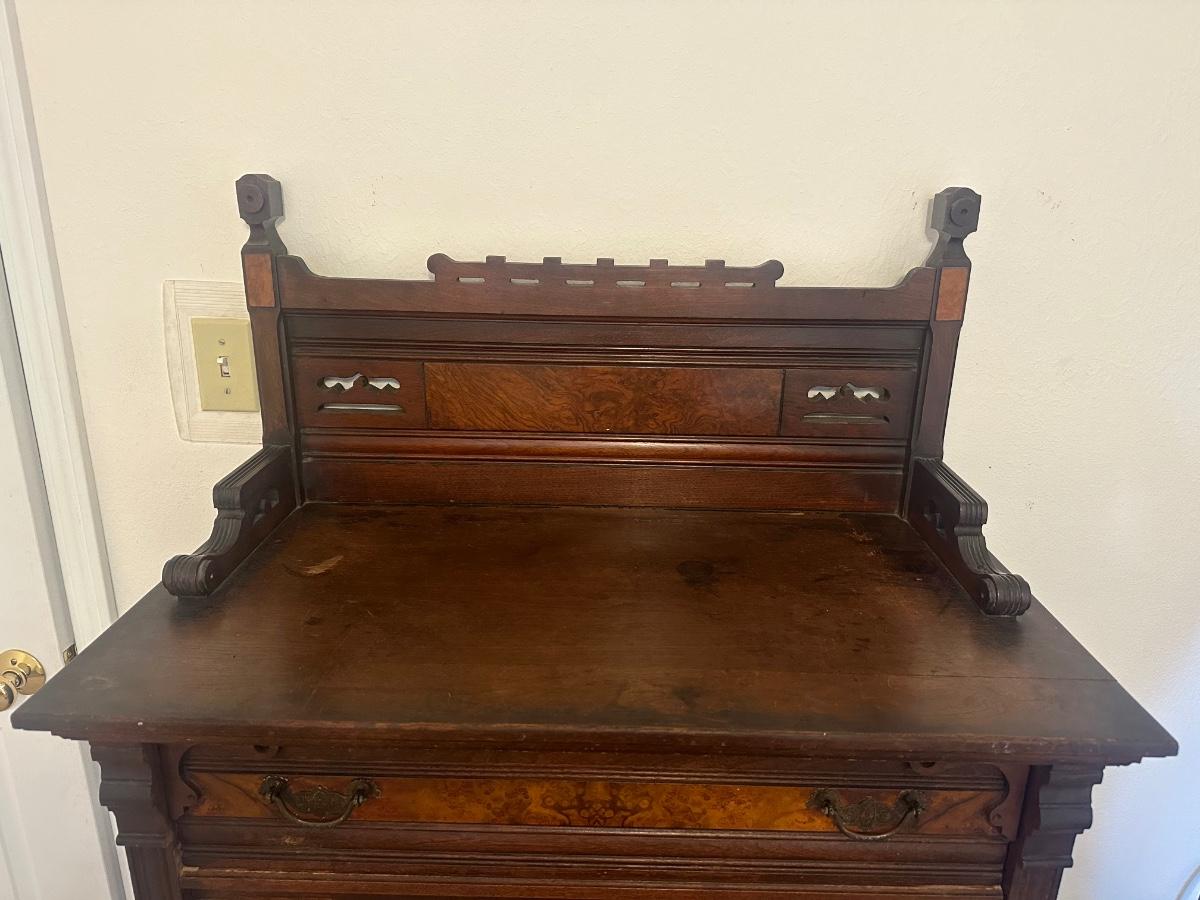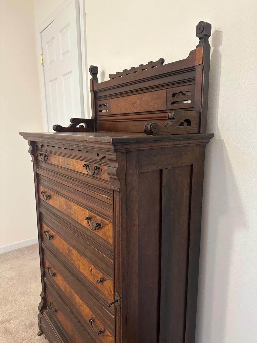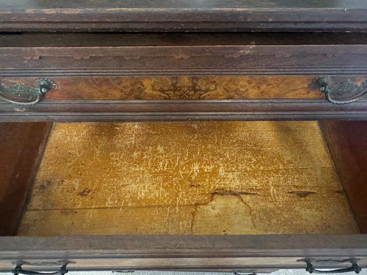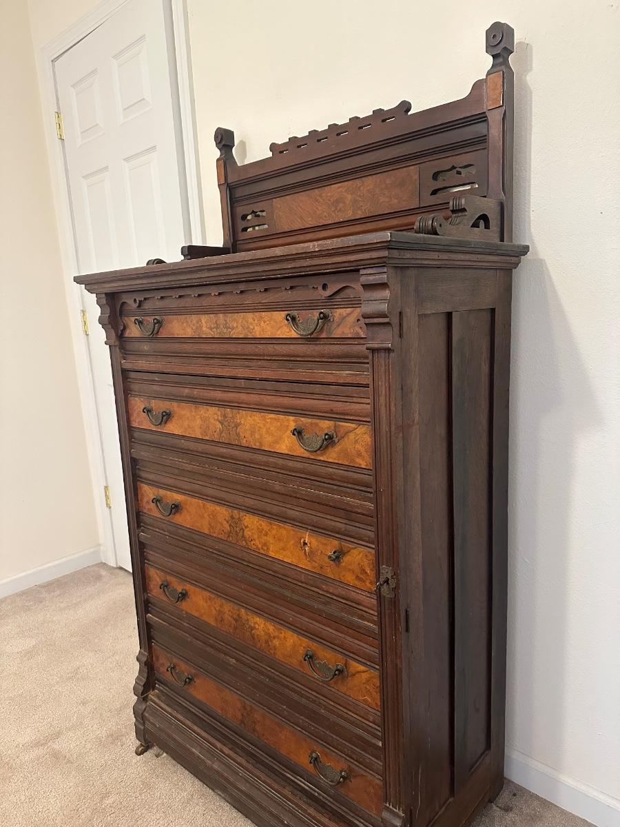 This is a fixer upper. Front right leg is broken but still sits underneath. The back left wheel is missing, but that can easily be replaced. One handle is missing. The lockside works and will lock drawers from opening. Small crack on top, see last pictures.
