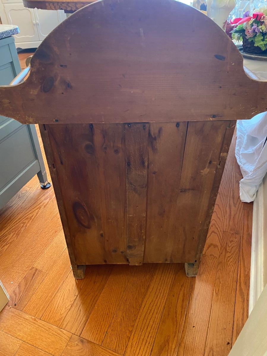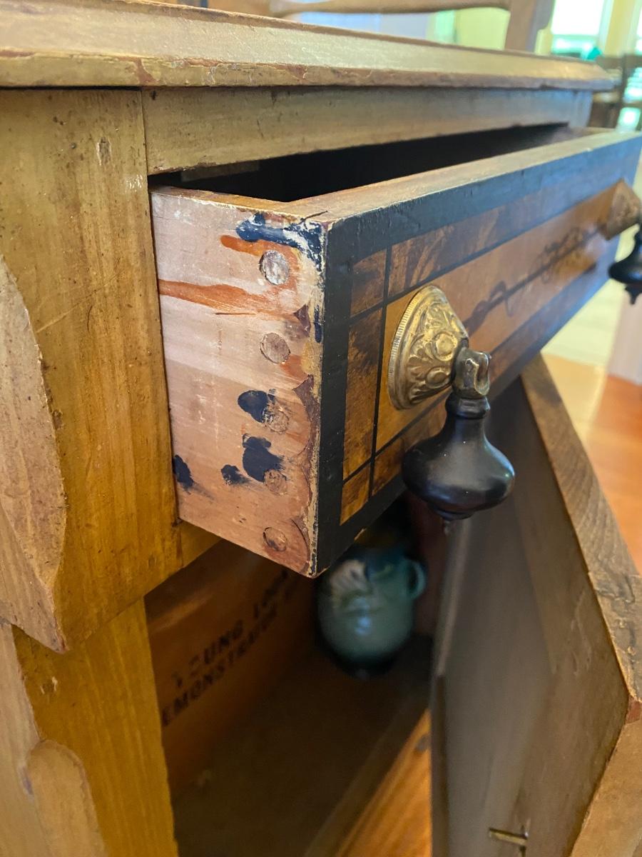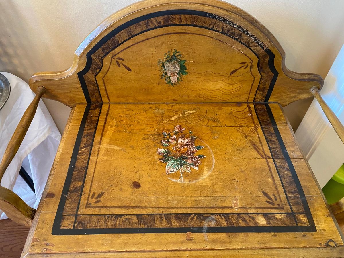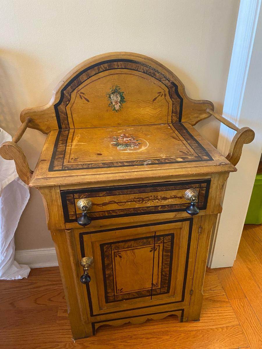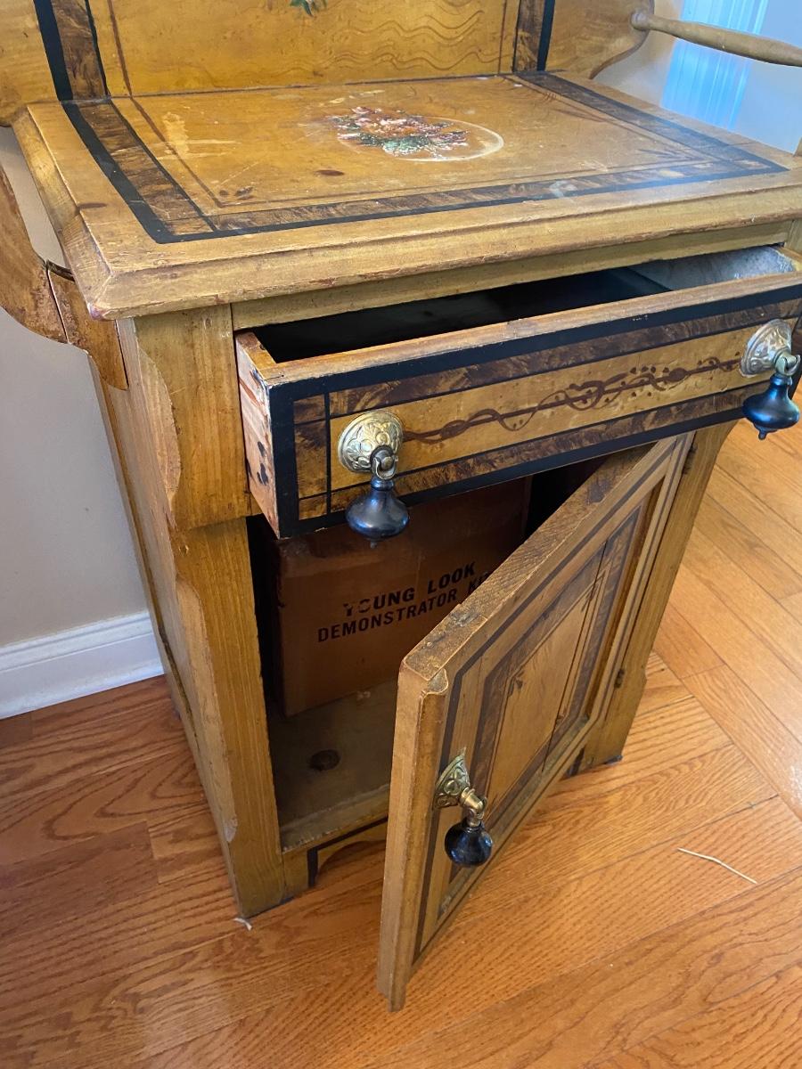 Antique Victorian washstand with two towel bars. Hand painted, very nice but the top needs some TLC. One drawer & 1 door. 27-1/2w x 26d x 38h at back.