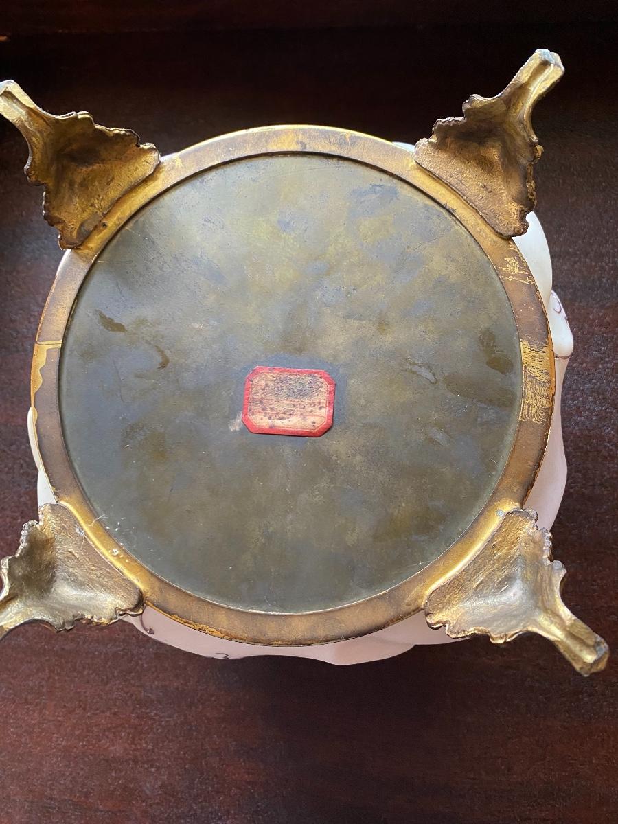 Antique Victorian Wave Crest swirled satin milk glass hand painted footed dresser box. The sticker on the bottom is illegible, but I believe it is C F Monroe. This beautiful Wavecrest dresser box has a satin cream and soft pink background, handpainted with blue flowers and gold embellishments, on gold feet. It has been repaired, as noted in photos, but is still beautiful. 6” x 6” x 6 1/2”H.