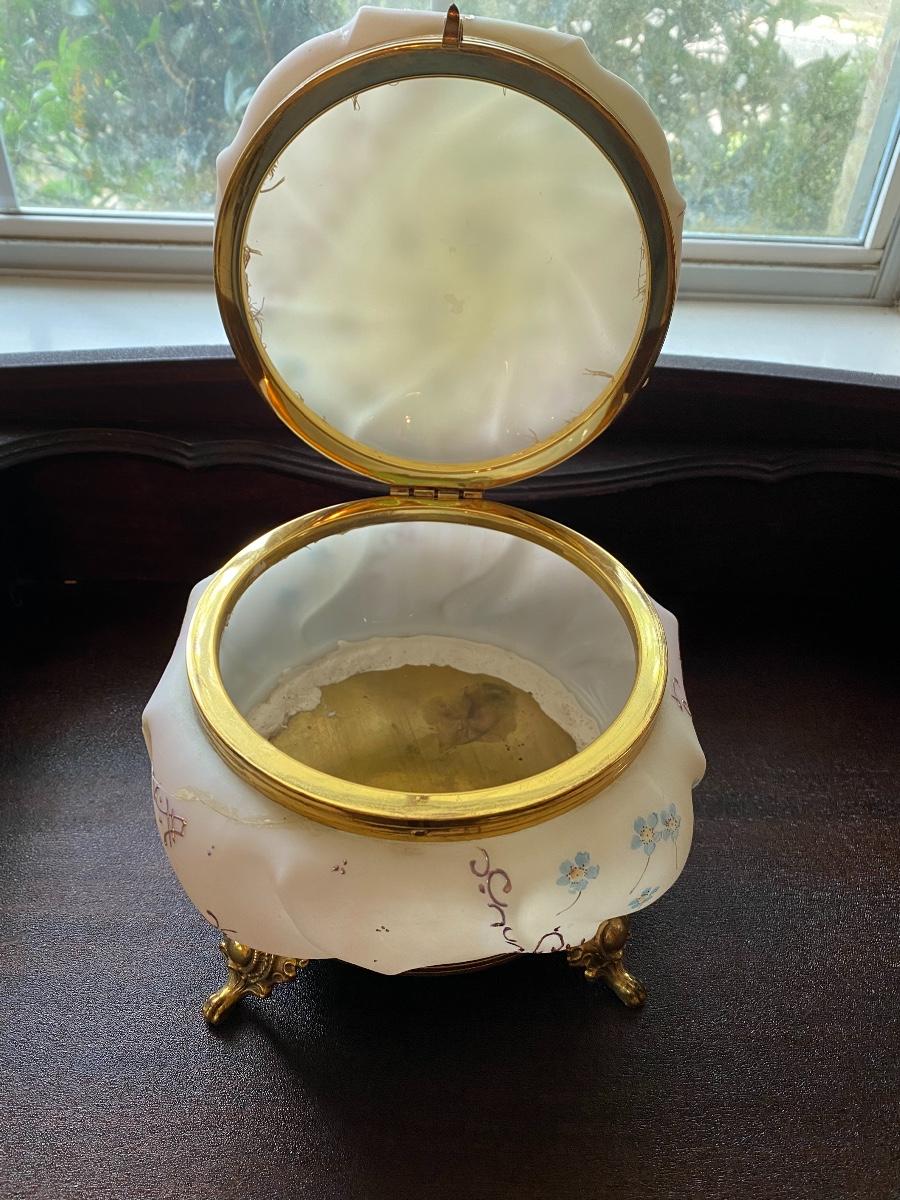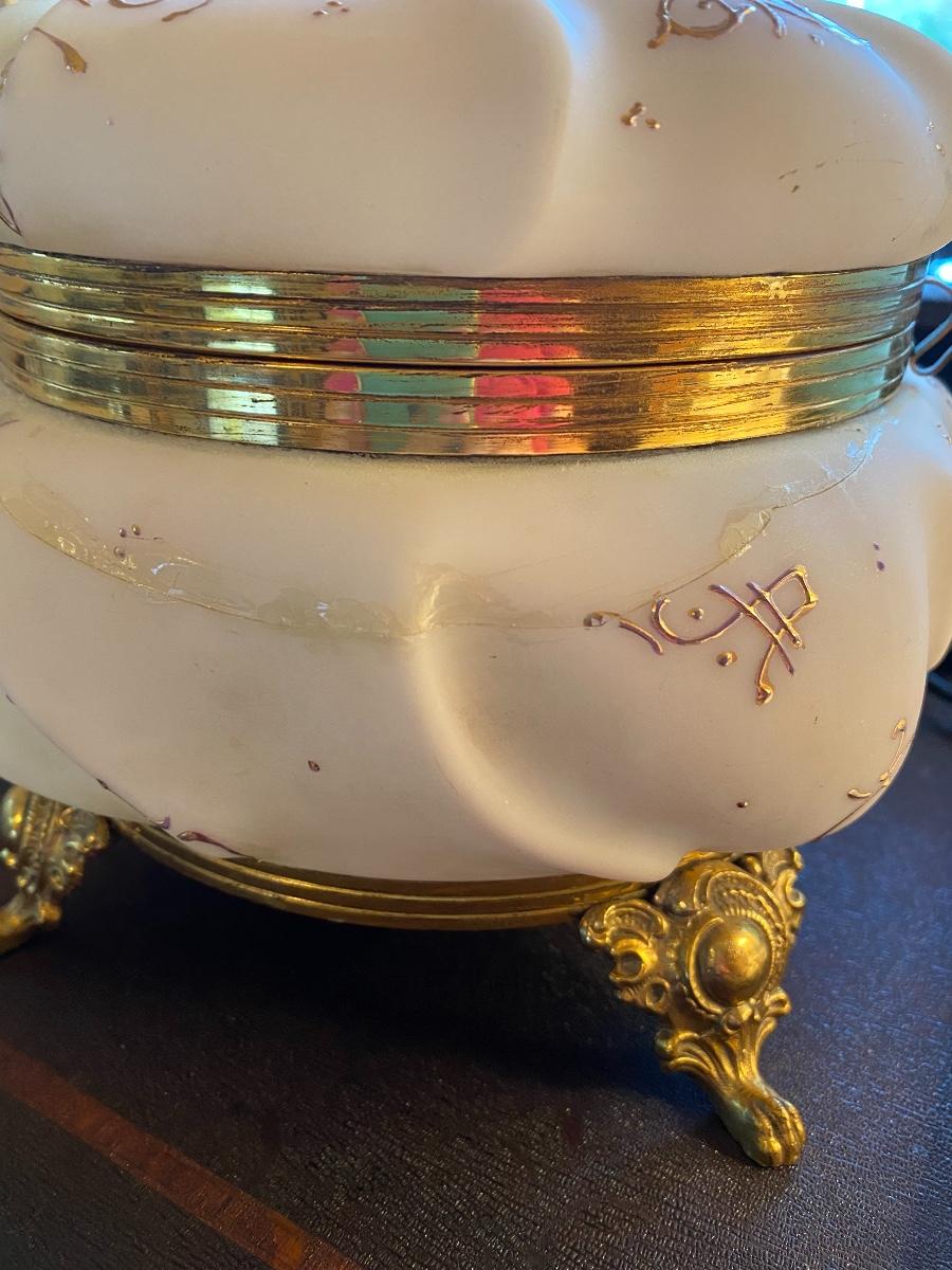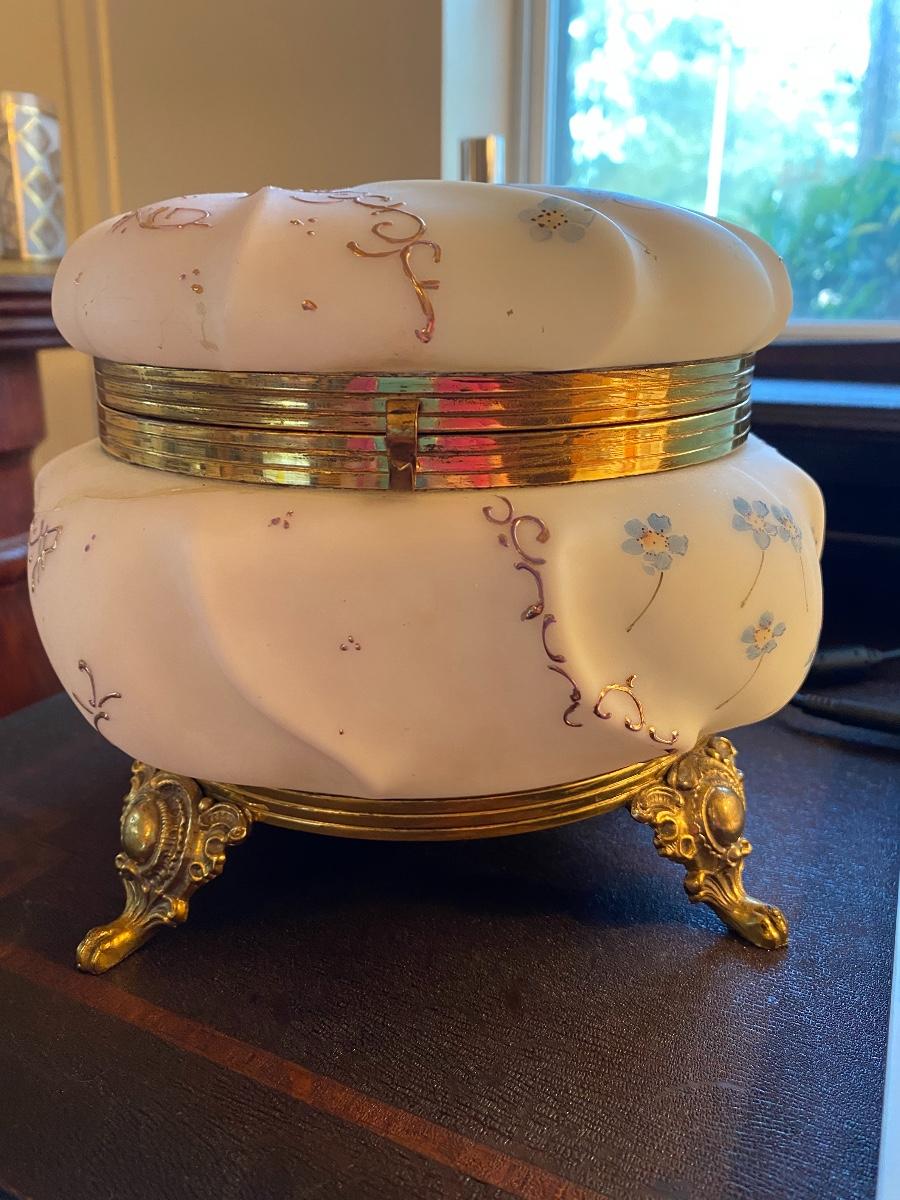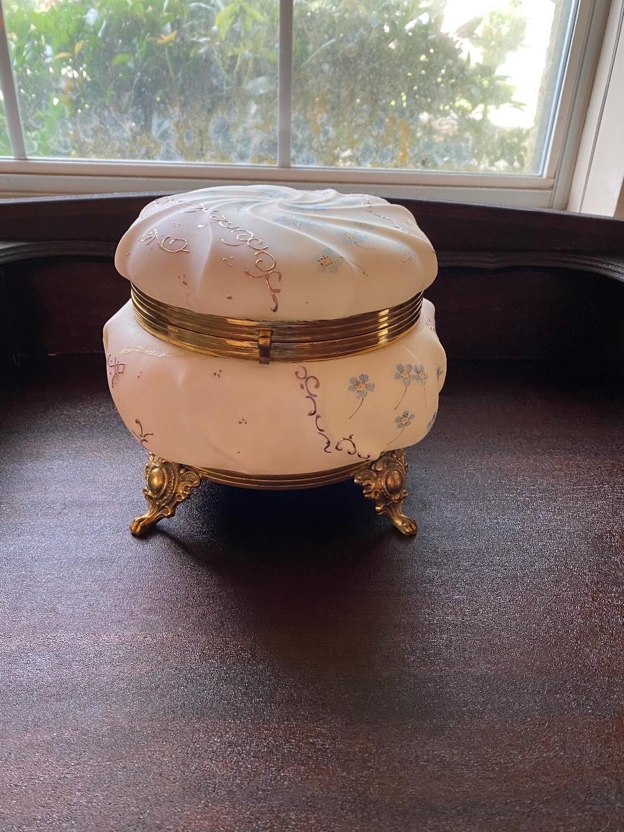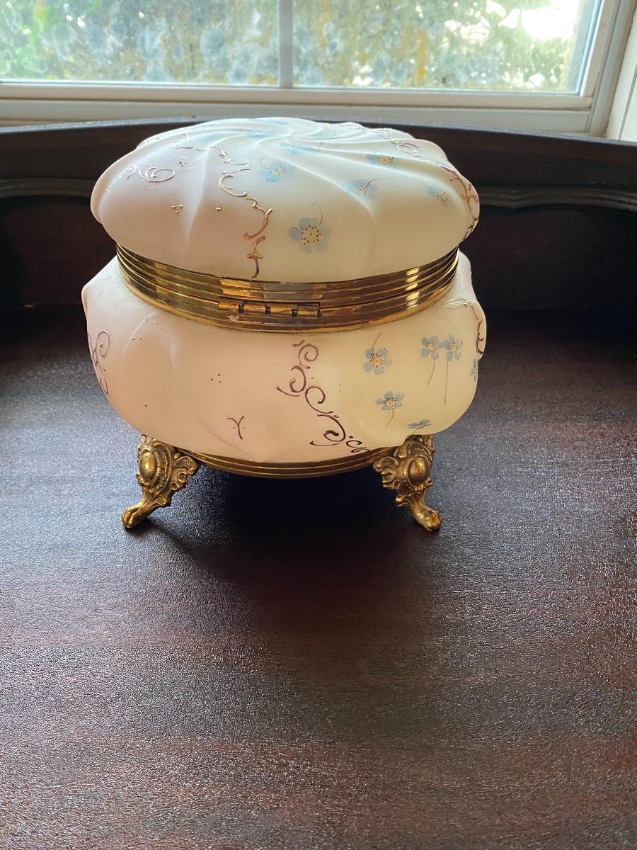 Antique Victorian Wave Crest swirled satin milk glass hand painted footed dresser box