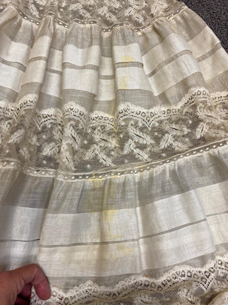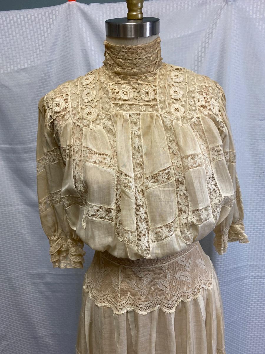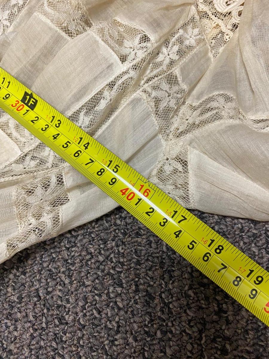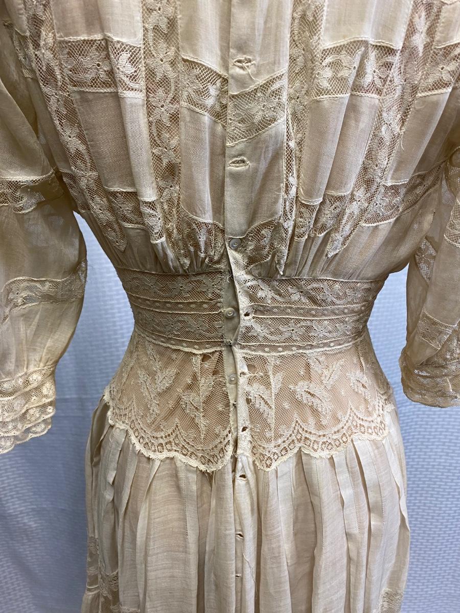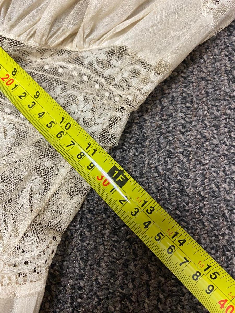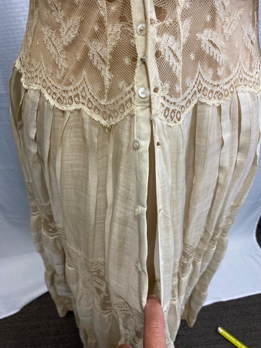 Antique Victorian White Cotton Lace Gison Girl Tea Dress Romantic Boho. Beautiful cotton and lace dress. Some discolor from age but no holes noticed. Buttons all the way down the back. Fabric is delicate and should be handled with care. Very fitted waist, hard to button fully on size 8 mannequin. Measurements in photos.