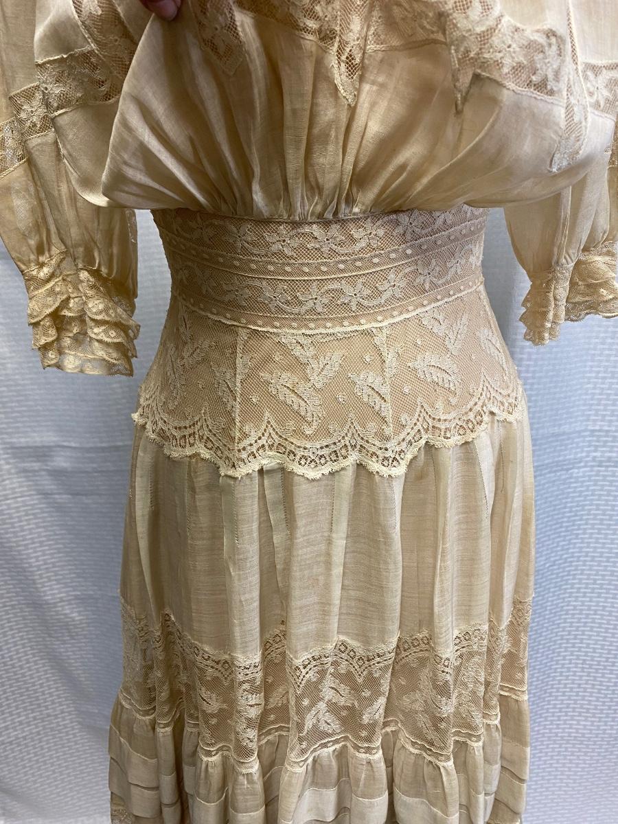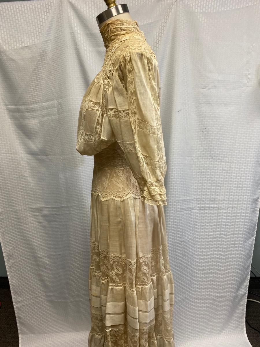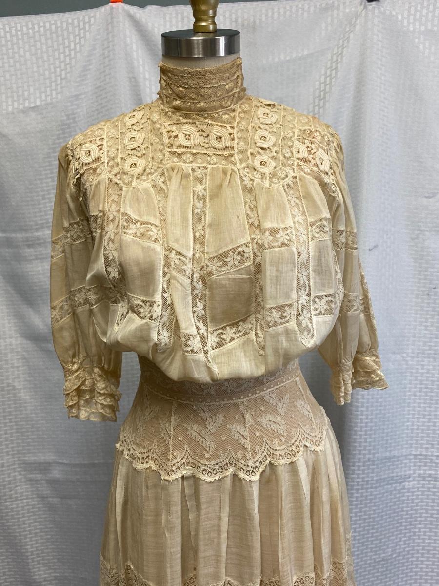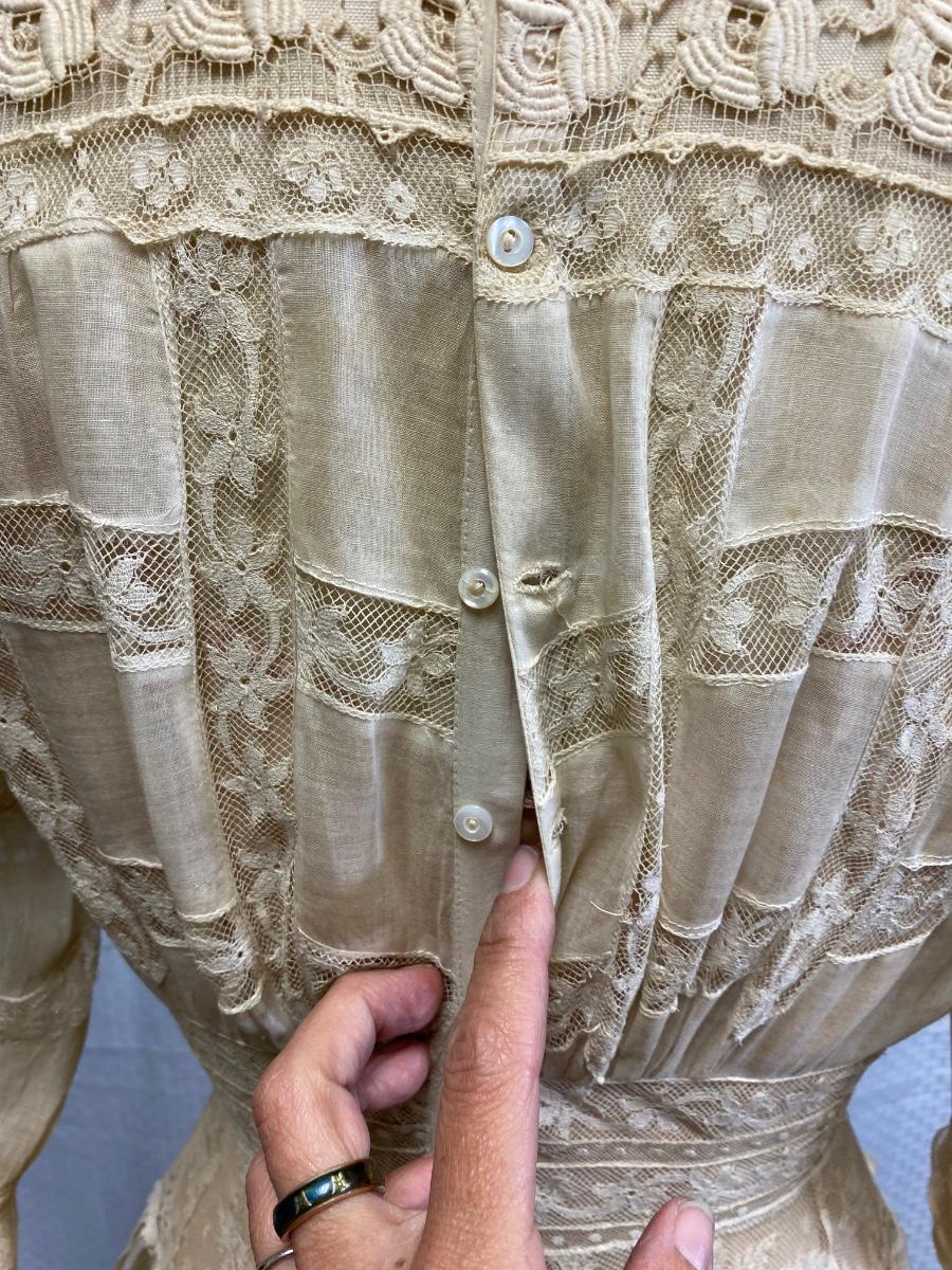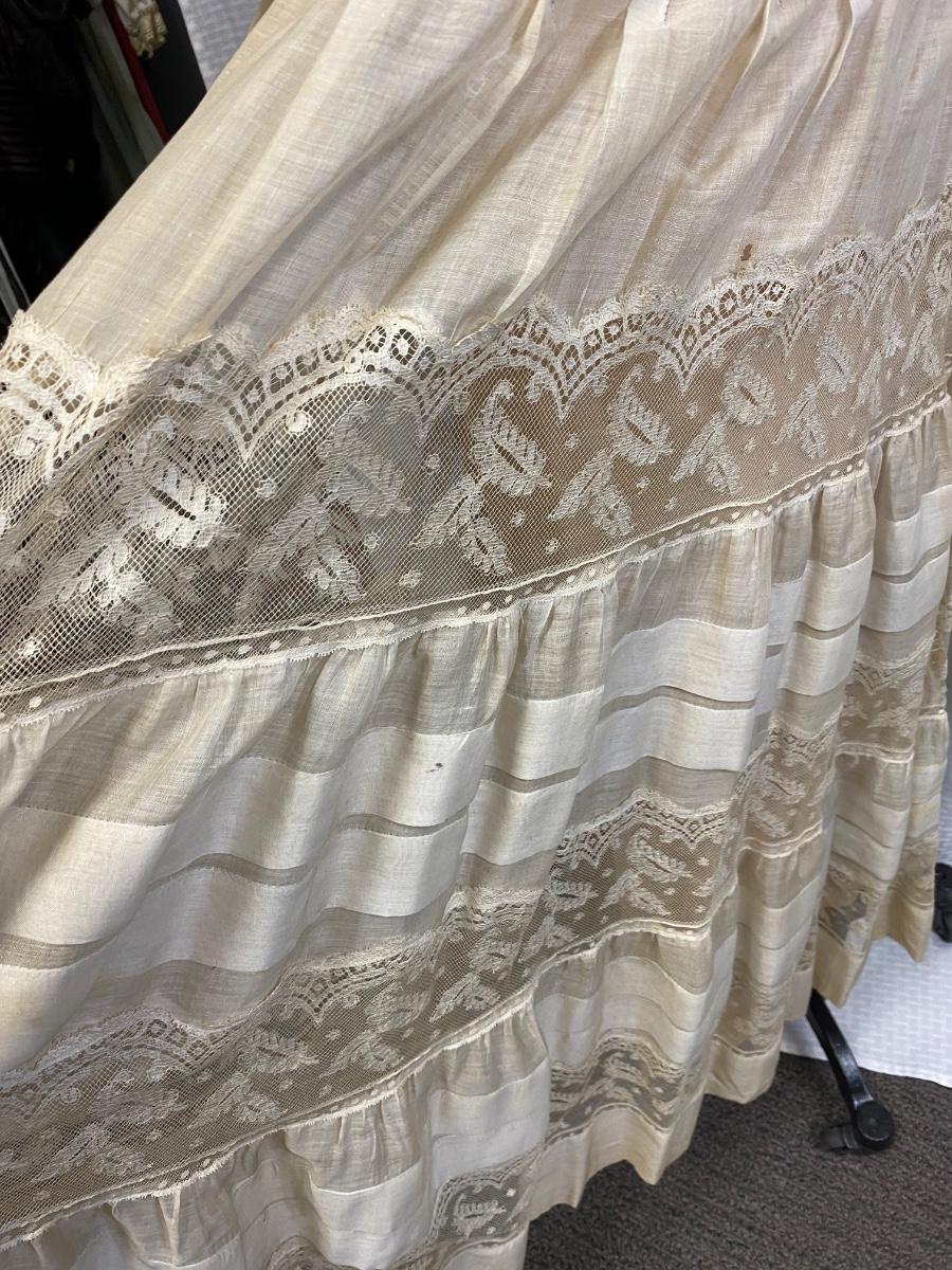 Antique Victorian White Cotton Lace Gison Girl Tea Dress Romantic Boho. Beautiful cotton and lace dress. Some discolor from age but no holes noticed. Buttons all the way down the back. Fabric is delicate and should be handled with care. Very fitted waist, hard to button fully on size 8 mannequin. Measurements in photos.