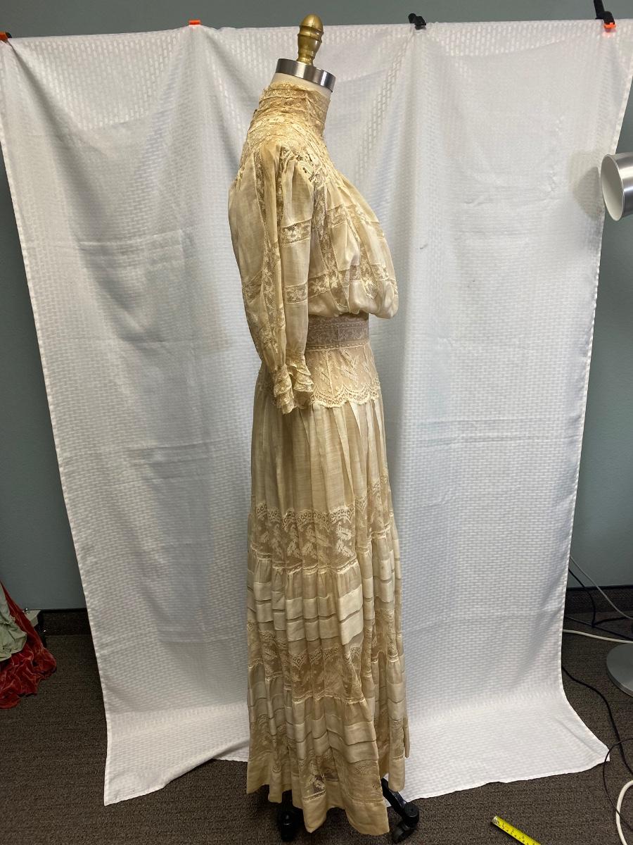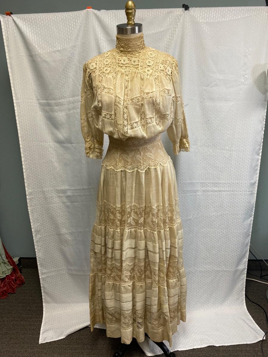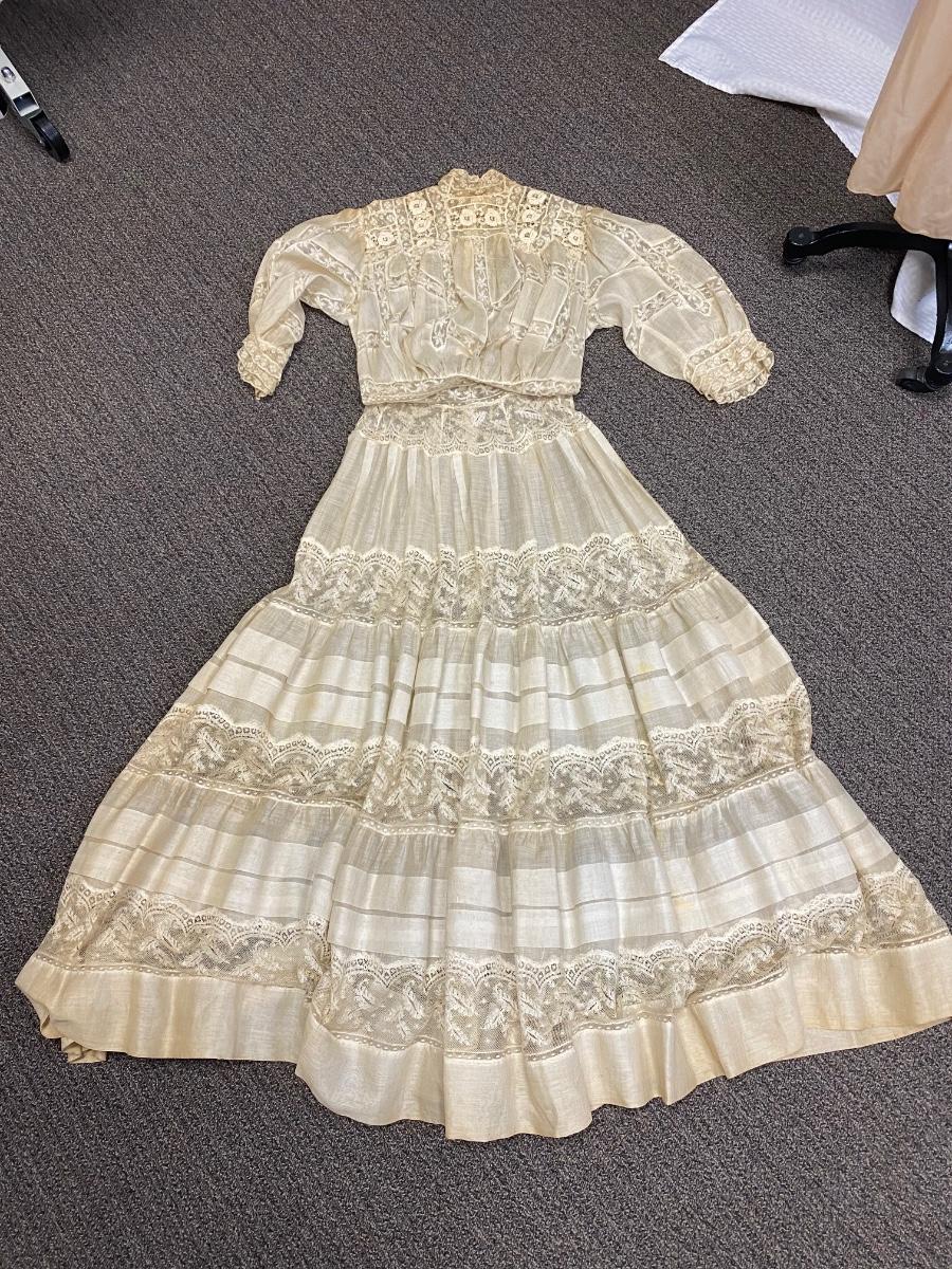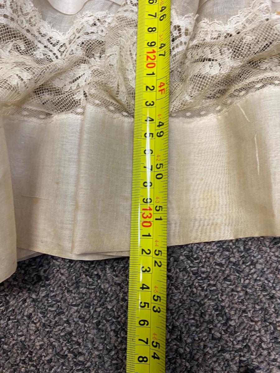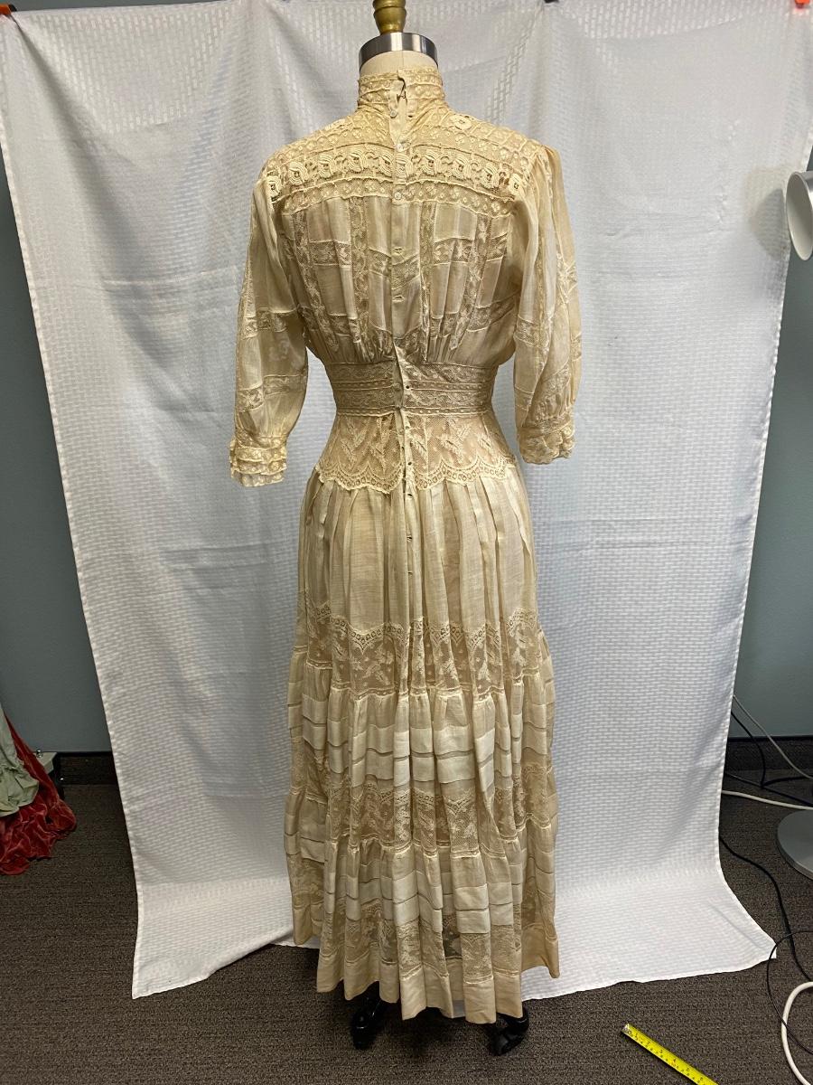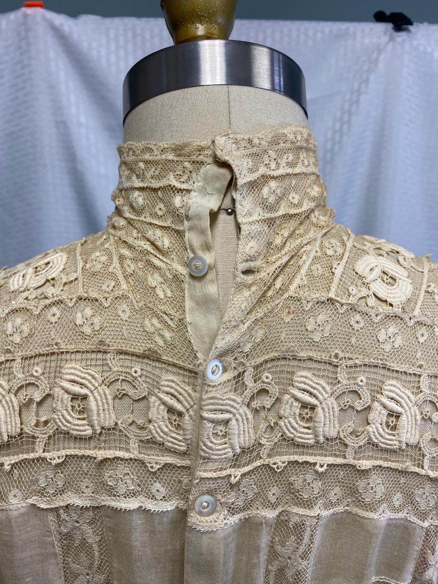 Antique Victorian White Cotton Lace Gison Girl Tea Dress Romantic Boho. Beautiful cotton and lace dress. Some discolor from age but no holes noticed. Buttons all the way down the back. Fabric is delicate and should be handled with care. Very fitted waist, hard to button fully on size 8 mannequin. Measurements in photos.
